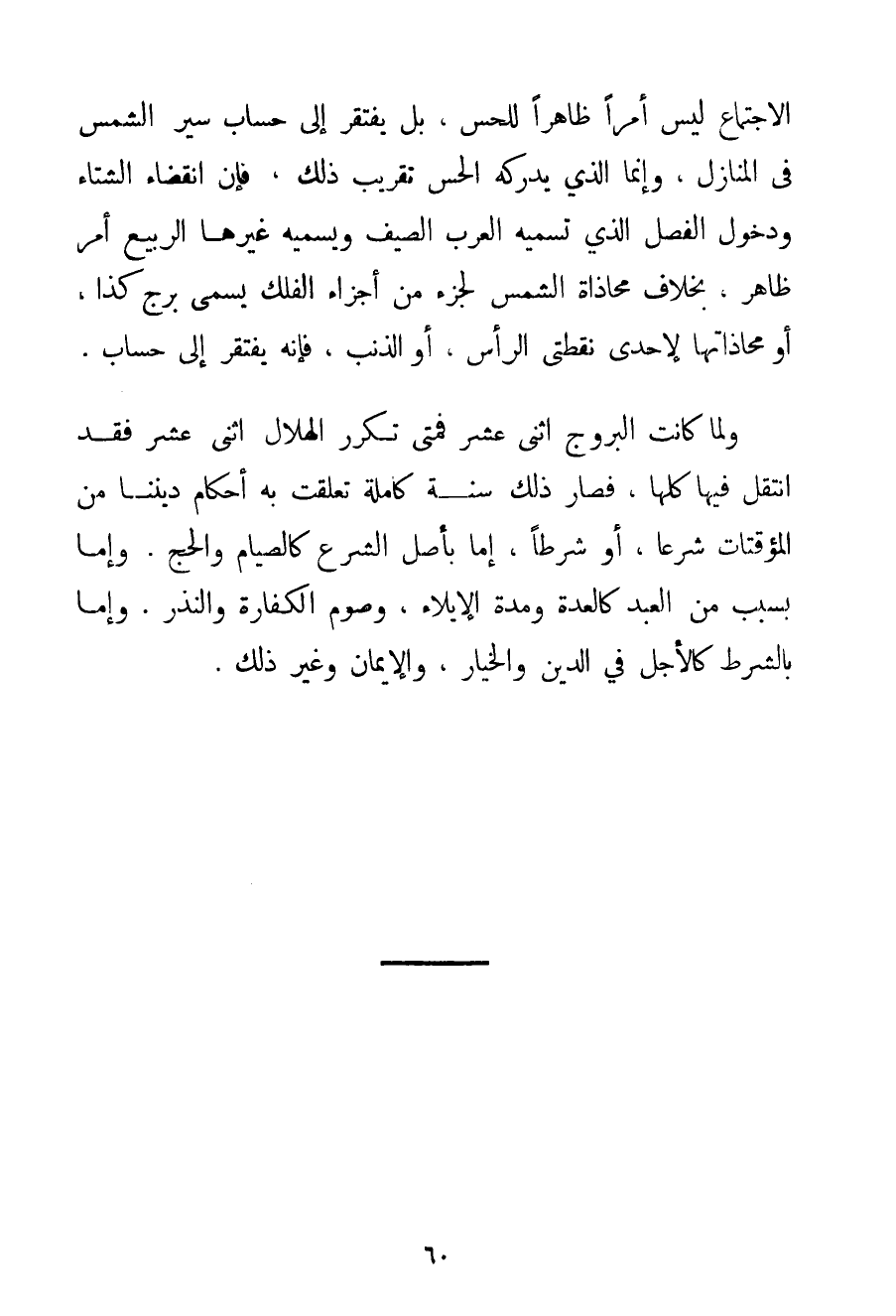 الِاجْتِمَاعِ لَيْسَ أَمْرًا ظَاهِرًا لِلْحِسِّ بَلْ يَفْتَقِرُ إلَى حِسَابِ سَيْرِ الشَّمْسِ فِي الْمَنَازِلِ وَإِنَّمَا الَّذِي يُدْرِكُهُ الْحِسُّ تَقْرِيبُ ذَلِكَ فَإِنَّ انْقِضَاءَ الشِّتَاءِ وَدُخُولَ الْفَصْلِ الَّذِي تُسَمِّيهِ الْعَرَبُ الصَّيْفَ وَيُسَمِّيهِ غَيْرُهَا الرَّبِيعُ أَمْرٌ ظَاهِرٌ بِخِلَافِ مُحَاذَاةِ الشَّمْسِ لِجُزْءِ مِنْ أَجْزَاءِ الْفَلَكِ يُسَمَّى بُرْجَ كَذَا أَوْ مُحَاذَاتِهَا لِإِحْدَى نُقْطَتَيْ الرَّأْسِ أَوْ الذَّنَبِ فَإِنَّهُ يَفْتَقِرُ إلَى حِسَابٍ. وَلَمَّا كَانَتْ الْبُرُوجُ اثْنَيْ عَشَرَ فَمَتَى تَكَرَّرَ الْهِلَالِيُّ اثْنَيْ عَشَرَ فَقَدْ انْتَقَلَ فِيهَا كُلِّهَا فَصَارَ ذَلِكَ سَنَةً كَامِلَةً تَعَلَّقَتْ بِهِ أَحْكَامُ دِينِنَا مِنْ الْمُؤَقَّتَاتِ شَرْعًا أَوْ شَرْطًا إمَّا بِأَصْلِ الشَّرْعِ كَالصِّيَامِ وَالْحَجِّ. وَإِمَّا بِسَبَبِ مِنْ الْعَبْدِ كَالْعِدَّةِ وَمُدَّةِ الْإِيلَاءِ وَصَوْمِ الْكَفَّارَةِ وَالنَّذْرِ. وَإِمَّا بِالشَّرْطِ كَالْأَجَلِ فِي الدَّيْنِ وَالْخِيَارِ وَالْأَيْمَانِ وَغَيْرِ ذَلِكَ.