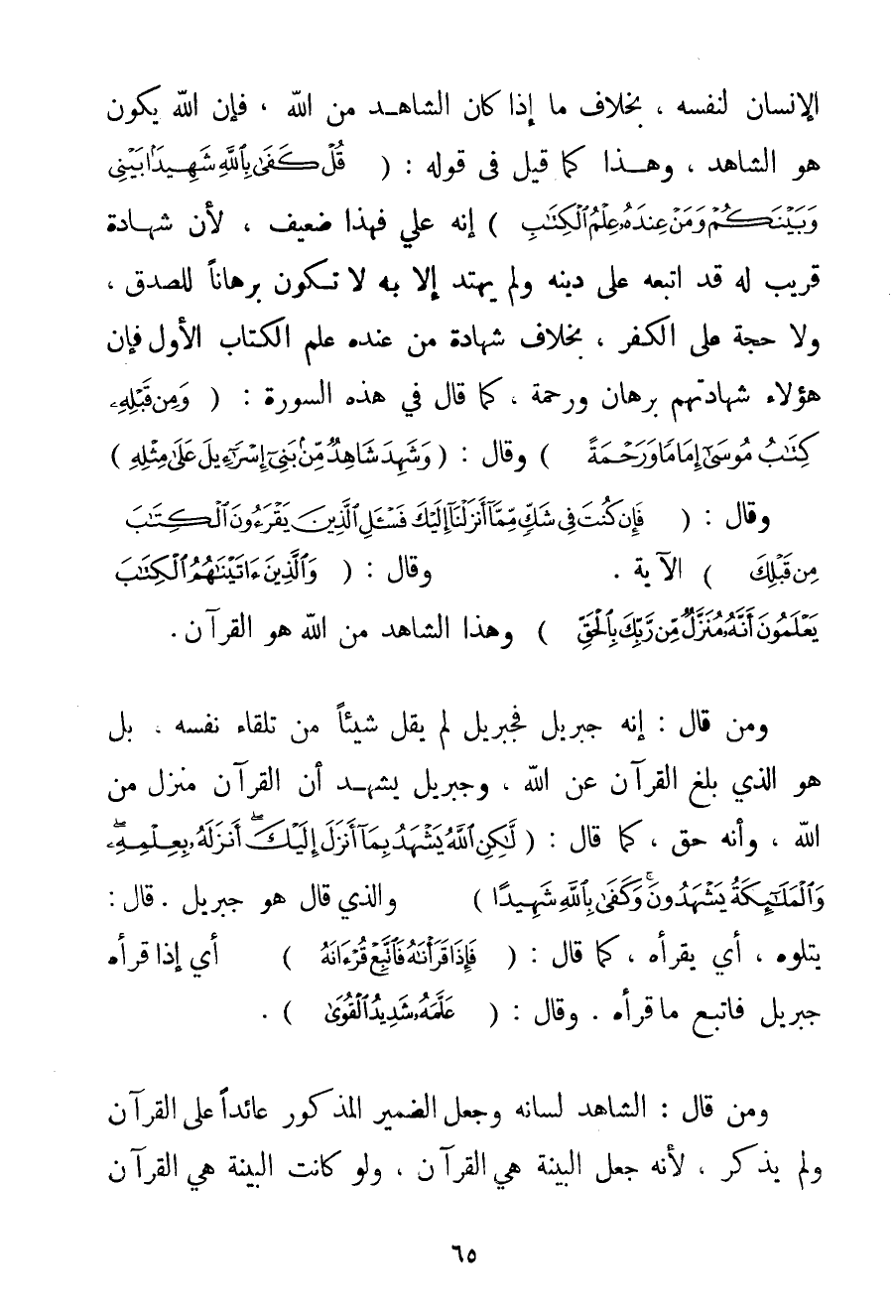 الْإِنْسَانِ لِنَفْسِهِ بِخِلَافِ مَا إذَا كَانَ الشَّاهِدُ مِنْ اللَّهِ فَإِنَّ اللَّهَ يَكُونُ هُوَ الشَّاهِدُ وَهَذَا كَمَا قِيلَ فِي قَوْلِهِ: {قُلْ كَفَى بِاللَّهِ شَهِيدًا بَيْنِي وَبَيْنَكُمْ وَمَنْ عِنْدَهُ عِلْمُ الْكِتَابِ} إنَّهُ عَلِيٌّ فَهَذَا ضَعِيفٌ لِأَنَّ شَهَادَةَ قَرِيبٍ لَهُ قَدْ اتَّبَعَهُ عَلَى دِينِهِ وَلَمْ يَهْتَدِ إلَّا بِهِ لَا تَكُونُ بُرْهَانًا لِلصِّدْقِ وَلَا حُجَّةً عَلَى الْكُفْرِ بِخِلَافِ شَهَادَةِ مَنْ عِنْدَهُ عِلْمُ الْكِتَابِ الْأَوَّلِ فَإِنَّ هَؤُلَاءِ شَهَادَتُهُمْ بُرْهَانٌ وَرَحْمَةٌ كَمَا قَالَ فِي هَذِهِ السُّورَةِ: {وَمِنْ قَبْلِهِ كِتَابُ مُوسَى إمَامًا وَرَحْمَةً} وَقَالَ: {وَشَهِدَ شَاهِدٌ مِنْ بَنِي إسْرَائِيلَ عَلَى مِثْلِهِ} وَقَالَ: {فَإِنْ كُنْتَ فِي شَكٍّ مِمَّا أَنْزَلْنَا إلَيْكَ فَاسْأَلِ الَّذِينَ يَقْرَءُونَ الْكِتَابَ مِنْ قَبْلِكَ} الْآيَةُ. وَقَالَ: {وَالَّذِينَ آتَيْنَاهُمُ الْكِتَابَ يَعْلَمُونَ أَنَّهُ مُنَزَّلٌ مِنْ رَبِّكَ بِالْحَقِّ} وَهَذَا الشَّاهِدُ مِنْ اللَّهِ هُوَ الْقُرْآنُ. وَمَنْ قَالَ: إنَّهُ جِبْرِيلُ فَجِبْرِيلُ لَمْ يَقُلْ شَيْئًا مِنْ تِلْقَاءِ نَفْسِهِ بَلْ هُوَ الَّذِي بَلَّغَ الْقُرْآنَ عَنْ اللَّهِ وَجِبْرِيلُ يَشْهَدُ أَنَّ الْقُرْآنَ مُنَزَّلٌ مِنْ اللَّهِ وَأَنَّهُ حَقٌّ كَمَا قَالَ: {لَكِنِ اللَّهُ يَشْهَدُ بِمَا أَنْزَلَ إلَيْكَ أَنْزَلَهُ بِعِلْمِهِ وَالْمَلَائِكَةُ يَشْهَدُونَ وَكَفَى بِاللَّهِ شَهِيدًا} وَاَلَّذِي قَالَ هُوَ جِبْرِيلُ. قَالَ: يَتْلُوهُ أَيْ يَقْرَؤُهُ كَمَا قَالَ: {فَإِذَا قَرَأْنَاهُ فَاتَّبِعْ قُرْآنَهُ} أَيْ إذَا قَرَأَهُ جِبْرِيلُ فَاتَّبِعْ مَا قَرَأَهُ. وَقَالَ: {عَلَّمَهُ شَدِيدُ الْقُوَى} . وَمَنْ قَالَ: الشَّاهِدُ لِسَانُهُ وَجَعَلَ الضَّمِيرَ الْمَذْكُورَ عَائِدًا عَلَى الْقُرْآنِ وَلَمْ يَذْكُرْ لِأَنَّهُ جَعَلَ الْبَيِّنَةَ هِيَ الْقُرْآنُ وَلَوْ كَانَتْ الْبَيِّنَةُ هِيَ الْقُرْآنُ