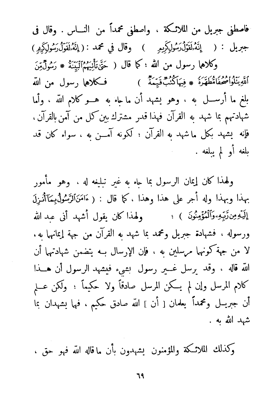 فَاصْطَفَى جِبْرِيلَ مِنْ الْمَلَائِكَةِ وَاصْطَفَى مُحَمَّدًا مِنْ النَّاسِ. وَقَالَ فِي جِبْرِيلَ: {إنَّهُ لَقَوْلُ رَسُولٍ كَرِيمٍ} وَقَالَ فِي مُحَمَّدٍ: {إنَّهُ لَقَوْلُ رَسُولٍ كَرِيمٍ} وَكِلَاهُمَا رَسُولٌ مِنْ اللَّهِ؛ كَمَا قَالَ {حَتَّى تَأْتِيَهُمُ الْبَيِّنَةُ} {رَسُولٌ مِنَ اللَّهِ يَتْلُو صُحُفًا مُطَهَّرَةً} {فِيهَا كُتُبٌ قَيِّمَةٌ} فَكِلَاهُمَا رَسُولٌ مِنْ اللَّهِ بَلَّغَ مَا أُرْسِلَ بِهِ وَهُوَ يَشْهَدُ أَنَّ مَا جَاءَ بِهِ هُوَ كَلَامُ اللَّهِ وَأَمَّا شَهَادَتُهُمْ بِمَا شَهِدَ بِهِ الْقُرْآنُ فَهَذَا قَدْرٌ مُشْتَرَكٌ بَيْنَ كُلِّ مَنْ آمَنَ بِالْقُرْآنِ فَإِنَّهُ يَشْهَدُ بِكُلِّ مَا شَهِدَ بِهِ الْقُرْآنُ؛ لِكَوْنِهِ آمَنَ بِهِ سَوَاءٌ كَانَ قَدْ بَلَّغَهُ أَوْ لَمْ يُبَلِّغْهُ. وَلِهَذَا كَانَ إيمَانُ الرَّسُولِ بِمَا جَاءَ بِهِ غَيْرَ تَبْلِيغِهِ لَهُ وَهُوَ مَأْمُورٌ بِهَذَا وَبِهَذَا وَلَهُ أَجْرٌ عَلَى هَذَا وَهَذَا كَمَا قَالَ: {آمَنَ الرَّسُولُ بِمَا أُنْزِلَ إلَيْهِ مِنْ رَبِّهِ وَالْمُؤْمِنُونَ} وَلِهَذَا كَانَ يَقُولُ أَشْهَدُ أَنِّي عَبْدُ اللَّهِ وَرَسُولُهُ فَشَهَادَةُ جِبْرِيلَ وَمُحَمَّدٍ بِمَا شَهِدَ بِهِ الْقُرْآنُ مِنْ جِهَةِ إيمَانِهِمَا بِهِ لَا مِنْ جِهَةِ كَوْنِهِمَا مُرْسَلَيْنِ بِهِ فَإِنَّ الْإِرْسَالَ بِهِ يَتَضَمَّنُ شَهَادَتَهُمَا أَنَّ اللَّهَ قَالَهُ وَقَدْ يُرْسِلُ غَيْرَ رَسُولٍ بِشَيْءِ فَيَشْهَدُ الرَّسُولُ أَنَّ هَذَا كَلَامُ الْمُرْسِلِ وَإِنْ لَمْ يَكُنْ الْمُرْسَل صَادِقًا وَلَا حَكِيمًا؛ وَلَكِنْ عُلِمَ أَنَّ جِبْرِيلَ وَمُحَمَّدًا يَعْلَمَانِ أَنَّ اللَّهَ صَادِقٌ حَكِيمٌ فَهُمَا يَشْهَدَانِ بِمَا شَهِدَ اللَّهُ بِهِ. وَكَذَلِكَ الْمَلَائِكَةُ وَالْمُؤْمِنُونَ يَشْهَدُونَ بِأَنَّ مَا قَالَهُ اللَّهُ فَهُوَ حَقٌّ