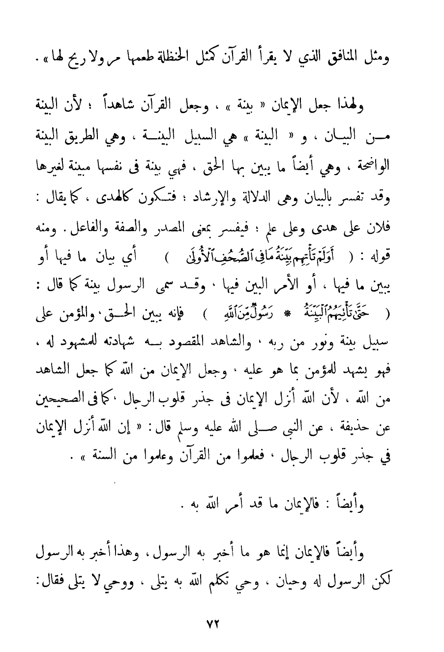 وَمِنْهُ قَوْلُهُ: {أَوَلَمْ تَأْتِهِمْ بَيِّنَةُ مَا فِي الصُّحُفِ الْأُولَى} أَيْ بَيَانُ مَا فِيهَا أَوْ يُبَيِّنُ مَا فِيهَا أَوْ الْأَمْرُ الْبَيِّنُ فِيهَا وَقَدْ سَمَّى الرَّسُولَ بَيِّنَةً كَمَا قَالَ: {حَتَّى تَأْتِيَهُمُ الْبَيِّنَةُ} {رَسُولٌ مِنَ اللَّهِ} فَإِنَّهُ يُبَيِّنُ الْحَقَّ وَالْمُؤْمِنُ عَلَى سَبِيلٍ بَيِّنَةٍ وَنُورٍ مِنْ رَبِّهِ وَالشَّاهِدُ الْمَقْصُودُ بِهِ شَهَادَتُهُ لِلْمَشْهُودِ لَهُ فَهُوَ يَشْهَدُ لِلْمُؤْمِنِ بِمَا هُوَ عَلَيْهِ وَجُعِلَ الْإِيمَانُ مِنْ اللَّهِ كَمَا جُعِلَ الشَّاهِدُ مِنْ اللَّهِ لِأَنَّ اللَّهَ أَنْزَلَ الْإِيمَانَ فِي جَذْرِ قُلُوبِ الرِّجَالِ كَمَا فِي الصَّحِيحَيْنِ عَنْ حُذَيْفَةَ عَنْ النَّبِيِّ صَلَّى اللَّهُ عَلَيْهِ وَسَلَّمَ قَالَ: " {إنَّ اللَّهَ أَنْزَلَ الْإِيمَانَ فِي جَذْرِ قُلُوبِ الرِّجَالِ فَعَلِمُوا مِنْ الْقُرْآنِ وَعَلِمُوا مِنْ السُّنَّةِ} ". وَأَيْضًا: فَالْإِيمَانُ مَا قَدْ أَمَرَ اللَّهُ بِهِ. وَأَيْضًا فَالْإِيمَانُ إنَّمَا هُوَ مَا أَخْبَرَ بِهِ الرَّسُولُ وَهَذَا أَخْبَرَ بِهِ الرَّسُولُ لَكِنَّ الرَّسُولَ لَهُ وَحْيَانِ وَحْيٌ تَكَلَّمَ اللَّهُ بِهِ يُتْلَى وَوَحْيٌ لَا يُتْلَى فَقَالَ: