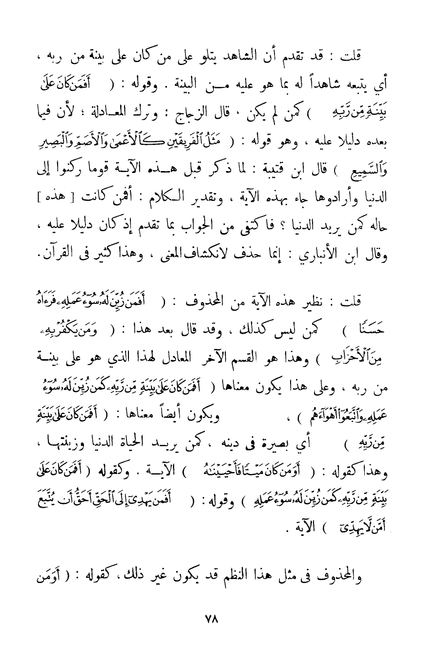 وَقَوْلُهُ: {أَفَمَنْ كَانَ عَلَى بَيِّنَةٍ مِنْ رَبِّهِ} كَمَنْ لَمْ يَكُنْ قَالَ الزَّجَّاجُ: وَتَرَكَ الْمُعَادَلَةَ؛ لِأَنَّ فِيمَا بَعْدَهُ دَلِيلًا عَلَيْهِ وَهُوَ قَوْلُهُ: {مَثَلُ الْفَرِيقَيْنِ كَالْأَعْمَى وَالْأَصَمِّ وَالْبَصِيرِ وَالسَّمِيعِ} قَالَ ابْنُ قُتَيْبَةَ: لَمَّا ذَكَرَ قَبْلَ هَذِهِ الْآيَةِ قَوْمًا رَكَنُوا إلَى الدُّنْيَا وَأَرَادُوهَا جَاءَ بِهَذِهِ الْآيَةِ وَتَقْدِيرُ الْكَلَامِ: أَفَمَنْ كَانَتْ هَذِهِ حَالُهُ كَمَنْ يُرِيدُ الدُّنْيَا؟ فَاكْتَفَى مِنْ الْجَوَابِ بِمَا تَقَدَّمَ إذْ كَانَ دَلِيلًا عَلَيْهِ وَقَالَ ابْنُ الْأَنْبَارِيِّ: إنَّمَا حُذِفَ لِانْكِشَافِ الْمَعْنَى وَهَذَا كَثِيرٌ فِي الْقُرْآنِ. قُلْت: نَظِيرُ هَذِهِ الْآيَةِ مِنْ الْمَحْذُوفِ: {أَفَمَنْ زُيِّنَ لَهُ سُوءُ عَمَلِهِ فَرَآهُ حَسَنًا} كَمَنْ لَيْسَ كَذَلِكَ وَقَدْ قَالَ بَعْدَ هَذَا: {وَمَنْ يَكْفُرْ بِهِ مِنَ الْأَحْزَابِ} وَهَذَا هُوَ الْقِسْمُ الْآخَرُ الْمُعَادِلُ لِهَذَا الَّذِي هُوَ عَلَى بَيِّنَةٍ مِنْ رَبِّهِ وَعَلَى هَذَا يَكُونُ مَعْنَاهَا {أَفَمَنْ كَانَ عَلَى بَيِّنَةٍ مِنْ رَبِّهِ كَمَنْ زُيِّنَ لَهُ سُوءُ عَمَلِهِ وَاتَّبَعُوا أَهْوَاءَهُمْ} وَيَكُونُ أَيْضًا مَعْنَاهَا: {أَفَمَنْ كَانَ عَلَى بَيِّنَةٍ مِنْ رَبِّهِ} أَيْ بَصِيرَةٍ فِي دِينِهِ كَمَنْ يُرِيدُ الْحَيَاةَ الدُّنْيَا وَزِينَتَهَا وَهَذَا كَقَوْلِهِ: {أَوَمَنْ كَانَ مَيْتًا فَأَحْيَيْنَاهُ} الْآيَةُ. وَكَقَوْلِهِ {أَفَمَنْ كَانَ عَلَى بَيِّنَةٍ مِنْ رَبِّهِ كَمَنْ زُيِّنَ لَهُ سُوءُ عَمَلِهِ} وَقَوْلِهِ: {أَفَمَنْ يَهْدِي إلَى الْحَقِّ أَحَقُّ أَنْ يُتَّبَعَ أَمَّنْ لَا يَهِدِّي} الْآيَةُ. وَالْمَحْذُوفُ فِي مِثْلِ هَذَا النَّظْمِ قَدْ يَكُونُ غَيْرَ ذَلِكَ كَقَوْلِهِ: {أَوَمَنْ
