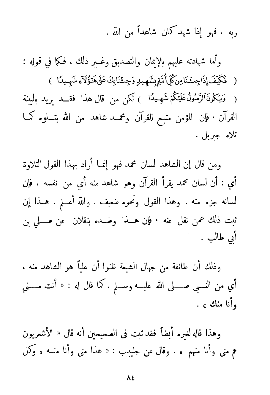 وَأَمَّا شَهَادَتُهُ عَلَيْهِمْ بِالْإِيمَانِ وَالتَّصْدِيقِ وَغَيْرِ ذَلِكَ فَكَمَا فِي قَوْلِهِ: {فَكَيْفَ إذَا جِئْنَا مِنْ كُلِّ أُمَّةٍ بِشَهِيدٍ وَجِئْنَا بِكَ عَلَى هَؤُلَاءِ شَهِيدًا} {وَيَكُونَ الرَّسُولُ عَلَيْكُمْ شَهِيدًا} لَكِنْ مَنْ قَالَ هَذَا فَقَدْ يُرِيدُ بِالْبَيِّنَةِ الْقُرْآنَ فَإِنَّ الْمُؤْمِنَ مُتَّبِعٌ لِلْقُرْآنِ وَمُحَمَّدٌ شَاهِدٌ مِنْ اللَّهِ يَتْلُوهُ كَمَا تَلَاهُ جِبْرِيلُ. وَمَنْ قَالَ إنَّ الشَّاهِدَ لِسَانُ مُحَمَّدٍ فَهُوَ إنَّمَا أَرَادَ بِهَذَا الْقَوْلِ التِّلَاوَةَ أَيْ: أَنَّ لِسَانَ مُحَمَّدٍ يَقْرَأُ الْقُرْآنَ وَهُوَ شَاهِدٌ مِنْهُ أَيْ مِنْ نَفْسِهِ فَإِنَّ لِسَانَهُ جُزْءٌ مِنْهُ وَهَذَا الْقَوْلُ وَنَحْوُهُ ضَعِيفٌ. وَاَللَّهُ أَعْلَمُ. هَذَا إنْ ثَبَتَ ذَلِكَ عَمَّنْ نُقِلَ عَنْهُ فَإِنَّ هَذَا وَضِدَّهُ يُنْقَلَانِ عَنْ عَلِيِّ بْنِ أَبِي طَالِبٍ. وَذَلِكَ أَنَّ طَائِفَةً مِنْ جُهَّالِ الشِّيعَةِ ظَنُّوا أَنَّ عَلِيًّا هُوَ الشَّاهِدُ مِنْهُ أَيْ مِنْ النَّبِيِّ صَلَّى اللَّهُ عَلَيْهِ وَسَلَّمَ كَمَا قَالَ لَهُ: " {أَنْتَ مِنِّي وَأَنَا مِنْك} ". وَهَذَا قَالَهُ لِغَيْرِهِ أَيْضًا فَقَدْ ثَبَتَ فِي الصَّحِيحَيْنِ أَنَّهُ قَالَ " {الْأَشْعَرِيُّونَ هُمْ مِنِّي وَأَنَا مِنْهُمْ} ". وَقَالَ عَنْ جليبيب: " {هَذَا مِنِّي وَأَنَا مِنْهُ} "