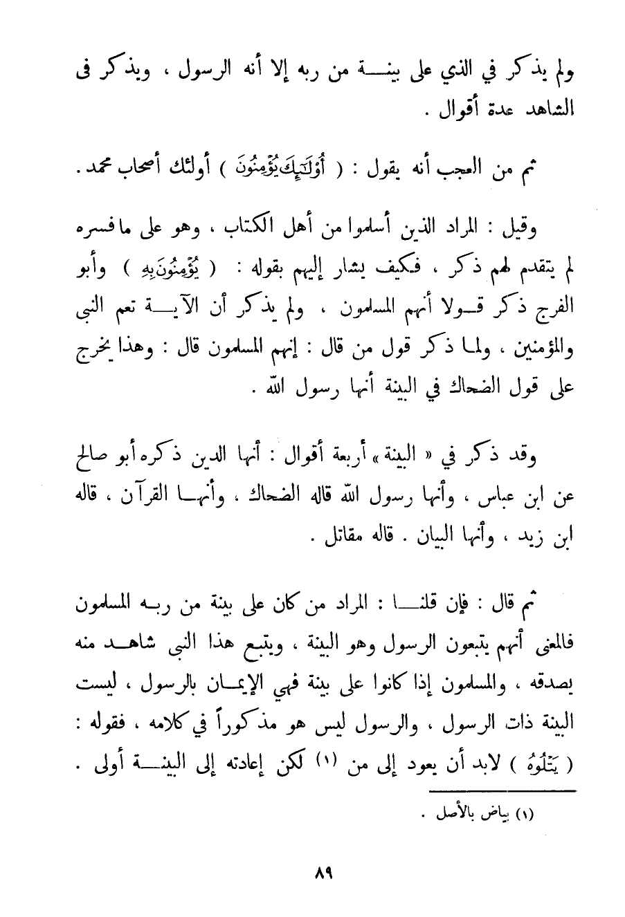 وَلَمْ يَذْكُرْ فِي الَّذِي عَلَى بَيِّنَةٍ مِنْ رَبِّهِ إلَّا أَنَّهُ الرَّسُولُ وَيَذْكُرُ فِي الشَّاهِدِ عِدَّةَ أَقْوَالٍ. ثُمَّ مِنْ الْعَجَبِ أَنَّهُ يَقُولُ: {أُولَئِكَ يُؤْمِنُونَ} أُولَئِكَ أَصْحَابُ مُحَمَّدٍ. وَقِيلَ: الْمُرَادُ الَّذِينَ أَسْلَمُوا مِنْ أَهْلِ الْكِتَابِ وَهُوَ عَلَى مَا فَسَّرَهُ لَمْ يَتَقَدَّمْ لَهُمْ ذِكْرٌ فَكَيْفَ يُشَارُ إلَيْهِمْ بِقَوْلِهِ: {يُؤْمِنُونَ بِهِ} وَأَبُو الْفَرَجِ ذَكَرَ قَوْلًا أَنَّهُمْ الْمُسْلِمُونَ وَلَمْ يَذْكُرْ أَنَّ الْآيَةَ تَعُمُّ النَّبِيَّ وَالْمُؤْمِنِينَ وَلَمَّا ذَكَرَ قَوْلَ مَنْ قَالَ: إنَّهُمْ الْمُسْلِمُونَ قَالَ: وَهَذَا يُخَرَّجُ عَلَى قَوْلِ الضِّحَاكِ فِي الْبَيِّنَةِ أَنَّهَا رَسُولُ اللَّهِ. وَقَدْ ذُكِرَ فِي " الْبَيِّنَةِ " أَرْبَعَةُ أَقْوَالٍ: أَنَّهَا الدِّينُ ذَكَرَهُ أَبُو صَالِحٍ عَنْ ابْنِ عَبَّاسٍ وَأَنَّهَا رَسُولُ اللَّهِ قَالَهُ الضَّحَّاكُ وَأَنَّهَا الْقُرْآنُ قَالَهُ ابْنُ زَيْدٍ وَأَنَّهَا الْبَيَانُ. قَالَهُ مُقَاتِلٌ. ثُمَّ قَالَ: فَإِنْ قُلْنَا: الْمُرَادُ مَنْ كَانَ عَلَى بَيِّنَةٍ مِنْ رَبِّهِ الْمُسْلِمُونَ فَالْمَعْنَى أَنَّهُمْ يَتَّبِعُونَ الرَّسُولَ وَهُوَ الْبَيِّنَةُ وَيَتَّبِعُ هَذَا النَّبِيَّ شَاهِدٌ مِنْهُ يُصَدِّقُهُ وَالْمُسْلِمُونَ إذَا كَانُوا عَلَى بَيِّنَةٍ فَهِيَ الْإِيمَانُ بِالرَّسُولِ لَيْسَتْ الْبَيِّنَةُ ذَاتَ الرَّسُولِ وَالرَّسُولُ لَيْسَ هُوَ مَذْكُورًا فِي كَلَامِهِ فَقَوْلُهُ: {وَيَتْلُوهُ} لَا بُدَّ أَنْ يَعُودَ إلَى {مِنْهُ} (1) لَكِنْ إعَادَتُهُ إلَى الْبَيِّنَةِ أَوْلَى.