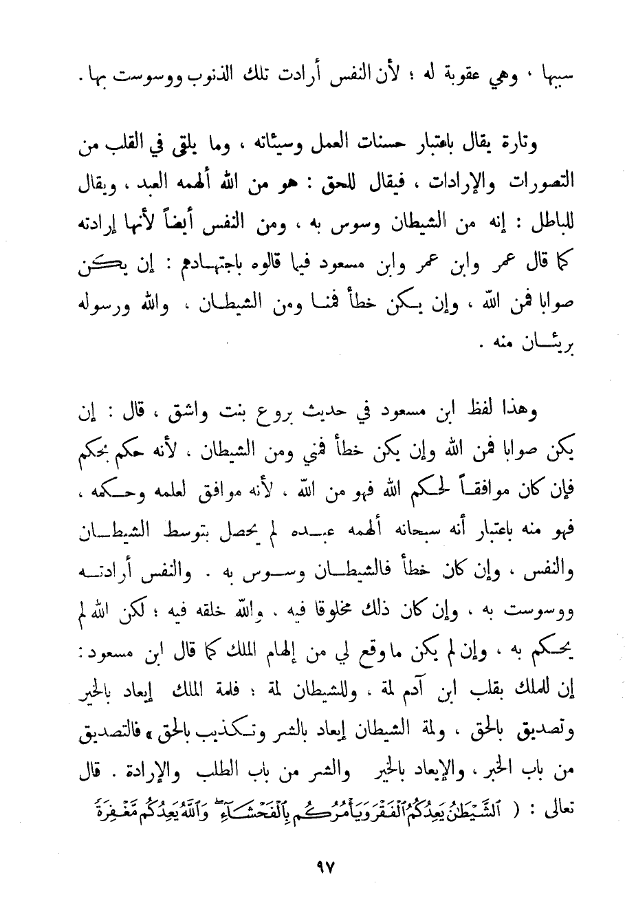 سَبَبَهَا وَهِيَ عُقُوبَةٌ لَهُ؛ لِأَنَّ النَّفْسَ أَرَادَتْ تِلْكَ الذُّنُوبَ وَوُسْوِسَت بِهَا. وَتَارَةً يُقَالُ بِاعْتِبَارِ حَسَنَاتِ الْعَمَلِ وَسَيِّئَاتِهِ وَمَا يُلْقَى فِي الْقَلْبِ مِنْ التَّصَوُّرَاتِ وَالْإِرَادَاتِ فَيُقَالُ لِلْحَقِّ: هُوَ مِنْ اللَّهِ أَلْهَمَهُ الْعَبْدَ وَيُقَالُ لِلْبَاطِلِ: إنَّهُ مِنْ الشَّيْطَانِ وَسْوَسَ بِهِ وَمِنْ النَّفْسِ أَيْضًا لِأَنَّهَا أَرَادَتْهُ كَمَا قَالَ عُمَرُ وَابْنُ عُمَرَ وَابْنُ مَسْعُودٍ فِيمَا قَالُوهُ بِاجْتِهَادِهِمْ: إنْ يَكُنْ صَوَابًا فَمِنْ اللَّهِ وَإِنْ يَكُنْ خَطَأً فَمِنَّا وَمِنْ الشَّيْطَانِ وَاَللَّهُ وَرَسُولُهُ بَرِيئَانِ مِنْهُ. وَهَذَا لَفْظُ ابْنِ مَسْعُودٍ فِي حَدِيثِ بروع بِنْتِ وَاشِقٍ قَالَ: إنْ يَكُنْ صَوَابًا فَمِنْ اللَّهِ وَإِنْ يَكُنْ خَطَأً فَمِنِّي وَمِنْ الشَّيْطَانِ لِأَنَّهُ حَكَمَ بِحُكْمِ فَإِنْ كَانَ مُوَافِقًا لِحُكْمِ اللَّهِ فَهُوَ مِنْ اللَّهِ لِأَنَّهُ مُوَافِقٌ لِعِلْمِهِ وَحُكْمِهِ فَهُوَ مِنْهُ بِاعْتِبَارِ أَنَّهُ سُبْحَانَهُ أَلْهَمَهُ عَبْدَهُ لَمْ يَحْصُلْ بِتَوَسُّطِ الشَّيْطَانِ وَالنَّفْسِ وَإِنْ كَانَ خَطَأً فَالشَّيْطَانُ وَسْوَسَ بِهِ وَالنَّفْسُ أَرَادَتْهُ وَوَسْوَسَتْ بِهِ وَإِنْ كَانَ ذَلِكَ مَخْلُوقًا فِيهِ وَاَللَّهُ خَلَقَهُ فِيهِ؛ لَكِنَّ اللَّهَ لَمْ يَحْكُمْ بِهِ وَإِنْ لَمْ يَكُنْ مَا وَقَعَ لِي مِنْ إلْهَامِ الْمَلَكِ كَمَا قَالَ ابْنُ مَسْعُودٍ: إنَّ لِلْمَلَكِ بِقَلْبِ ابْنِ آدَمَ لَمَّةً وَلِلشَّيْطَانِ لَمَّةً؛ فَلَمَّةُ الْمَلَكِ إيعَادٌ بِالْخَيْرِ وَتَصْدِيقٌ بِالْحَقِّ وَلَمَّةُ الشَّيْطَانِ إيعَادٌ بِالشَّرِّ وَتَكْذِيبٌ بِالْحَقِّ " فَالتَّصْدِيقُ مِنْ بَابِ الْخَبَرِ وَالْإِيعَادُ بِالْخَيْرِ وَالشَّرِّ مِنْ بَابِ الطَّلَبِ وَالْإِرَادَةِ. قَالَ تَعَالَى: {الشَّيْطَانُ يَعِدُكُمُ الْفَقْرَ وَيَأْمُرُكُمْ بِالْفَحْشَاءِ وَاللَّهُ يَعِدُكُمْ مَغْفِرَةً