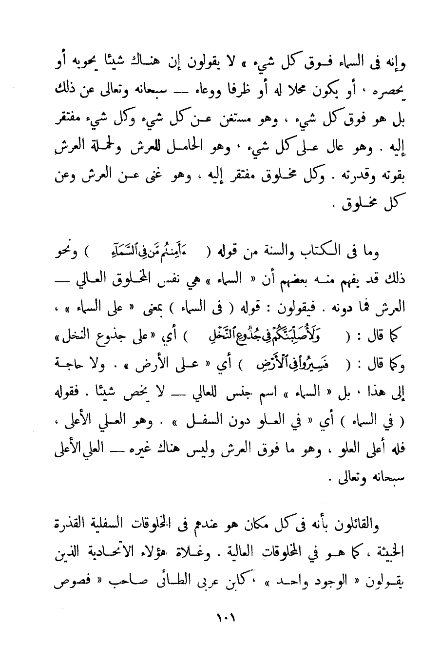 وَإِنَّهُ فِي السَّمَاءِ فَوْقَ كُلِّ شَيْءٍ " لَا يَقُولُونَ إنَّ هُنَاكَ شَيْئًا يَحْوِيهِ أَوْ يَحْصُرُهُ أَوْ يَكُونُ مَحَلًّا لَهُ أَوْ ظَرْفًا وَوِعَاءً سُبْحَانَهُ وَتَعَالَى عَنْ ذَلِكَ بَلْ هُوَ فَوْقَ كُلِّ شَيْءٍ وَهُوَ مُسْتَغْنٍ عَنْ كُلِّ شَيْءٍ وَكُلُّ شَيْءٍ مُفْتَقِرٌ إلَيْهِ. وَهُوَ عَالٍ عَلَى كُلِّ شَيْءٍ وَهُوَ الْحَامِلُ لِلْعَرْشِ وَلِحَمَلَةِ الْعَرْشِ بِقُوَّتِهِ وَقُدْرَتِهِ. وَكُلُّ مَخْلُوقٍ مُفْتَقِرٌ إلَيْهِ وَهُوَ غَنِيٌّ عَنْ الْعَرْشِ وَعَنْ كُلِّ مَخْلُوقٍ. وَمَا فِي الْكِتَابِ وَالسُّنَّةِ مِنْ قَوْلِهِ {أَأَمِنْتُمْ مَنْ فِي السَّمَاءِ} وَنَحْوِ ذَلِكَ قَدْ يَفْهَمُ مِنْهُ بَعْضُهُمْ أَنَّ " السَّمَاءِ " هِيَ نَفْسُ الْمَخْلُوقِ الْعَالِي الْعَرْشُ فَمَا دُونَهُ. فَيَقُولُونَ: قَوْلُهُ {فِي السَّمَاءِ} بِمَعْنَى " عَلَى السَّمَاءِ " كَمَا قَالَ: {وَلَأُصَلِّبَنَّكُم فِي جُذُوعِ النَّخْلِ} أَيْ " عَلَى جُذُوعِ النَّخْلِ " وَكَمَا قَالَ: {فَسِيرُوا فِي الْأَرْضِ} أَيْ " عَلَى الْأَرْضِ ". وَلَا حَاجَةَ إلَى هَذَا بَلْ " السَّمَاءِ " اسْمُ جِنْسٍ لِلْعَالِي لَا يَخُصُّ شَيْئًا. فَقَوْلُهُ {فِي السَّمَاءِ} أَيْ " فِي الْعُلُوِّ دُونَ السُّفْلِ ". وَهُوَ الْعَلِيُّ الْأَعْلَى فَلَهُ أَعْلَى الْعُلُوِّ وَهُوَ مَا فَوْقَ الْعَرْشِ وَلَيْسَ هُنَاكَ غَيْرُهُ الْعَلِيُّ الْأَعْلَى سُبْحَانَهُ وَتَعَالَى. وَالْقَائِلُونَ بِأَنَّهُ فِي كُلِّ مَكَانٍ هُوَ عِنْدَهُمْ فِي الْمَخْلُوقَاتِ السُّفْلِيَّةِ الْقَذِرَةِ الْخَبِيثَةِ كَمَا هُوَ فِي الْمَخْلُوقَاتِ الْعَالِيَةِ. وَغُلَاةُ هَؤُلَاءِ الِاتِّحَادِيَّةُ الَّذِينَ يَقُولُونَ " الْوُجُودُ وَاحِدٌ " كَابْنِ عَرَبِيٍّ الطَّائِيِّ صَاحِبِ " فُصُوصِ