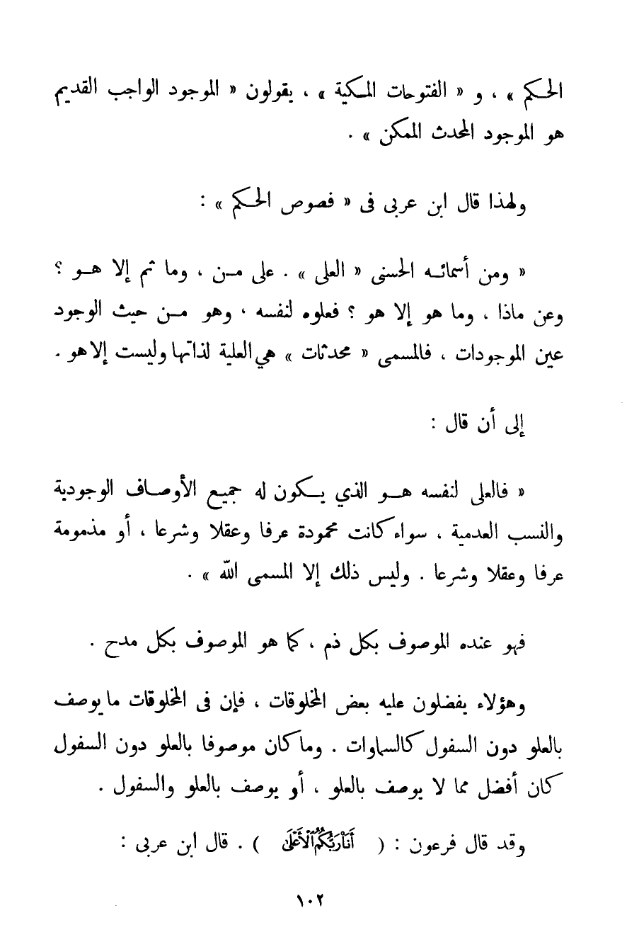 الْحِكَمِ " و " الْفُتُوحَاتِ الْمَكِّيَّةِ " يَقُولُونَ " الْمَوْجُودُ الْوَاجِبُ الْقَدِيمُ هُوَ الْمَوْجُودُ الْمُحْدَثُ الْمُمْكِنُ ". وَلِهَذَا قَالَ ابْنُ عَرَبِيٍّ فِي " فُصُوصِ الْحِكَمِ ": " وَمِنْ أَسْمَائِهِ الْحُسْنَى " الْعَلِيُّ ". عَلَى مَنْ وَمَا ثَمَّ إلَّا هُوَ؟ وَعَنْ مَاذَا وَمَا هُوَ إلَّا هُوَ؟ . فَعُلُوُّهُ لِنَفْسِهِ وَهُوَ مِنْ حَيْثُ الْوُجُودُ عَيْنُ الْمَوْجُودَاتِ فَالْمُسَمَّى " مُحْدَثَاتٌ " هِيَ الْعَلِيَّةُ لِذَاتِهَا وَلَيْسَتْ إلَّا هُوَ. إلَى أَنْ قَالَ: " فَالْعَلِيُّ لِنَفْسِهِ هُوَ الَّذِي يَكُونُ لَهُ جَمِيعُ الْأَوْصَافِ الْوُجُودِيَّةِ وَالنِّسَبِ الْعَدَمِيَّةِ سَوَاءٌ كَانَتْ مَحْمُودَةً عُرْفًا وَعَقْلًا وَشَرْعًا أَوْ مَذْمُومَةً عُرْفًا وَعَقْلًا وَشَرْعًا. وَلَيْسَ ذَلِكَ إلَّا الْمُسَمَّى اللَّهُ ". فَهُوَ عِنْدُهُ الْمَوْصُوفُ بِكُلِّ ذَمٍّ كَمَا هُوَ الْمَوْصُوفُ بِكُلِّ مَدْحٍ. وَهَؤُلَاءِ يُفَضِّلُونَ عَلَيْهِ بَعْضَ الْمَخْلُوقَاتِ فَإِنَّ فِي الْمَخْلُوقَاتِ مَا يُوصَفُ بِالْعُلُوِّ دُونَ السُّفُولِ كَالسَّمَوَاتِ. وَمَا كَانَ مَوْصُوفًا بِالْعُلُوِّ دُونَ السُّفُولِ كَانَ أَفْضَلَ مِمَّا لَا يُوصَفُ بِالْعُلُوِّ أَوْ يُوصَفُ بِالْعُلُوِّ وَالسُّفُولِ. وَقَدْ قَالَ فِرْعَوْنُ: {أَنَا رَبُّكُمُ الْأَعْلَى} . قَالَ ابْنُ عَرَبِيٍّ: