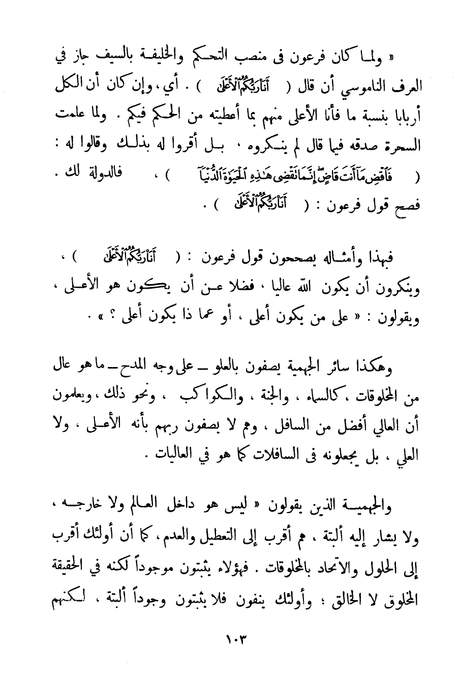 " وَلَمَّا كَانَ فِرْعَوْنُ فِي مَنْصِبِ التَّحَكُّمِ وَالْخَلِيفَةِ بِالسَّيْفِ جَازَ فِي الْعُرْفِ الناموسي أَنْ قَالَ {أَنَا رَبُّكُمُ الْأَعْلَى} . أَيْ وَإِنْ كَانَ أَنَّ الْكُلَّ أَرْبَابًا بِنِسْبَةِ مَا فَأَنَا الْأَعْلَى مِنْهُمْ بِمَا أُعْطِيته مِنْ الْحُكْمِ فِيكُمْ. وَلَمَّا عَلِمَتْ السَّحَرَةُ صِدْقَهُ فِيمَا قَالَ لَمْ يُنْكِرُوهُ بَلْ أَقَرُّوا لَهُ بِذَلِكَ وَقَالُوا لَهُ: {فَاقْضِ مَا أَنْتَ قَاضٍ إِنَّمَا تَقْضِي هَذِهِ الْحَيَاةَ الدُّنْيَا} فَالدَّوْلَةُ لَك. فَصَحَّ قَوْلُ فِرْعَوْنَ: {أَنَا رَبُّكُمُ الْأَعْلَى} . فَبِهَذَا وَأَمْثَالِهِ يُصَحِّحُونَ قَوْلَ فِرْعَوْنَ: {أَنَا رَبُّكُمُ الْأَعْلَى} وَيَنْكَرُونَ أَنْ يَكُونَ اللَّهُ عَالِيًا فَضْلًا عَنْ أَنْ يَكُونَ هُوَ الْأَعْلَى وَيَقُولُونَ: " عَلَى مَنْ يَكُونُ أَعْلَى أَوْ عَمَّا ذَا يَكُونُ أَعْلَى؟ ". وَهَكَذَا سَائِرُ الْجَهْمِيَّة يَصِفُونَ بِالْعُلُوِّ عَلَى وَجْه الْمَدْحِ مَا هُوَ عَالٍ مِنْ الْمَخْلُوقَاتِ كَالسَّمَاءِ وَالْجَنَّةِ وَالْكَوَاكِبِ وَنَحْوِ ذَلِكَ وَيَعْلَمُونَ أَنَّ الْعَالِيَ أَفْضَلُ مِنْ السَّافِلِ وَهُمْ لَا يَصِفُونَ رَبَّهُمْ بِأَنَّهُ الْأَعْلَى وَلَا الْعَلِيُّ بَلْ يَجْعَلُونَهُ فِي السَّافِلَاتِ كَمَا هُوَ فِي الْعَالِيَاتِ. وَالْجَهْمِيَّة الَّذِينَ يَقُولُونَ " لَيْسَ هُوَ دَاخِلَ الْعَالَمِ وَلَا خَارِجَهُ وَلَا يُشَارُ إلَيْهِ أَلْبَتَّةَ هُمْ أَقْرَبُ إلَى التَّعْطِيلِ وَالْعَدَمِ كَمَا أَنَّ أُولَئِكَ أَقْرَبُ إلَى الْحُلُولِ وَالِاتِّحَادِ بِالْمَخْلُوقَاتِ. فَهَؤُلَاءِ يُثْبِتُونَ مَوْجُودًا لَكِنَّهُ فِي الْحَقِيقَةِ الْمَخْلُوقُ لَا الْخَالِقُ؛ وَأُولَئِكَ يَنْفُونَ فَلَا يُثْبِتُونَ وُجُودًا أَلْبَتَّةَ لَكِنَّهُمْ