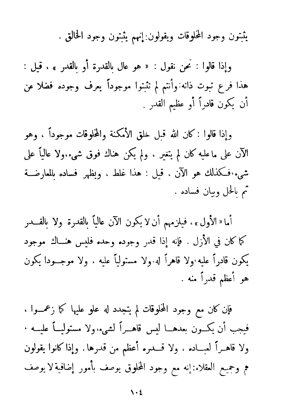 يُثْبِتُونَ وُجُودَ الْمَخْلُوقَاتِ وَيَقُولُونَ إنَّهُمْ يُثْبِتُونَ وُجُودَ الْخَالِقِ. وَإِذَا قَالُوا: نَحْنُ نَقُولُ: " هُوَ عَالٍ بِالْقُدْرَةِ أَوْ بِالْقَدْرِ " قِيلَ: هَذَا فَرْعُ ثُبُوتِ ذَاتِهِ وَأَنْتُمْ لَمْ تُثْبِتُوا مَوْجُودًا يُعْرَفُ وُجُودُهُ فَضْلًا عَنْ أَنْ يَكُونَ قَادِرًا أَوْ عَظِيمَ الْقَدْرِ. وَإِذَا قَالُوا: كَانَ اللَّهُ قَبْلَ خَلْقِ الْأَمْكِنَةِ وَالْمَخْلُوقَاتِ مَوْجُودًا وَهُوَ الْآنَ عَلَى مَا عَلَيْهِ كَانَ لَمْ يَتَغَيَّرْ وَلَمْ يَكُنْ هُنَاكَ فَوْقَ شَيْءٍ وَلَا عَالِيًا عَلَى شَيْءٍ فَكَذَلِكَ هُوَ الْآنَ قِيلَ: هَذَا غَلَطٌ وَيَظْهَرُ فَسَادُهُ بِالْمُعَارَضَةِ ثُمَّ بِالْحَلِّ وَبَيَان فَسَادِهِ. أَمَّا " الْأَوَّلُ " فَيَلْزَمُهُمْ أَنْ لَا يَكُونَ الْآنَ عَالِيًا بِالْقُدْرَةِ وَلَا بِالْقَدْرِ كَمَا كَانَ فِي الْأَزَلِ. فَإِنَّهُ إذَا قُدِّرَ وُجُودُهُ وَحْدَهُ فَلَيْسَ هُنَاكَ مَوْجُودٌ يَكُونُ قَادِرًا عَلَيْهِ وَلَا قَاهِرًا لَهُ وَلَا مُسْتَوْلِيًا عَلَيْهِ وَلَا مَوْجُودًا يَكُونُ هُوَ أَعْظَمَ قَدْرًا مِنْهُ. فَإِنْ كَانَ مَعَ وُجُودِ الْمَخْلُوقَاتِ لَمْ يَتَجَدَّدْ لَهُ عُلُوٌّ عَلَيْهَا كَمَا زَعَمُوا فَيَجِبُ أَنْ يَكُونَ بَعْدَهَا لَيْسَ قَادِرًا لِشَيْءِ وَلَا مُسْتَوْلِيًا عَلَيْهِ وَلَا قَاهِرًا لِعِبَادِهِ وَلَا قَدْرُهُ أَعْظَمُ مِنْ قَدْرِهَا. وَإِذَا كَانُوا يَقُولُونَ هُمْ وَجَمِيعُ الْعُقَلَاءِ إنَّهُ مَعَ وُجُودِ الْمَخْلُوقِ يُوصَفُ بِأُمُورِ إضَافِيَّةٍ لَا يُوصَفُ