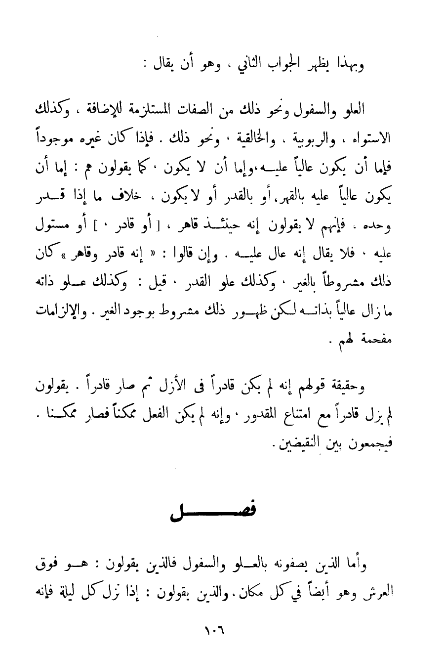 وَبِهَذَا يَظْهَرُ الْجَوَابُ الثَّانِي وَهُوَ أَنْ يُقَالَ: الْعُلُوُّ وَالسُّفُولُ وَنَحْوُ ذَلِكَ مِنْ الصِّفَاتِ الْمُسْتَلْزِمَةِ لِلْإِضَافَةِ وَكَذَلِكَ الِاسْتِوَاءُ وَالرُّبُوبِيَّةُ والخالقية وَنَحْوُ ذَلِكَ. فَإِذَا كَانَ غَيْرُهُ مَوْجُودًا فَإِمَّا أَنْ يَكُونَ عَالِيًا عَلَيْهِ وَإِمَّا أَنْ لَا يَكُونَ كَمَا يَقُولُونَ هُمْ: إمَّا أَنْ يَكُونَ عَالِيًا عَلَيْهِ بِالْقَهْرِ أَوْ بِالْقَدْرِ أَوْ لَا يَكُونَ خِلَافُ مَا إذَا قَدَّرَ وَحْدَهُ فَإِنَّهُمْ لَا يَقُولُونَ إنَّهُ حِينَئِذٍ قَاهِرٌ أَوْ قَادِرٌ أَوْ مُسْتَوْلٍ عَلَيْهِ فَلَا يُقَالُ إنَّهُ عَالٍ عَلَيْهِ. وَإِنْ قَالُوا: " إنَّهُ قَادِرٌ وَقَاهِرٌ " كَانَ ذَلِكَ مَشْرُوطًا بِالْغَيْرِ وَكَذَلِكَ عُلُوُّ الْقَدْرِ قِيلَ: وَكَذَلِكَ عُلُوُّ ذَاتِهِ مَا زَالَ عَالِيًا بِذَاتِهِ لَكِنَّ ظُهُورَ ذَلِكَ مَشْرُوطٌ بِوُجُودِ الْغَيْرِ. وَالْإِلْزَامَاتُ مُفْحِمَةٌ لَهُمْ. وَحَقِيقَةُ قَوْلِهِمْ إنَّهُ لَمْ يَكُنْ قَادِرًا فِي الْأَزَلِ ثُمَّ صَارَ قَادِرًا. يَقُولُونَ لَمْ يَزَلْ قَادِرًا مَعَ امْتِنَاعِ الْمَقْدُورِ وَإِنَّهُ لَمْ يَكُنْ الْفِعْلُ مُمْكِنًا فَصَارَ مُمْكِنًا. فَيَجْمَعُونَ بَيْنَ النَّقِيضَيْنِ.