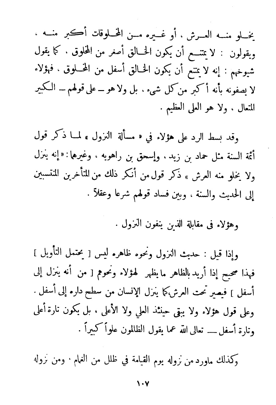 يَخْلُو مِنْهُ الْعَرْشُ أَوْ غَيْرُهُ مِنْ الْمَخْلُوقَاتِ أَكْبَرُ مِنْهُ وَيَقُولُونَ: لَا يَمْتَنِعُ أَنْ يَكُونَ الْخَالِقُ أَصْغَرَ مِنْ الْمَخْلُوقِ كَمَا يَقُولُ شُيُوخُهُمْ: إنَّهُ لَا يَمْتَنِعُ أَنْ يَكُونَ الْخَالِقُ أَسْفَلَ مِنْ الْمَخْلُوقِ فَهَؤُلَاءِ لَا يَصِفُونَهُ بِأَنَّهُ أَكْبَرُ مِنْ كُلِّ شَيْءٍ بَلْ وَلَا هُوَ عَلَى قَوْلِهِمْ الْكَبِيرُ المتعال وَلَا هُوَ الْعَلِيُّ الْعَظِيمُ. وَقَدْ بَسَطَ الرَّدَّ عَلَى هَؤُلَاءِ فِي " مَسْأَلَةِ النُّزُولِ " لَمَّا ذَكَرَ قَوْلَ أَئِمَّةِ السُّنَّةِ مِثْلِ حَمَّادِ بْنِ زَيْدٍ وَإِسْحَاقَ بْنِ رَاهَوَيْه وَغَيْرِهِمَا: " إنَّهُ يَنْزِلُ وَلَا يَخْلُو مِنْهُ الْعَرْشُ " ذَكَرَ قَوْلَ مَنْ أَنْكَرَ ذَلِكَ مِنْ الْمُتَأَخِّرِينَ الْمُنْتَسِبِينَ إلَى الْحَدِيثِ وَالسُّنَّةِ وَبَيَّنَ فَسَادَ قَوْلِهِمْ شَرْعًا وَعَقْلًا. وَهَؤُلَاءِ فِي مُقَابَلَةِ الَّذِينَ يَنْفُونَ النُّزُولَ. وَإِذَا قِيلَ: حَدِيثُ النُّزُولِ وَنَحْوِهِ ظَاهِرُهُ لَيْسَ يَحْتَمِلُ التَّأْوِيلَ فَهَذَا صَحِيحٌ إذَا أُرِيدَ بِالظَّاهِرِ مَا يَظْهَرُ لِهَؤُلَاءِ وَنَحْوِهِمْ مِنْ أَنَّهُ يَنْزِلُ إلَى أَسْفَلَ فَيَصِيرُ تَحْتَ الْعَرْشِ كَمَا يَنْزِلُ الْإِنْسَانُ مِنْ سَطْحِ دَارِهِ إلَى أَسْفَلُ. وَعَلَى قَوْلِ هَؤُلَاءِ وَلَا يَبْقَى حِينَئِذٍ الْعَلِيُّ وَلَا الْأَعْلَى بَلْ يَكُونُ تَارَةً أَعْلَى وَتَارَةً أَسْفَلَ - تَعَالَى اللَّه عَمَّا يَقُولُ الظَّالِمُونَ عُلُوًّا كَبِيرًا. وَكَذَلِكَ مَا وَرَدَ مِنْ نُزُولِهِ يَوْمَ الْقِيَامَةِ فِي ظُلَلٍ مِنْ الْغَمَامِ وَمِنْ نُزُولِهِ
