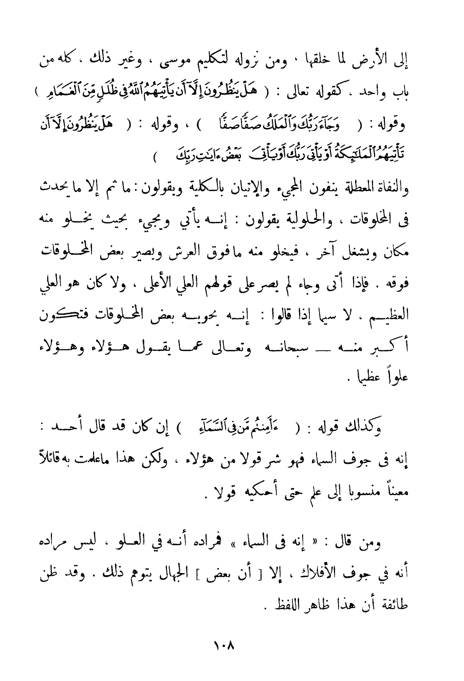 إلَى الْأَرْضِ لَمَّا خَلَقَهَا وَمِنْ نُزُولِهِ لِتَكْلِيمِ مُوسَى وَغَيْرِ ذَلِكَ كُلِّهِ مِنْ بَابٍ وَاحِدٍ كَقَوْلِهِ تَعَالَى: {هَلْ يَنْظُرُونَ إلَّا أَنْ يَأْتِيَهُمُ اللَّهُ فِي ظُلَلٍ مِنَ الْغَمَامِ} وَقَوْلِهِ: {وَجَاءَ رَبُّكَ وَالْمَلَكُ صَفًّا صَفًّا} وَقَوْلِهِ: {هَلْ يَنْظُرُونَ إلَّا أَنْ تَأْتِيَهُمُ الْمَلَائِكَةُ أَوْ يَأْتِيَ رَبُّكَ أَوْ يَأْتِيَ بَعْضُ آيَاتِ رَبِّكَ} والْنُّفَاةِ الْمُعَطِّلَةُ يَنْفُونَ الْمَجِيءَ وَالْإِتْيَانَ بِالْكُلِّيَّةِ وَيَقُولُونَ: مَا ثَمَّ إلَّا مَا يَحْدُثُ فِي الْمَخْلُوقَاتِ وَالْحُلُولِيَّةُ يَقُولُونَ: إنَّهُ يَأْتِي وَيَجِيءُ بِحَيْثُ يَخْلُو مِنْهُ مَكَانٌ وَيُشْغَلُ آخَرُ فَيَخْلُو مِنْهُ مَا فَوْقَ الْعَرْشِ وَيَصِيرُ بَعْضُ الْمَخْلُوقَاتِ فَوْقَهُ. فَإِذَا أَتَى وَجَاءَ لَمْ يَصِرْ عَلَى قَوْلِهِمْ الْعَلِيُّ الْأَعْلَى وَلَا كَانَ هُوَ الْعَلِيُّ الْعَظِيمُ. لَا سِيَّمَا إذَا قَالُوا: إنَّهُ يَحْوِيهِ بَعْضُ الْمَخْلُوقَاتِ فَتَكُونُ أَكْبَرَ مِنْهُ سُبْحَانَهُ وَتَعَالَى عَمَّا يَقُولُ هَؤُلَاءِ وَهَؤُلَاءِ عُلُوًّا عَظِيمًا. وَكَذَلِكَ قَوْلُهُ: {أَأَمِنْتُمْ مَنْ فِي السَّمَاءِ} إنْ كَانَ قَدْ قَالَ أَحَدٌ: إنَّهُ فِي جَوْفِ السَّمَاءِ فَهُوَ شَرٌّ قَوْلًا مِنْ هَؤُلَاءِ وَلَكِنَّ هَذَا مَا عَلِمْت بِهِ قَائِلًا مُعَيَّنًا مَنْسُوبًا إلَى عِلْمٍ حَتَّى أَحْكِيَهُ قَوْلًا. وَمَنْ قَالَ: " إنَّهُ فِي السَّمَاءِ " فَمُرَادُهُ أَنَّهُ فِي الْعُلُوِّ لَيْسَ مُرَادُهُ أَنَّهُ فِي جَوْفِ الْأَفْلَاكِ إلَّا أَنَّ بَعْضَ الْجُهَّالِ يَتَوَهَّمُ ذَلِكَ. وَقَدْ ظَنَّ طَائِفَةٌ أَنَّ هَذَا ظَاهِرُ اللَّفْظِ.