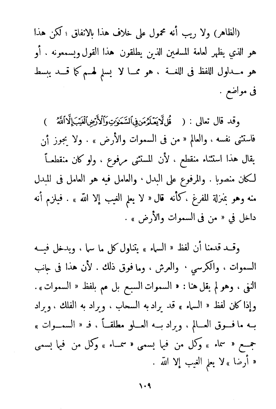الظَّاهِرُ وَلَا رَيْبَ أَنَّهُ مَحْمُولٌ عَلَى خِلَافِ هَذَا بِالِاتِّفَاقِ؛ لَكِنَّ هَذَا هُوَ الَّذِي يَظْهَرُ لِعَامَّةِ الْمُسْلِمِينَ الَّذِينَ يُطْلِقُونَ هَذَا الْقَوْلَ وَيَسْمَعُونَهُ أَوْ هُوَ مَدْلُولُ اللَّفْظِ فِي اللُّغَةِ هُوَ مِمَّا لَا يَسْلَمُ لَهُمْ كَمَا قَدْ يُبْسَطُ فِي مَوَاضِعَ. وَقَدْ قَالَ تَعَالَى: {قُلْ لَا يَعْلَمُ مَنْ فِي السَّمَاوَاتِ وَالْأَرْضِ الْغَيْبَ إلَّا اللَّهُ} فَاسْتَثْنَى نَفْسَهُ وَالْعَالِمُ " مَنْ فِي السَّمَوَاتِ وَالْأَرْضِ " وَلَا يَجُوزُ أَنْ يُقَالَ هَذَا اسْتِثْنَاءٌ مُنْقَطِعٌ لِأَنَّ الْمُسْتَثْنَى مَرْفُوعٌ وَلَوْ كَانَ مُنْقَطِعًا لَكَانَ مَنْصُوبًا. وَالْمَرْفُوعُ عَلَى الْبَدَلِ وَالْعَامِلُ فِيهِ هُوَ الْعَامِلُ فِي الْمُبْدَلِ مِنْهُ وَهُوَ بِمَنْزِلَةِ الْمُفَرَّغِ كَأَنَّهُ قَالَ " لَا يَعْلَمُ الْغَيْبَ إلَّا اللَّهُ ". فَيَلْزَمُ أَنَّهُ دَاخِلٌ فِي " مَنْ فِي السَّمَوَاتِ وَالْأَرْضِ ". وَقَدْ قَدَّمْنَا أَنَّ لَفْظَ " السَّمَاءِ " يَتَنَاوَلُ كُلَّ مَا سَمَا وَيَدْخُلُ فِيهِ السَّمَوَاتُ وَالْكُرْسِيُّ وَالْعَرْشُ وَمَا فَوْقَ ذَلِكَ. لِأَنَّ هَذَا فِي جَانِبِ النَّفْيِ وَهُوَ لَمْ يَقُلْ هُنَا: " السَّمَوَاتِ السَّبْعَ " بَلْ عَمَّ بِلَفْظِ " السَّمَوَاتِ ". وَإِذَا كَانَ لَفْظُ " السَّمَاءِ " قَدْ يُرَادُ بِهِ السَّحَابُ وَيُرَادُ بِهِ الْفُلْكُ وَيُرَادُ بِهِ مَا فَوْقَ الْعَالَمِ وَيُرَادُ بِهِ الْعُلُوُّ مُطْلَقًا فـ " السَّمَوَاتُ " جَمْعُ " سَمَاءٍ " وَكُلُّ مَنْ فِيمَا يُسَمَّى " سَمَاءً " وَكُلُّ مَنْ فِيمَا يُسَمَّى " أَرْضًا " لَا يَعْلَمُ الْغَيْبَ إلَّا اللَّهُ.