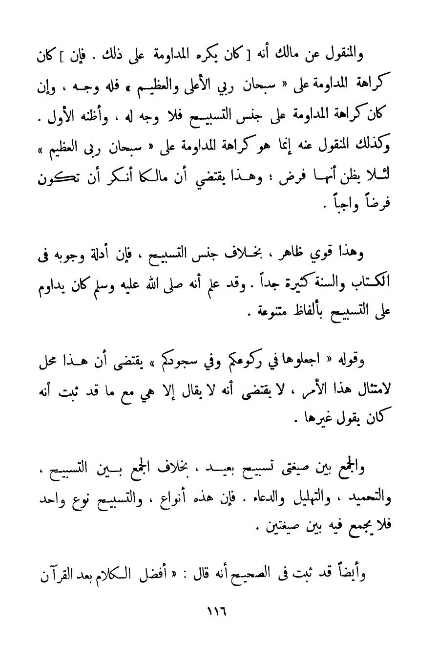 وَالْمَنْقُولُ عَنْ مَالِكٍ أَنَّهُ كَانَ يَكْرَهُ الْمُدَاوَمَةَ عَلَى ذَلِكَ. فَإِنْ كَانَ كَرَاهَةُ الْمُدَاوَمَةِ عَلَى " سُبْحَانَ رَبِّي الْأَعْلَى وَالْعَظِيمِ " فَلَهُ وَجْهٌ وَإِنْ كَانَ كَرَاهَةُ الْمُدَاوَمَةِ عَلَى جِنْسِ التَّسْبِيحِ فَلَا وَجْهَ لَهُ وَأَظُنُّهُ الْأَوَّلَ. وَكَذَلِكَ الْمَنْقُولُ عَنْهُ إنَّمَا هُوَ كَرَاهَةُ الْمُدَاوَمَةِ عَلَى " سُبْحَانَ رَبِّي الْعَظِيمِ " لِئَلَّا يُظَنَّ أَنَّهَا فَرْضٌ؛ وَهَذَا يَقْتَضِي أَنَّ مَالِكًا أَنْكَرُ أَنْ تَكُونَ فَرْضًا وَاجِبًا. وَهَذَا قَوِيٌّ ظَاهِرٌ بِخِلَافِ جِنْسِ التَّسْبِيحِ فَإِنَّ أَدِلَّةَ وُجُوبِهِ فِي الْكِتَابِ وَالسُّنَّةِ كَثِيرَةٌ جِدًّا. وَقَدْ عُلِمَ أَنَّهُ صَلَّى اللَّهُ عَلَيْهِ وَسَلَّمَ كَانَ يُدَاوِمُ عَلَى التَّسْبِيحِ بِأَلْفَاظِ مُتَنَوِّعَةٍ. وَقَوْلُهُ " اجْعَلُوهَا فِي رُكُوعِكُمْ وَفِي سُجُودِكُمْ " يَقْتَضِي أَنَّ هَذَا مَحَلٌّ لِامْتِثَالِ هَذَا الْأَمْرِ لَا يَقْتَضِي أَنَّهُ لَا يُقَالُ إلَّا هِيَ مَعَ مَا قَدْ ثَبَتَ أَنَّهُ كَانَ يَقُولُ غَيْرَهَا. وَالْجَمْعُ بَيْنَ صِيغَتَيْ تَسْبِيحٍ بَعِيدٍ بِخِلَافِ الْجَمْعِ بَيْنَ التَّسْبِيحِ وَالتَّحْمِيدِ وَالتَّهْلِيلِ وَالدُّعَاءِ. فَإِنَّ هَذِهِ أَنْوَاعٌ وَالتَّسْبِيحَ نَوْعٌ وَاحِدٌ فَلَا يُجْمَعُ فِيهِ بَيْنَ صِيغَتَيْنِ. وَأَيْضًا قَدْ ثَبَتَ فِي الصَّحِيحِ أَنَّهُ قَالَ: {أَفْضَلُ الْكَلَامِ بَعْدَ الْقُرْآنِ