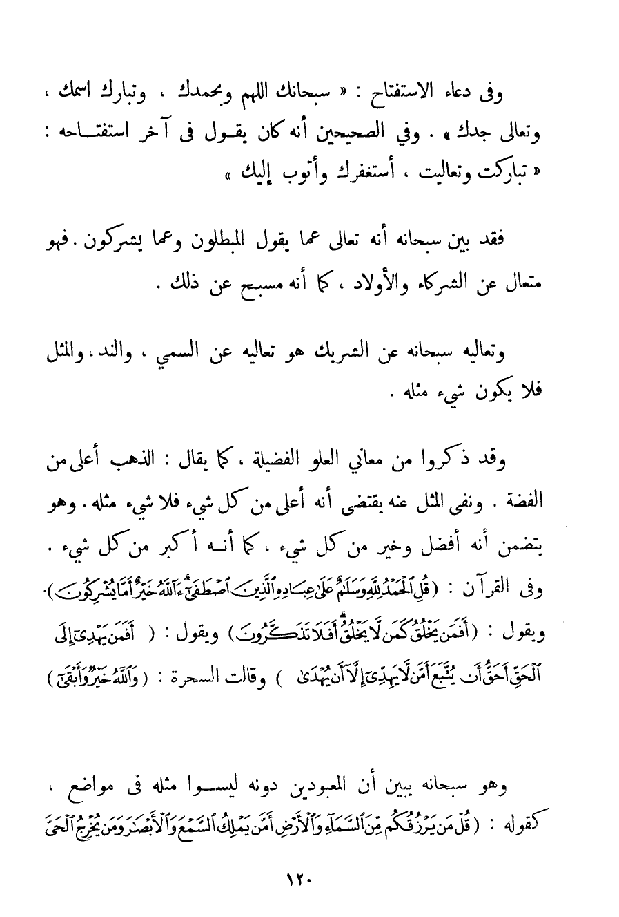 وَفِي دُعَاءِ الِاسْتِفْتَاحِ: " سُبْحَانَك اللَّهُمَّ وَبِحَمْدِك وَتَبَارَكَ اسْمُك وَتَعَالَى جَدُّك ". وَفِي الصَّحِيحَيْنِ أَنَّهُ كَانَ يَقُولُ فِي آخِرِ اسْتِفْتَاحِهِ: {تَبَارَكْت وَتَعَالَيْت أَسْتَغْفِرُك وَأَتُوبُ إلَيْك} فَقَدْ بَيَّنَ سُبْحَانَهُ أَنَّهُ تَعَالَى عَمَّا يَقُولُ الْمُبْطِلُونَ وَعَمَّا يُشْرِكُونَ. فَهُوَ مُتَعَالٍ عَنْ الشُّرَكَاءِ وَالْأَوْلَادِ كَمَا أَنَّهُ مُسَبَّحٌ عَنْ ذَلِكَ. وَتَعَالِيهِ سُبْحَانَهُ عَنْ الشَّرِيكِ هُوَ تَعَالِيهِ عَنْ السَّمِيِّ وَالنِّدِّ وَالْمِثْلِ فَلَا يَكُونُ شَيْءٌ مِثْلَهُ. وَقَدْ ذَكَرُوا مِنْ مَعَانِي الْعُلُوِّ الْفَضِيلَةَ كَمَا يُقَالُ: الذَّهَبُ أَعْلَى مِنْ الْفِضَّةِ. وَنَفْيُ الْمِثْلِ عَنْهُ يَقْتَضِي أَنَّهُ أَعْلَى مِنْ كُلِّ شَيْءٍ فَلَا شَيْءَ مِثْلَهُ. وَهُوَ يَتَضَمَّنُ أَنَّهُ أَفْضَلُ وَخَيْرٌ مِنْ كُلِّ شَيْءٍ كَمَا أَنَّهُ أَكْبَرُ مِنْ كُلِّ شَيْءٍ. وَفِي الْقُرْآنِ: {قُلِ الْحَمْدُ لِلَّهِ وَسَلَامٌ عَلَى عِبَادِهِ الَّذِينَ اصْطَفَى آللَّهُ خَيْرٌ أَمْ مَا يُشْرِكُونَ} . وَيَقُولُ: {أَفَمَنْ يَخْلُقُ كَمَنْ لَا يَخْلُقُ أَفَلَا تَذَكَّرُونَ} وَيَقُولُ: {أَفَمَنْ يَهْدِي إلَى الْحَقِّ أَحَقُّ أَنْ يُتَّبَعَ أَمَّنْ لَا يَهِدِّي إلَّا أَنْ يُهْدَى} وَقَالَتْ السَّحَرَةُ: {وَاللَّهُ خَيْرٌ وَأَبْقَى} وَهُوَ سُبْحَانَهُ يُبَيِّنُ أَنَّ الْمَعْبُودِينَ دُونَهُ لَيْسُوا مِثْلَهُ فِي مَوَاضِعَ كَقَوْلِهِ: {قُلْ مَنْ يَرْزُقُكُمْ مِنَ السَّمَاءِ وَالْأَرْضِ أَمَّنْ يَمْلِكُ السَّمْعَ