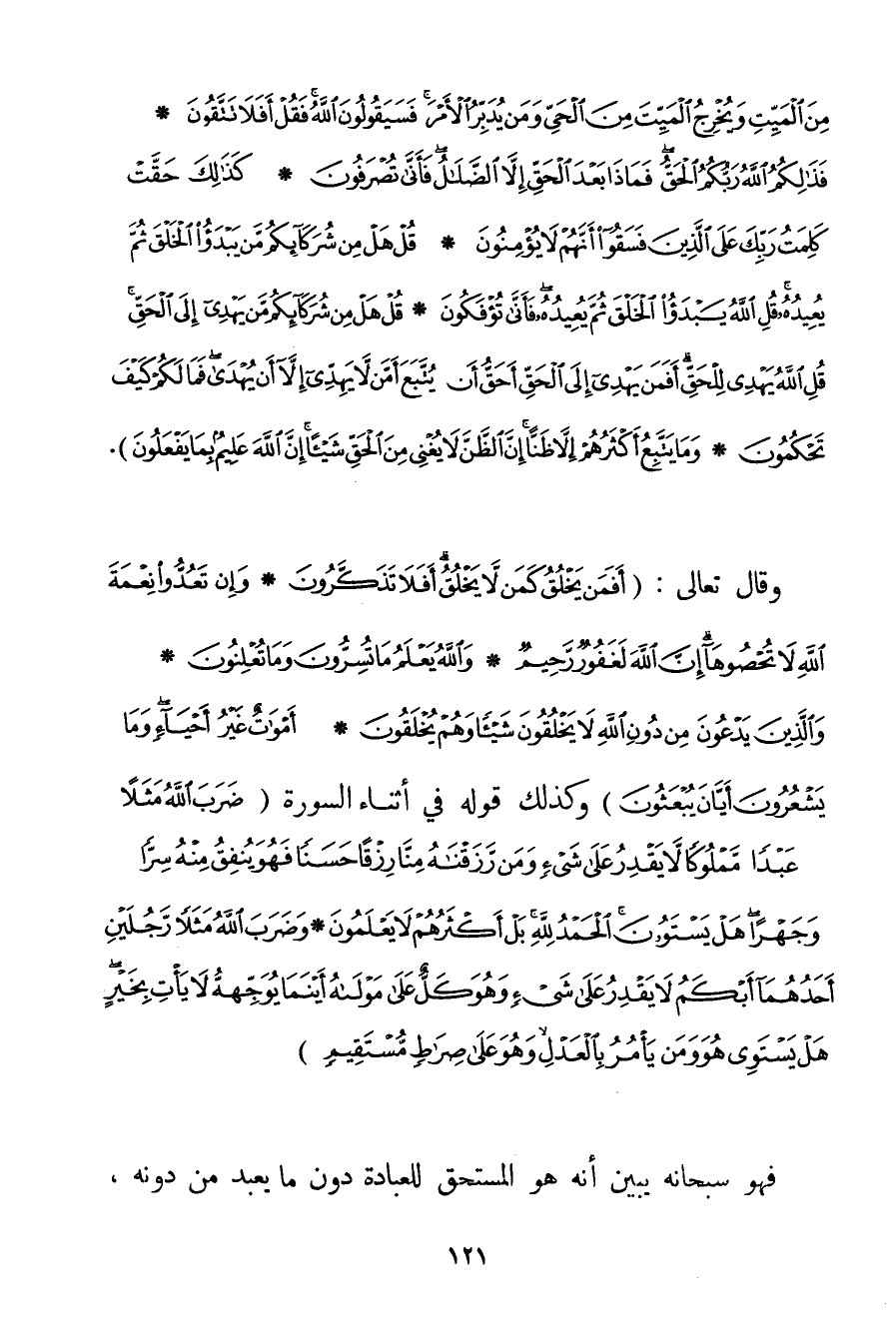 وَالْأَبْصَارَ وَمَنْ يُخْرِجُ الْحَيَّ مِنَ الْمَيِّتِ وَيُخْرِجُ الْمَيِّتَ مِنَ الْحَيِّ وَمَنْ يُدَبِّرُ الْأَمْرَ فَسَيَقُولُونَ اللَّهُ فَقُلْ أَفَلَا تَتَّقُونَ} {فَذَلِكُمُ اللَّهُ رَبُّكُمُ الْحَقُّ فَمَاذَا بَعْدَ الْحَقِّ إلَّا الضَّلَالُ فَأَنَّى تُصْرَفُونَ} {كَذَلِكَ حَقَّتْ كَلِمَةُ رَبِّكَ عَلَى الَّذِينَ فَسَقُوا أَنَّهُمْ لَا يُؤْمِنُونَ} {قُلْ هَلْ مِنْ شُرَكَائِكُمْ مَنْ يَبْدَأُ الْخَلْقَ ثُمَّ يُعِيدُهُ قُلِ اللَّهُ يَبْدَأُ الْخَلْقَ ثُمَّ يُعِيدُهُ فَأَنَّى تُؤْفَكُونَ} {قُلْ هَلْ مِنْ شُرَكَائِكُمْ مَنْ يَهْدِي إلَى الْحَقِّ قُلِ اللَّهُ يَهْدِي لِلْحَقِّ أَفَمَنْ يَهْدِي إلَى الْحَقِّ أَحَقُّ أَنْ يُتَّبَعَ أَمَّنْ لَا يَهِدِّي إلَّا أَنْ يُهْدَى فَمَا لَكُمْ كَيْفَ تَحْكُمُونَ} {وَمَا يَتَّبِعُ أَكْثَرُهُمْ إلَّا ظَنًّا إنَّ الظَّنَّ لَا يُغْنِي مِنَ الْحَقِّ شَيْئًا إنَّ اللَّهَ عَلِيمٌ بِمَا يَفْعَلُونَ} . وَقَالَ تَعَالَى: {أَفَمَنْ يَخْلُقُ كَمَنْ لَا يَخْلُقُ أَفَلَا تَذَكَّرُونَ} {وَإِنْ تَعُدُّوا نِعْمَةَ اللَّهِ لَا تُحْصُوهَا إنَّ اللَّهَ لَغَفُورٌ رَحِيمٌ} {وَاللَّهُ يَعْلَمُ مَا تُسِرُّونَ وَمَا تُعْلِنُونَ} {وَالَّذِينَ يَدْعُونَ مِنْ دُونِ اللَّهِ لَا يَخْلُقُونَ شَيْئًا وَهُمْ يُخْلَقُونَ} {أَمْوَاتٌ غَيْرُ أَحْيَاءٍ وَمَا يَشْعُرُونَ أَيَّانَ يُبْعَثُونَ} وَكَذَلِكَ قَوْلُهُ فِي أَثْنَاءِ السُّورَةِ {ضَرَبَ اللَّهُ مَثَلًا عَبْدًا مَمْلُوكًا لَا يَقْدِرُ عَلَى شَيْءٍ وَمَنْ رَزَقْنَاهُ مِنَّا رِزْقًا حَسَنًا فَهُوَ يُنْفِقُ مِنْهُ سِرًّا وَجَهْرًا هَلْ يَسْتَوُونَ الْحَمْدُ لِلَّهِ بَلْ أَكْثَرُهُمْ لَا يَعْلَمُونَ} {وَضَرَبَ اللَّهُ مَثَلًا رَجُلَيْنِ أَحَدُهُمَا أَبْكَمُ لَا يَقْدِرُ عَلَى شَيْءٍ وَهُوَ كَلٌّ عَلَى مَوْلَاهُ أَيْنَمَا يُوَجِّهْهُ لَا يَأْتِ بِخَيْرٍ هَلْ يَسْتَوِي هُوَ وَمَنْ يَأْمُرُ بِالْعَدْلِ وَهُوَ عَلَى صِرَاطٍ مُسْتَقِيمٍ} فَهُوَ سُبْحَانَهُ يُبَيِّنُ أَنَّهُ هُوَ الْمُسْتَحِقُّ لِلْعِبَادَةِ دُونَ مَا يُعْبَدُ مِنْ دُونِهِ