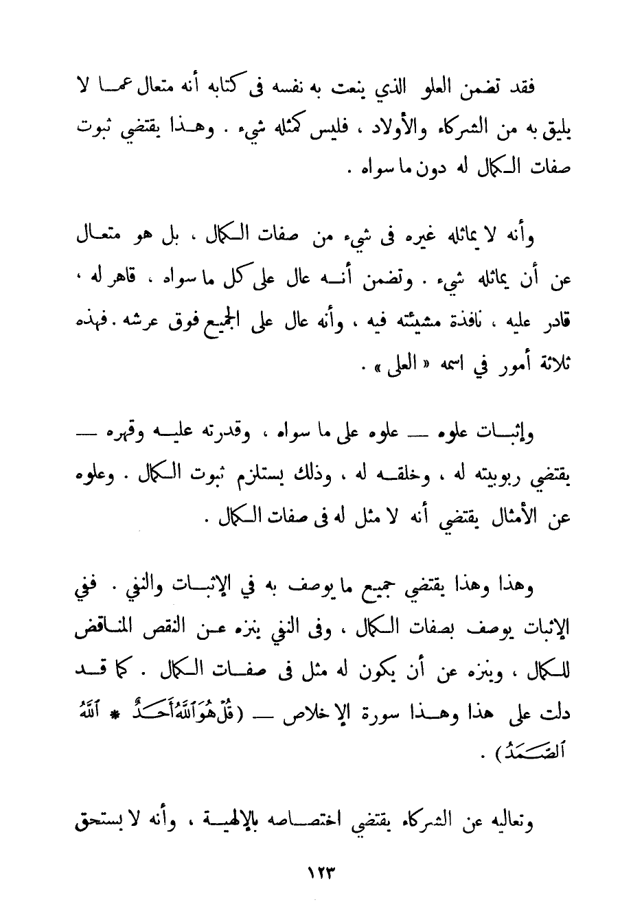 فَقَدْ تَضَمَّنَ الْعُلُوَّ الَّذِي يَنْعَتُ بِهِ نَفْسَهُ فِي كِتَابِهِ أَنَّهُ مُتَعَالٍ عَمَّا لَا يَلِيقُ بِهِ مِنْ الشُّرَكَاءِ وَالْأَوْلَادِ فَلَيْسَ كَمِثْلِهِ شَيْءٌ. وَهَذَا يَقْتَضِي ثُبُوتَ صِفَاتِ الْكَمَالِ لَهُ دُونَ مَا سِوَاهُ. وَأَنَّهُ لَا يُمَاثِلُهُ غَيْرُهُ فِي شَيْءٍ مِنْ صِفَاتِ الْكَمَالِ بَلْ هُوَ مُتَعَالٍ عَنْ أَنْ يُمَاثِلَهُ شَيْءٌ. وَتَضَمَّنَ أَنَّهُ عَالٍ عَلَى كُلِّ مَا سِوَاهُ قَاهِرٌ لَهُ قَادِرٌ عَلَيْهِ نَافِذَةٌ مَشِيئَتُهُ فِيهِ وَأَنَّهُ عَالٍ عَلَى الْجَمِيعِ فَوْقَ عَرْشِهِ. فَهَذِهِ ثَلَاثَةُ أُمُورٌ فِي اسْمِهِ " الْعَلِيِّ ". وَإِثْبَاتُ عُلُوِّهِ عُلُوُّهُ عَلَى مَا سِوَاهُ وَقُدْرَتُهُ عَلَيْهِ وَقَهْرُهُ يَقْتَضِي رُبُوبِيَّتَهُ لَهُ وَخَلْقَهُ لَهُ وَذَلِكَ يَسْتَلْزِمُ ثُبُوتَ الْكَمَالِ. وَعُلُوُّهُ عَنْ الْأَمْثَالِ يَقْتَضِي أَنَّهُ لَا مِثْلَ لَهُ فِي صِفَاتِ الْكَمَالِ. وَهَذَا وَهَذَا يَقْتَضِي جَمِيعَ مَا يُوصَفُ بِهِ فِي الْإِثْبَاتِ وَالنَّفْيِ. فَفِي الْإِثْبَاتِ يُوصَفُ بِصِفَاتِ الْكَمَالِ وَفِي النَّفْيِ يُنَزَّهُ عَنْ النَّقْصِ الْمُنَاقِضِ لِلْكَمَالِ وَيُنَزَّهُ عَنْ أَنْ يَكُونَ لَهُ مِثْلٌ فِي صِفَاتِ الْكَمَالِ. كَمَا قَدْ دَلَّتْ عَلَى هَذَا وَهَذَا سُورَةُ الْإِخْلَاصِ {قُلْ هُوَ اللَّهُ أَحَدٌ} {اللَّهُ الصَّمَدُ} . وَتَعَالِيهِ عَنْ الشُّرَكَاءِ يَقْتَضِي اخْتِصَاصَهُ بِالْإِلَهِيَّةِ وَأَنَّهُ لَا يَسْتَحِقُّ