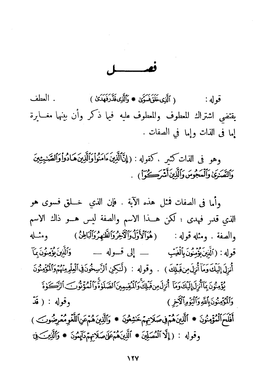 قَوْلُهُ: {الَّذِي خَلَقَ فَسَوَّى} {وَالَّذِي قَدَّرَ فَهَدَى} الْعَطْفُ يَقْتَضِي اشْتِرَاكَ الْمَعْطُوفِ وَالْمَعْطُوفِ عَلَيْهِ فِيمَا ذَكَرَ وَأَنَّ بَيْنَهُمَا مُغَايِرَةٌ إمَّا فِي الذَّاتِ وَإِمَّا فِي الصِّفَاتِ. وَهُوَ فِي الذَّاتِ كَثِيرٌ كَقَوْلِهِ: {إنَّ الَّذِينَ آمَنُوا وَالَّذِينَ هَادُوا وَالصَّابِئِينَ وَالنَّصَارَى وَالْمَجُوسَ وَالَّذِينَ أَشْرَكُوا} . وَأَمَّا فِي الصِّفَاتِ فَمِثْلُ هَذِهِ الْآيَةِ. فَإِنَّ الَّذِي خَلَقَ فَسَوَّى هُوَ الَّذِي قَدَّرَ فَهَدَى؛ لَكِنَّ هَذَا الِاسْمَ وَالصِّفَةَ لَيْسَ هُوَ ذَاكَ الِاسْمُ وَالصِّفَةُ. وَمِثْلُهُ قَوْلُهُ: {هُوَ الْأَوَّلُ وَالْآخِرُ وَالظَّاهِرُ وَالْبَاطِنُ} وَمِثْلُهُ قَوْلُهُ: {الَّذِينَ يُؤْمِنُونَ بِالْغَيْبِ} إلَى قَوْلِهِ {وَالَّذِينَ يُؤْمِنُونَ بِمَا أُنْزِلَ إلَيْكَ وَمَا أُنْزِلَ مِنْ قَبْلِكَ} . وَقَوْلُهُ: {لَكِنِ الرَّاسِخُونَ فِي الْعِلْمِ مِنْهُمْ وَالْمُؤْمِنُونَ يُؤْمِنُونَ بِمَا أُنْزِلَ إلَيْكَ وَمَا أُنْزِلَ مِنْ قَبْلِكَ وَالْمُقِيمِينَ الصَّلَاةَ وَالْمُؤْتُونَ الزَّكَاةَ وَالْمُؤْمِنُونَ بِاللَّهِ وَالْيَوْمِ الْآخِرِ} وَقَوْلُهُ: {قَدْ أَفْلَحَ الْمُؤْمِنُونَ} {الَّذِينَ هُمْ فِي صَلَاتِهِمْ خَاشِعُونَ} {وَالَّذِينَ هُمْ عَنِ اللَّغْوِ مُعْرِضُونَ} وَقَوْلُهُ: {إلَّا الْمُصَلِّينَ} {الَّذِينَ هُمْ عَلَى صَلَاتِهِمْ دَائِمُونَ}
