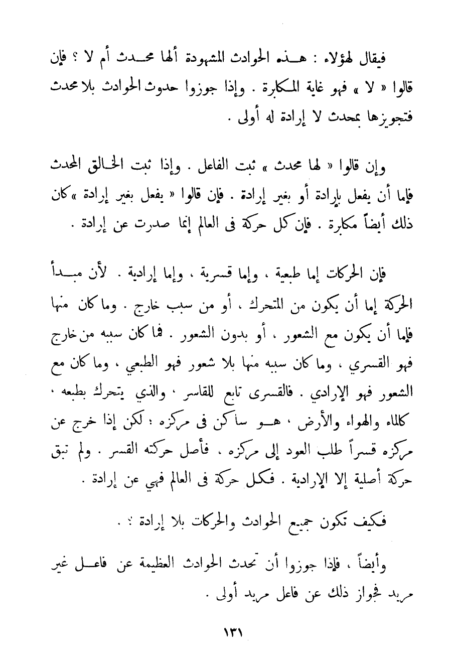 فَيُقَالُ لِهَؤُلَاءِ: هَذِهِ الْحَوَادِثُ الْمَشْهُودَةُ أَلَهَا مُحْدِثٌ أَمْ لَا؟ فَإِنْ قَالُوا " لَا " فَهُوَ غَايَةُ الْمُكَابَرَةِ. وَإِذَا جَوَّزُوا حُدُوثَ الْحَوَادِثِ بِلَا مُحْدِثٍ فَتَجْوِيزُهَا بِمُحْدِثِ لَا إرَادَةَ لَهُ أَوْلَى. وَإِنْ قَالُوا " لَهَا مُحْدِثٌ " ثَبَتَ الْفَاعِلُ. وَإِذَا ثَبَتَ الْخَالِقُ الْمُحْدِثُ فَإِمَّا أَنْ يَفْعَلَ بِإِرَادَةِ أَوْ بِغَيْرِ إرَادَةٍ. فَإِنْ قَالُوا " يَفْعَلُ بِغَيْرِ إرَادَةٍ " كَانَ ذَلِكَ أَيْضًا مُكَابَرَةٌ. فَإِنَّ كُلَّ حَرَكَةٍ فِي الْعَالَمِ إنَّمَا صَدَرَتْ عَنْ إرَادَةٍ. فَإِنَّ الْحَرَكَاتِ إمَّا طَبْعِيَّةٌ وَإِمَّا قَسْرِيَّةٌ وَإِمَّا إرَادِيَّةٌ. لِأَنَّ مَبْدَأَ الْحَرَكَةِ إمَّا أَنْ يَكُونَ مِنْ الْمُتَحَرِّكِ أَوْ مِنْ سَبَبٍ خَارِجٍ. وَمَا كَانَ مِنْهَا فَإِمَّا أَنْ يَكُونَ مَعَ الشُّعُورِ أَوْ بِدُونِ الشُّعُورِ. فَمَا كَانَ سَبَبُهُ مِنْ خَارِجٍ فَهُوَ الْقَسْرِيُّ وَمَا كَانَ سَبَبُهُ مِنْهَا بِلَا شُعُورٍ فَهُوَ الطَّبْعِيُّ وَمَا كَانَ مَعَ الشُّعُورِ فَهُوَ الْإِرَادِيُّ. فَالْقَسْرِيُّ تَابِعٌ لِلْقَاسِرِ وَاَلَّذِي يَتَحَرَّكُ بِطَبْعِهِ كَالْمَاءِ وَالْهَوَاءِ وَالْأَرْضِ هُوَ سَاكِنٌ فِي مَرْكَزِهِ؛ لَكِنْ إذَا خَرَجَ عَنْ مَرْكَزِهِ قَسْرًا طَلَب الْعَوْدَ إلَى مَرْكَزِهِ فَأَصْلُ حَرَكَتِهِ الْقَسْرُ. وَلَمْ تَبْقَ حَرَكَةٌ أَصْلِيَّةٌ إلَّا الْإِرَادِيَّةُ. فَكُلُّ حَرَكَةٍ فِي الْعَالَمِ فَهِيَ عَنْ إرَادَةٍ. فَكَيْفَ تَكُونُ جَمِيعُ الْحَوَادِثِ وَالْحَرَكَاتِ بِلَا إرَادَةٍ؟ . وَأَيْضًا فَإِذَا جَوَّزُوا أَنْ تَحْدُثَ الْحَوَادِثُ الْعَظِيمَةُ عَنْ فَاعِلٍ غَيْرِ مُرِيدٍ فَجَوَازُ ذَلِكَ عَنْ فَاعِلٍ مُرِيدٍ أَوْلَى.