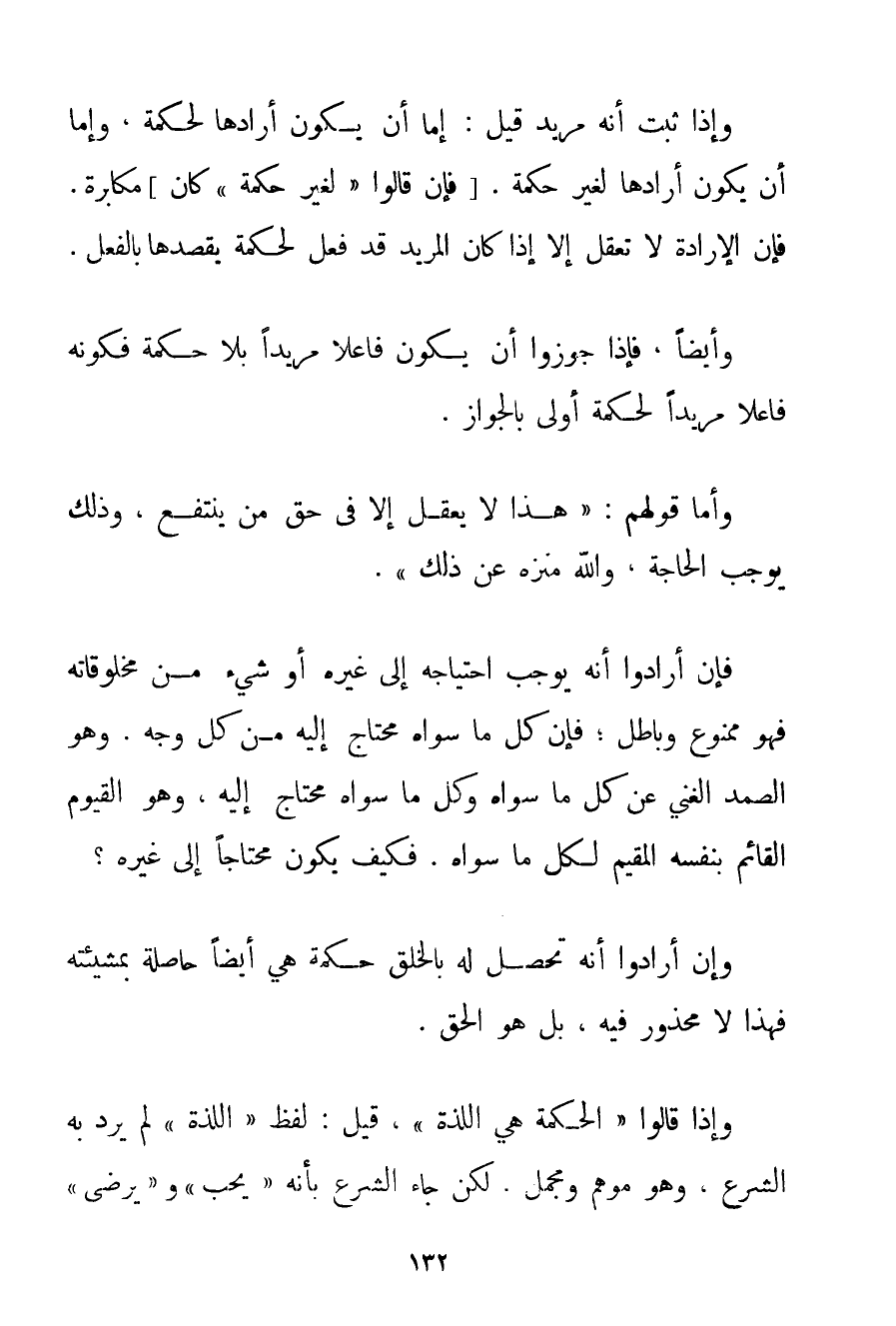 وَإِذَا ثَبَتَ أَنَّهُ مُرِيدٌ قِيلَ: إمَّا أَنْ يَكُونَ أَرَادَهَا لِحِكْمَةِ وَإِمَّا أَنْ يَكُونَ أَرَادَهَا لِغَيْرِ حِكْمَةٍ. فَإِنْ قَالُوا " لِغَيْرِ حِكْمَةٍ " كَانَ مُكَابَرَةً. فَإِنَّ الْإِرَادَةَ لَا تُعْقَلُ إلَّا إذَا كَانَ الْمُرِيدُ قَدْ فَعَلَ لِحِكْمَةِ يَقْصِدُهَا بِالْفِعْلِ. وَأَيْضًا فَإِذَا جَوَّزُوا أَنْ يَكُونَ فَاعِلًا مُرِيدًا بِلَا حِكْمَةٍ فَكَوْنُهُ فَاعِلًا مُرِيدًا لِحِكْمَةِ أَوْلَى بِالْجَوَازِ. وَأَمَّا قَوْلُهُمْ: " هَذَا لَا يُعْقَلُ إلَّا فِي حَقِّ مَنْ يَنْتَفِعُ وَذَلِكَ يُوجِبُ الْحَاجَةَ وَاَللَّهُ مُنَزَّهٌ عَنْ ذَلِكَ ". فَإِنْ أَرَادُوا أَنَّهُ يُوجِبُ احْتِيَاجَهُ إلَى غَيْرِهِ أَوْ شَيْءٍ مِنْ مَخْلُوقَاتِهِ فَهُوَ مَمْنُوعٌ وَبَاطِلٌ؛ فَإِنَّ كُلَّ مَا سِوَاهُ مُحْتَاجٌ إلَيْهِ مِنْ كُلِّ وَجْهٍ. وَهُوَ الصَّمَدُ الْغَنِيُّ عَنْ كُلِّ مَا سِوَاهُ وَكُلُّ مَا سِوَاهُ مُحْتَاجٌ إلَيْهِ وَهُوَ الْقَيُّومُ الْقَائِمُ بِنَفْسِهِ الْمُقِيمُ لِكُلِّ مَا سِوَاهُ. فَكَيْفَ يَكُونُ مُحْتَاجًا إلَى غَيْرِهِ؟ وَإِنْ أَرَادُوا أَنَّهُ تَحْصُلُ لَهُ بِالْخَلْقِ حِكْمَةٌ هِيَ أَيْضًا حَاصِلَةٌ بِمَشِيئَتِهِ فَهَذَا لَا مَحْذُورَ فِيهِ بَلْ هُوَ الْحَقُّ. وَإِذَا قَالُوا " الْحِكْمَةُ هِيَ اللَّذَّةُ " قِيلَ: لَفْظُ " اللَّذَّةِ " لَمْ يَرِدْ بِهِ الشَّرْعُ وَهُوَ مُوهِمٌ وَمُجْمَلٌ. لَكِنْ جَاءَ الشَّرْعُ بِأَنَّهُ " يُحِبُّ " و " يَرْضَى "