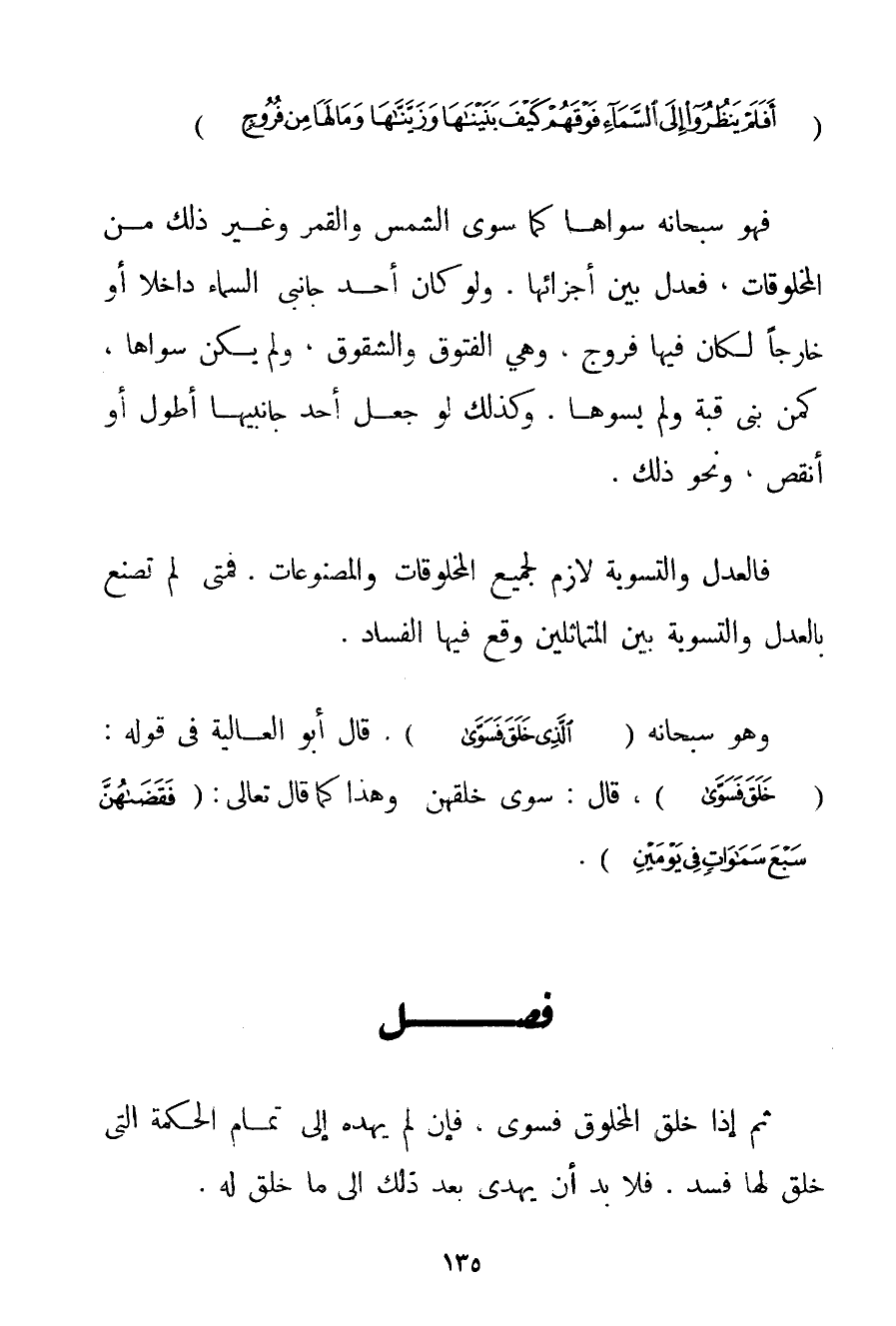 {أَفَلَمْ يَنْظُرُوا إلَى السَّمَاءِ فَوْقَهُمْ كَيْفَ بَنَيْنَاهَا وَزَيَّنَّاهَا وَمَا لَهَا مِنْ فُرُوجٍ} فَهُوَ سُبْحَانَهُ سَوَّاهَا كَمَا سَوَّى الشَّمْسَ وَالْقَمَرَ وَغَيْرَ ذَلِكَ مِنْ الْمَخْلُوقَاتِ فَعَدَلَ بَيْنَ أَجْزَائِهَا. وَلَوْ كَانَ أَحَدُ جَانِبَيْ السَّمَاءِ دَاخِلًا أَوْ خَارِجًا لَكَانَ فِيهَا فُرُوجٌ وَهِيَ الْفُتُوقُ وَالشُّقُوقُ وَلَمْ يَكُنْ سَوَّاهَا كَمَنْ بَنَى قُبَّةً وَلَمْ يُسَوِّهَا. وَكَذَلِكَ لَوْ جَعَلَ أَحَدَ جَانِبَيْهَا أَطْوَلَ أَوْ أَنْقَصَ وَنَحْوَ ذَلِكَ. فَالْعَدْلُ وَالتَّسْوِيَةُ لَازِمٌ لِجَمِيعِ الْمَخْلُوقَاتِ وَالْمَصْنُوعَاتِ. فَمَتَى لَمْ تُصْنَعْ بِالْعَدْلِ وَالتَّسْوِيَةِ بَيْنَ الْمُتَمَاثِلَيْنِ وَقَعَ فِيهَا الْفَسَادُ. وَهُوَ سُبْحَانَهُ {الَّذِي خَلَقَ فَسَوَّى} . قَالَ أَبُو الْعَالِيَةِ فِي قَوْلِهِ: {خَلَقَ فَسَوَّى} قَالَ: سَوَّى خَلْقَهُنَّ وَهَذَا كَمَا قَالَ تَعَالَى: {فَقَضَاهُنَّ سَبْعَ سَمَاوَاتٍ فِي يَوْمَيْنِ} .