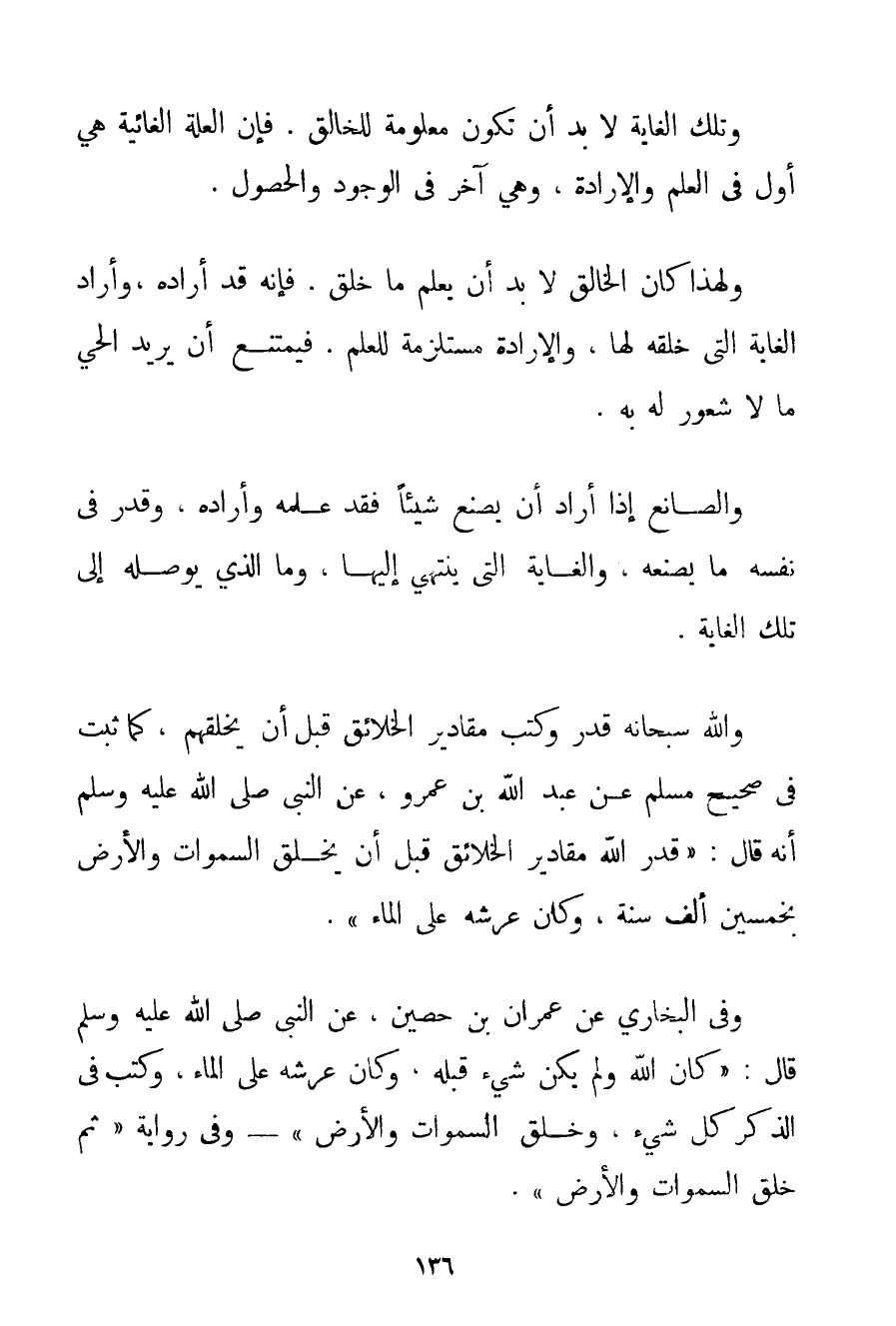 وَتِلْكَ الْغَايَةُ لَا بُدَّ أَنْ تَكُونَ مَعْلُومَةً لِلْخَالِقِ. فَإِنَّ الْعِلَّةَ الغائية هِيَ أَوَّلٌ فِي الْعِلْمِ وَالْإِرَادَةِ وَهِيَ آخِرٌ فِي الْوُجُودِ وَالْحُصُولِ. وَلِهَذَا كَانَ الْخَالِقُ لَا بُدَّ أَنْ يَعْلَمَ مَا خَلَقَ. فَإِنَّهُ قَدْ أَرَادَهُ وَأَرَادَ الْغَايَةَ الَّتِي خَلَقَهُ لَهَا وَالْإِرَادَةُ مُسْتَلْزِمَةٌ لِلْعِلْمِ. فَيَمْتَنِعُ أَنْ يُرِيدَ الْحَيُّ مَا لَا شُعُورَ لَهُ بِهِ. وَالصَّانِعُ إذَا أَرَادَ أَنْ يَصْنَعَ شَيْئًا فَقَدْ عَلِمَهُ وَأَرَادَهُ وَقَدَّرَ فِي نَفْسِهِ مَا يَصْنَعُهُ وَالْغَايَةَ الَّتِي يَنْتَهِي إلَيْهَا وَمَا الَّذِي يُوَصِّلُهُ إلَى تِلْكَ الْغَايَةِ. وَاَللَّهُ سُبْحَانَهُ قَدَّرَ وَكَتَبَ مَقَادِيرَ الْخَلَائِقِ قَبْلَ أَنْ يَخْلُقَهُمْ كَمَا ثَبَتَ فِي صَحِيحِ مُسْلِمٍ عَنْ عَبْدِ اللَّهِ بْنِ عَمْرٍو عَنْ النَّبِيِّ صَلَّى اللَّهُ عَلَيْهِ وَسَلَّمَ أَنَّهُ قَالَ: {قَدَّرَ اللَّهُ مَقَادِيرَ الْخَلَائِقِ قَبْلَ أَنْ يَخْلُقَ السَّمَوَاتِ وَالْأَرْضَ بِخَمْسِينَ أَلْفَ سَنَةٍ وَكَانَ عَرْشُهُ عَلَى الْمَاءِ} . وَفِي الْبُخَارِيِّ عَنْ عُمْرَانَ بْن حُصَيْنٍ عَنْ النَّبِيِّ صَلَّى اللَّهُ عَلَيْهِ وَسَلَّمَ قَالَ: {كَانَ اللَّهُ وَلَمْ يَكُنْ شَيْءٌ قَبْلَهُ وَكَانَ عَرْشُهُ عَلَى الْمَاءِ وَكَتَبَ فِي الذِّكْرِ كُلَّ شَيْءٍ وَخَلَقَ السَّمَوَاتِ وَالْأَرْضَ وَفِي رِوَايَةٍ ثُمَّ خَلَقَ السَّمَوَاتِ وَالْأَرْضَ} .