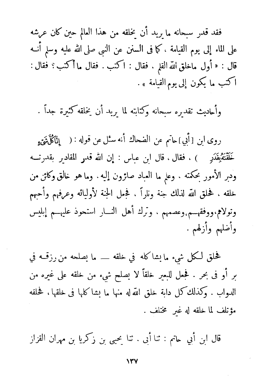 فَقَدْ قَدَّرَ سُبْحَانَهُ مَا يُرِيدُ أَنْ يَخْلُقَهُ مِنْ هَذَا الْعَالَمِ حِين كَانَ عَرْشُهُ عَلَى الْمَاءِ إلَى يَوْمِ الْقِيَامَةِ كَمَا فِي السُّنَنِ عَنْ النَّبِيِّ صَلَّى اللَّهُ عَلَيْهِ وَسَلَّمَ أَنَّهُ قَالَ: {أَوَّلُ مَا خَلَقَ اللَّهُ الْقَلَمَ فَقَالَ: اُكْتُبْ. فَقَالَ مَا أَكْتُبُ؟ فَقَالَ: اُكْتُبْ مَا يَكُونُ إلَى يَوْمِ الْقِيَامَةِ} . وَأَحَادِيثُ تَقْدِيرِهِ سُبْحَانَهُ وَكِتَابَتِهِ لِمَا يُرِيدُ أَنْ يَخْلُقَهُ كَثِيرَةٌ جِدًّا. رَوَى ابْنُ أَبِي حَاتِمٍ عَنْ الضَّحَّاكِ أَنَّهُ سُئِلَ عَنْ قَوْلِهِ: {إنَّا كُلَّ شَيْءٍ خَلَقْنَاهُ بِقَدَرٍ} فَقَالَ قَالَ ابْنُ عَبَّاسٍ: إنَّ اللَّهَ قَدَّرَ الْمَقَادِيرَ بِقُدْرَتِهِ وَدَبَّرَ الْأُمُورَ بِحِكْمَتِهِ وَعَلِمَ مَا الْعِبَادُ صَائِرُونَ إلَيْهِ وَمَا هُوَ خَالِقٌ وَكَائِنٌ مِنْ خَلْقِهِ فَخَلَقَ اللَّهُ لِذَلِكَ جَنَّةً وَنَارًا فَجَعَلَ الْجَنَّةَ لِأَوْلِيَائِهِ وَعَرَّفَهُمْ وَأَحَبَّهُمْ وَتَوَلَّاهُمْ وَوَفَّقَهُمْ وَعَصَمَهُمْ وَتَرَكَ أَهْلَ النَّارِ اسْتَحْوَذَ عَلَيْهِمْ إبْلِيسُ وَأَضَلَّهُمْ وَأَزَلَّهُمْ. فَخَلَقَ لِكُلِّ شَيْءٍ مَا يُشَاكِلُهُ فِي خَلْقِهِ مَا يُصْلِحُهُ مِنْ رِزْقِهِ فِي بَرٍّ أَوْ فِي بَحْرٍ. فَجَعَلَ لِلْبَعِيرِ خَلْقًا لَا يَصْلُحُ شَيْءٌ مِنْ خَلْقِهِ عَلَى غَيْرِهِ مِنْ الدَّوَابِّ. وَكَذَلِكَ كَلُّ دَابَّةٍ خَلَقَ اللَّهُ لَهُ مِنْهَا مَا يُشَاكِلُهَا فِي خَلْقِهَا فَخَلْقُهُ مُؤْتَلِفٌ لِمَا خَلَقَهُ لَهُ غَيْرُ مُخْتَلِفٍ. قَالَ ابْنُ أَبِي حَاتِمٍ: ثَنَا أَبِي ثَنَا يَحْيَى بْنُ زَكَرِيَّا بْنِ مهران الْقَزَّازُ