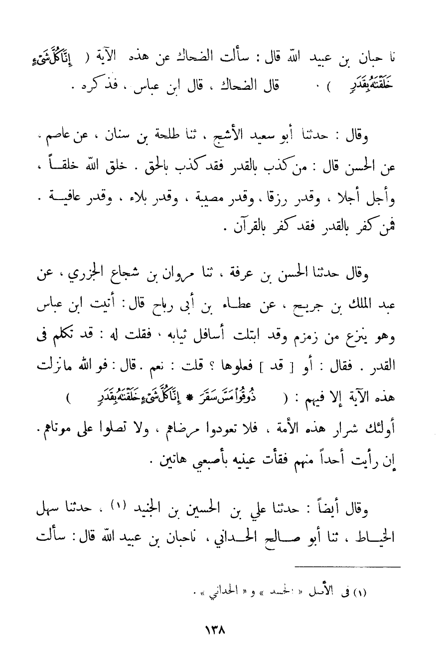 نا حِبَّانُ بْنُ عُبَيْدِ اللَّهِ قَالَ: سَأَلْت الضَّحَّاكَ عَنْ هَذِهِ الْآيَةِ {إنَّا كُلَّ شَيْءٍ خَلَقْنَاهُ بِقَدَرٍ} قَالَ الضَّحَّاكُ قَالَ ابْنُ عَبَّاسٍ فَذَكَرَهُ. وَقَالَ: حَدَّثَنَا أَبُو سَعِيدٍ الْأَشَجُّ ثَنَا طَلْحَةُ بْنُ سِنَانٍ عَنْ عَاصِمٍ عَنْ الْحَسَنِ قَالَ: مَنْ كَذَّبَ بِالْقَدَرِ فَقَدْ كَذَّبَ بِالْحَقِّ. خَلَقَ اللَّهُ خَلْقًا وَأَجَّلَ أَجَلًا وَقَدَّرَ رِزْقًا وَقَدَّرَ مُصِيبَةً وَقَدَّرَ بَلَاءً وَقَدَّرَ عَافِيَةً. فَمَنْ كَفَرَ بِالْقَدَرِ فَقَدْ كَفَرَ بِالْقُرْآنِ. وَقَالَ حَدَّثَنَا الْحَسَنُ بْنُ عَرَفَةَ ثَنَا مَرْوَانُ بْنُ شُجَاعٍ الجزري عَنْ عَبْدِ الْمَلِكِ بْنِ جريح عَنْ عَطَاءِ بْنِ أَبِي رَبَاحٍ قَالَ: أَتَيْت ابْنَ عَبَّاسٍ وَهُوَ يَنْزِعُ مِنْ زَمْزَمَ وَقَدْ ابْتَلَّتْ أَسَافِلُ ثِيَابِهِ فَقُلْت لَهُ: قَدْ تُكُلِّمَ فِي الْقَدَرِ. فَقَالَ: أو قَدْ فَعَلُوهَا؟ قُلْت: نَعَمْ. قَالَ: فَوَاَللَّهِ مَا نَزَلَتْ هَذِهِ الْآيَةُ إلَّا فِيهِمْ: {ذُوقُوا مَسَّ سَقَرَ} {إنَّا كُلَّ شَيْءٍ خَلَقْنَاهُ بِقَدَرٍ} أُولَئِكَ شِرَارُ هَذِهِ الْأُمَّةِ فَلَا تَعُودُوا مَرْضَاهُمْ وَلَا تُصَلُّوا عَلَى مَوْتَاهُمْ. إنْ رَأَيْت أَحَدًا مِنْهُمْ فَقَأْت عَيْنَيْهِ بِأُصْبُعَيَّ هَاتَيْنِ. وَقَالَ أَيْضًا: حَدَّثَنَا عَلِيُّ بْنُ الْحُسَيْنِ بْنِ الْجُنَيْد حَدَّثَنَا سَهْلٌ الْخَيَّاطُ ثَنَا أَبُو صَالِحٍ الحداني نا حِبَّانُ بْنُ عُبَيْدٍ اللَّهِ قَالَ: سَأَلْت