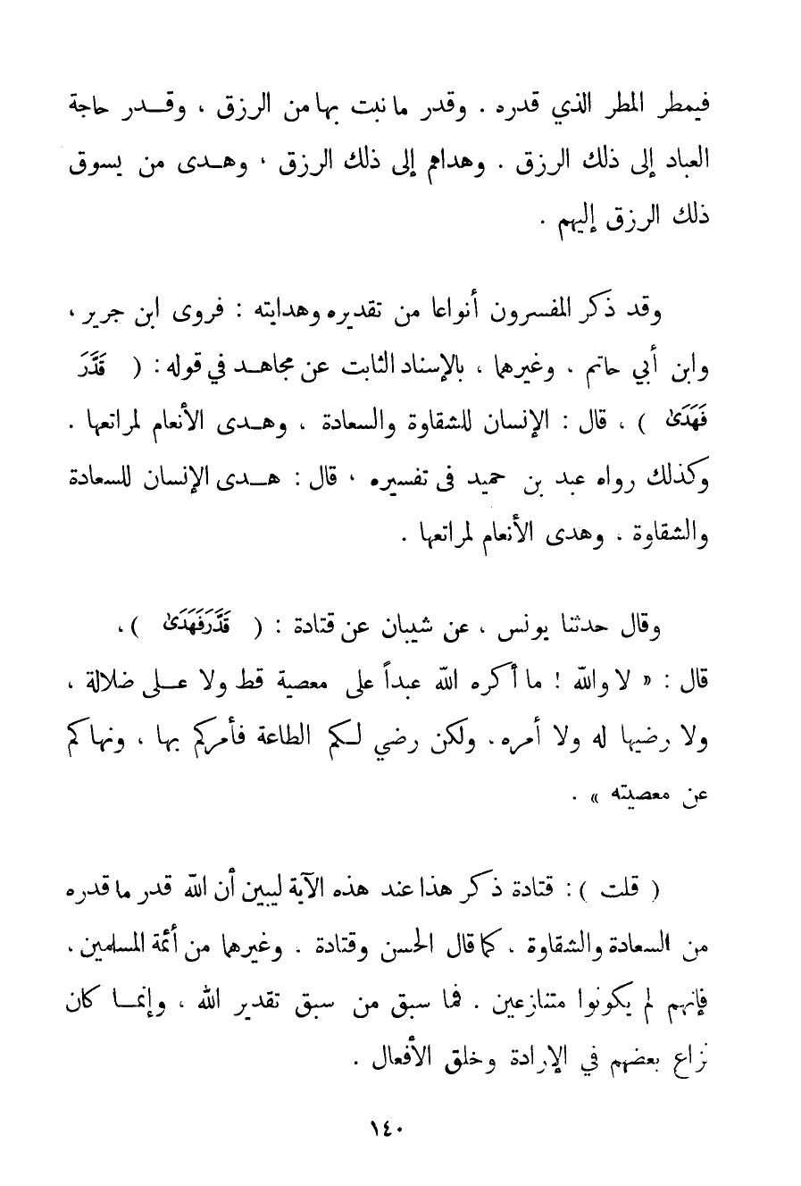 فَيُمْطِرَ الْمَطَرَ الَّذِي قَدَّرَهُ. وَقَدَّرَ مَا نَبَتَ بِهَا مِنْ الرِّزْقِ وَقَدَّرَ حَاجَةَ الْعِبَادِ إلَى ذَلِكَ الرِّزْقِ. وَهَدَاهُمْ إلَى ذَلِكَ الرِّزْقِ وَهَدَى مَنْ يَسُوقُ ذَلِكَ الرِّزْقَ إلَيْهِمْ. وَقَدْ ذَكَرَ الْمُفَسِّرُونَ أَنْوَاعًا مِنْ تَقْدِيرِهِ وَهِدَايَتِهِ: فَرَوَى ابْنُ جَرِيرٍ وَابْنُ أَبِي حَاتِمٍ وَغَيْرُهُمَا بِالْإِسْنَادِ الثَّابِتِ عَنْ مُجَاهِدٍ فِي قَوْلِهِ: {قَدَّرَ فَهَدَى} قَالَ: الْإِنْسَانَ لِلشَّقَاوَةِ وَالسَّعَادَةِ وَهَدَى الْأَنْعَامَ لِمَرَاتِعِهَا. وَكَذَلِكَ رَوَاهُ عَبْدُ بْنُ حميد فِي تَفْسِيرِهِ قَالَ: هَدَى الْإِنْسَانَ لِلسَّعَادَةِ وَالشَّقَاوَةِ وَهَدَى الْأَنْعَامَ لِمَرَاتِعِهَا. وَقَالَ حَدَّثَنَا يُونُسُ عَنْ شيبان عَنْ قتادة: {قَدَّرَ فَهَدَى} قَالَ: " لَا وَاَللَّهِ مَا أَكْرَهَ اللَّهُ عَبْدًا عَلَى مَعْصِيَةٍ قَطُّ وَلَا عَلَى ضَلَالَةٍ وَلَا رَضِيَهَا لَهُ وَلَا أَمَرَهُ وَلَكِنْ رَضِيَ لَكُمْ الطَّاعَةَ فَأَمَرَكُمْ بِهَا وَنَهَاكُمْ عَنْ مَعْصِيَتِهِ ". قُلْت: قتادة ذَكَرَ هَذَا عِنْدَ هَذِهِ الْآيَةِ لِيُبَيِّنَ أَنَّ اللَّهَ قَدَّرَ مَا قَدَّرَهُ مِنْ السَّعَادَةِ وَالشَّقَاوَةِ كَمَا قَالَ الْحَسَنُ وقتادة وَغَيْرُهُمَا مِنْ أَئِمَّةِ الْمُسْلِمِينَ فَإِنَّهُمْ لَمْ يَكُونُوا مُتَنَازِعِينَ. فَمَا سَبَقَ مِنْ سَبْقِ تَقْدِيرِ اللَّهِ وَإِنَّمَا كَانَ نِزَاعُ بَعْضِهِمْ فِي الْإِرَادَةِ وَخَلْقِ الْأَفْعَالِ.