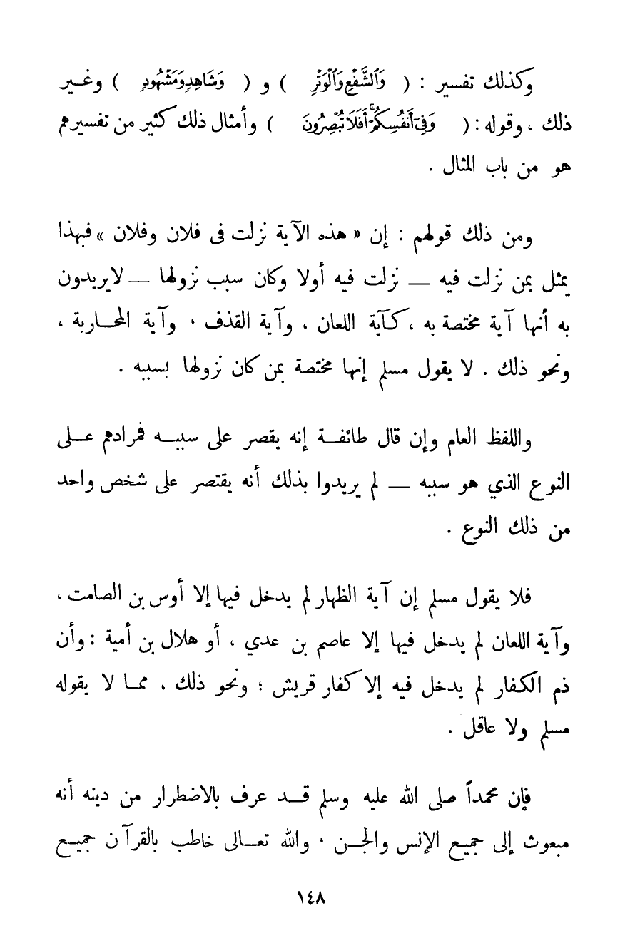 وَكَذَلِكَ تَفْسِيرُ: {وَالشَّفْعِ وَالْوَتْرِ} و {وَشَاهِدٍ وَمَشْهُودٍ} وَغَيْرِ ذَلِكَ وَقَوْلِهِ: {وَفِي أَنْفُسِكُمْ أَفَلَا تُبْصِرُونَ} وَأَمْثَالِ ذَلِكَ كَثِيرٌ مِنْ تَفْسِيرِهِمْ هُوَ مِنْ بَابِ الْمِثَالِ. وَمِنْ ذَلِكَ قَوْلُهُمْ: إنَّ " هَذِهِ الْآيَةَ نَزَلَتْ فِي فُلَانٍ وَفُلَانٍ " فَبِهَذَا يُمَثِّلُ بِمَنْ نَزَلَتْ فِيهِ نَزَلَتْ فِيهِ أَوَّلًا وَكَانَ سَبَبُ نُزُولِهَا لَا يُرِيدُونَ بِهِ أَنَّهَا آيَةٌ مُخْتَصَّةٌ بِهِ كَآيَةِ اللِّعَانِ وَآيَةِ الْقَذْفِ وَآيَةِ الْمُحَارَبَةِ وَنَحْوِ ذَلِكَ. لَا يَقُولُ مُسْلِمٌ إنَّهَا مُخْتَصَّةٌ بِمَنْ كَانَ نُزُولُهَا بِسَبَبِهِ. وَاللَّفْظُ الْعَامُّ وَإِنْ قَالَ طَائِفَةٌ إنَّهُ يُقْصَرُ عَلَى سَبَبِهِ فَمُرَادُهُمْ عَلَى النَّوْعِ الَّذِي هُوَ سَبَبُهُ لَمْ يُرِيدُوا بِذَلِكَ أَنَّهُ يَقْتَصِرُ عَلَى شَخْصٍ وَاحِدٍ مِنْ ذَلِكَ النَّوْعِ. فَلَا يَقُولُ مُسْلِمٌ إنَّ آيَةَ الظِّهَارِ لَمْ يَدْخُلْ فِيهَا إلَّا أَوْسُ بْنُ الصَّامِتِ وَآيَةَ اللِّعَانِ لَمْ يَدْخُلْ فِيهَا إلَّا عَاصِمُ بْنُ عَدِيٍّ أَوْ هِلَالُ بْنُ أُمَيَّةَ: وَأَنَّ ذَمَّ الْكُفَّارِ لَمْ يَدْخُلْ فِيهِ إلَّا كُفَّارُ قُرَيْشٍ؛ وَنَحْوُ ذَلِكَ مِمَّا لَا يَقُولُهُ مُسْلِمٌ وَلَا عَاقِلٌ. فَإِنَّ مُحَمَّدًا صَلَّى اللَّهُ عَلَيْهِ وَسَلَّمَ قَدْ عَرَفَ بِالِاضْطِرَارِ مِنْ دِينِهِ أَنَّهُ مَبْعُوثٌ إلَى جَمِيعِ الْإِنْسِ وَالْجِنِّ وَاَللَّهُ تَعَالَى خَاطَبَ بِالْقُرْآنِ جَمِيعَ