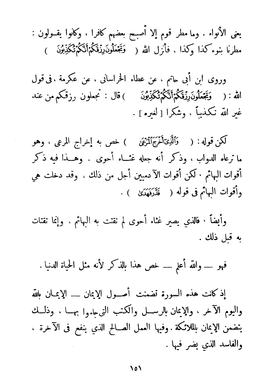 يَعْنِي الْأَنْوَاءَ. وَمَا مُطِرَ قَوْمٌ إلَّا أَصْبَحَ بَعْضُهُمْ كَافِرًا وَكَانُوا يَقُولُونَ: مُطِرْنَا بِنَوْءِ كَذَا وَكَذَا فَأَنْزَلَ اللَّهُ {وَتَجْعَلُونَ رِزْقَكُمْ أَنَّكُمْ تُكَذِّبُونَ} وَرَوَى ابْنُ أَبِي حَاتِمٍ عَنْ عَطَاءٍ الْخُرَاسَانِيِّ عَنْ عِكْرِمَةَ فِي قَوْلِ اللَّهِ: {وَتَجْعَلُونَ رِزْقَكُمْ أَنَّكُمْ تُكَذِّبُونَ} قَالَ: تَجْعَلُونَ رِزْقَكُمْ مِنْ عِنْدِ غَيْرِ اللَّهِ تَكْذِيبًا وَشُكْرًا لِغَيْرِهِ.