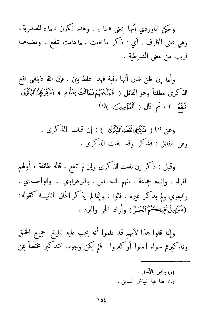 وَهَذِهِ تَكُونُ " مَا " الْمَصْدَرِيَّةُ. وَهِيَ بِمَعْنَى الظَّرْفِ، أَيْ: ذَكِّرْ مَا نَفَعَتْ، مَا دَامَتْ تَنْفَعُ. وَمَعْنَاهَا قَرِيبٌ مِنْ مَعْنَى الشَّرْطِيَّةِ. وَأَمَّا إنْ ظَنَّ ظَانٌّ أَنَّهَا نَافِيَةٌ فَهَذَا غَلَطٌ بَيِّنٌ. فَإِنَّ اللَّهَ لَا يَنْفِي نَفْعَ الذِّكْرَى مُطْلَقًا وَهُوَ الْقَائِلُ {فَتَوَلَّ عَنْهُمْ فَمَا أَنْتَ بِمَلُومِ وَذَكِّرْ فَإِنَّ الذِّكْرَى تَنْفَعُ} ثُمَّ قَالَ {الْمُؤْمِنِينَ} . . . (1) .