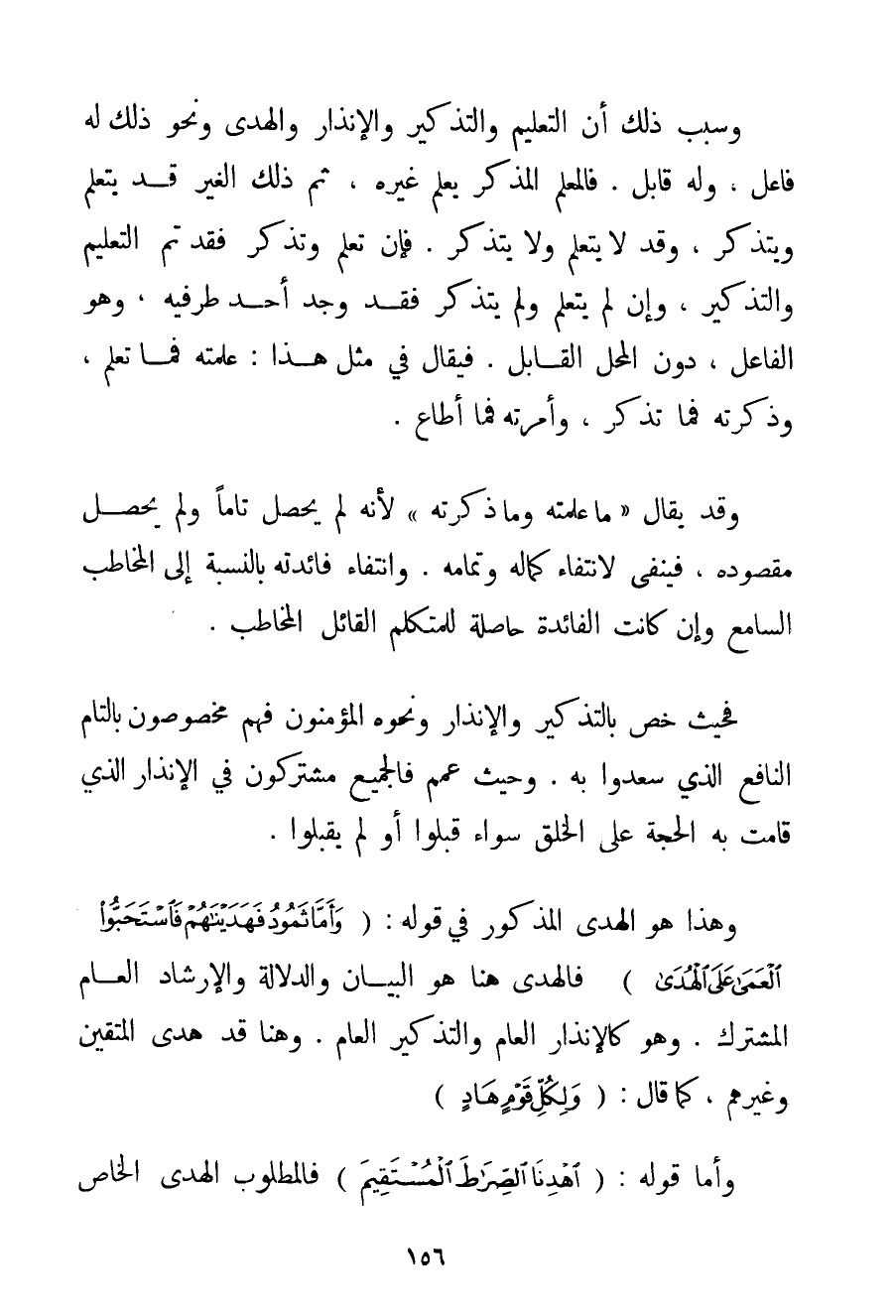 وَسَبَبُ ذَلِكَ أَنَّ التَّعْلِيمَ وَالتَّذْكِيرَ وَالْإِنْذَارَ وَالْهُدَى وَنَحْوَ ذَلِكَ لَهُ فَاعِلٌ وَلَهُ قَابِلٌ. فَالْمُعَلِّمُ الْمُذَكِّرُ يُعَلِّمُ غَيْرَهُ ثُمَّ ذَلِكَ الْغَيْرُ قَدْ يَتَعَلَّمُ وَيَتَذَكَّرُ وَقَدْ لَا يَتَعَلَّمُ وَلَا يَتَذَكَّرُ. فَإِنْ تَعَلَّمَ وَتَذَكَّرَ فَقَدْ تَمَّ التَّعْلِيمُ وَالتَّذْكِيرُ وَإِنْ لَمْ يَتَعَلَّمْ وَلَمْ يَتَذَكَّرْ فَقَدْ وُجِدَ أَحَدُ طَرَفَيْهِ وَهُوَ الْفَاعِلُ دُونَ الْمَحَلِّ الْقَابِلِ. فَيُقَالُ فِي مِثْلِ هَذَا: عَلَّمْته فَمَا تَعَلَّمَ وَذَكَّرْته فَمَا تَذَكَّرَ وَأَمَرْته فَمَا أَطَاعَ. وَقَدْ يُقَالُ " مَا عَلَّمْته وَمَا ذَكَّرْته " لِأَنَّهُ لَمْ يُحَصِّلْ تَامًّا وَلَمْ يُحَصِّلْ مَقْصُودَهُ فَيُنْفَى لِانْتِفَاءِ كَمَالِهِ وَتَمَامِهِ. وَانْتِفَاءِ فَائِدَتِهِ بِالنِّسْبَةِ إلَى الْمُخَاطَبِ السَّامِعِ وَإِنْ كَانَتْ الْفَائِدَةُ حَاصِلَةً لِلْمُتَكَلِّمِ الْقَائِلِ الْمُخَاطَبِ. فَحَيْثُ خُصَّ بِالتَّذْكِيرِ وَالْإِنْذَارِ وَنَحْوِهِ الْمُؤْمِنُونَ فَهُمْ مَخْصُوصُونَ بِالتَّامِّ النَّافِعِ الَّذِي سَعِدُوا بِهِ. وَحَيْثُ عُمِّمَ فَالْجَمِيعُ مُشْتَرِكُونَ فِي الْإِنْذَارِ الَّذِي قَامَتْ بِهِ الْحُجَّةُ عَلَى الْخَلْقِ سَوَاءٌ قَبِلُوا أَوْ لَمْ يَقْبَلُوا.