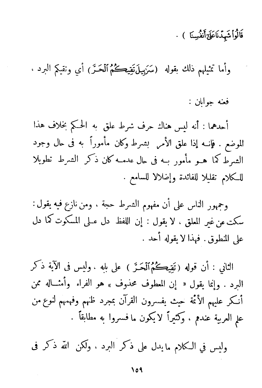 يَقُصُّونَ عَلَيْكُمْ آيَاتِي وَيُنْذِرُونَكُمْ لِقَاءَ يَوْمِكُمْ هَذَا قَالُوا شَهِدْنَا عَلَى أَنْفُسِنَا} . وَأَمَّا تَمْثِيلُهُمْ ذَلِكَ بِقَوْلِهِ {سَرَابِيلَ تَقِيكُمُ الْحَرَّ} أَيْ وَتَقِيَكُمْ الْبَرْد فَعَنْهُ جَوَابَانِ: أَحَدُهُمَا: أَنَّهُ لَيْسَ هُنَاكَ حَرْفُ شَرْطٍ عُلِّقَ بِهِ الْحُكْمُ بِخِلَافِ هَذَا الْمَوْضِعِ. فَإِنَّهُ إذَا عُلِّقَ الْأَمْرُ بِشَرْطِ وَكَانَ مَأْمُورًا بِهِ فِي حَالِ وُجُودِ الشَّرْطِ كَمَا هُوَ مَأْمُورٌ بِهِ فِي حَالِ عَدَمِهِ كَانَ ذِكْرُ الشَّرْطِ تَطْوِيلًا لِلْكَلَامِ تَقْلِيلًا لِلْفَائِدَةِ وَإِضْلَالًا لِلسَّامِعِ. وَجُمْهُورُ النَّاسِ عَلَى أَنَّ مَفْهُومَ الشَّرْطِ حُجَّةٌ وَمَنْ نَازَعَ فِيهِ يَقُولُ: سَكَتَ عَنْ غَيْرِ الْمُعَلَّقِ لَا يَقُولُ: إنَّ اللَّفْظَ دَلَّ عَلَى الْمَسْكُوتِ كَمَا دَلَّ عَلَى الْمَنْطُوقِ. فَهَذَا لَا يَقُولُهُ أَحَدٌ. الثَّانِي: أَنَّ قَوْلَهُ {تَقِيكُمُ الْحَرَّ} عَلَى بَابِهِ وَلَيْسَ فِي الْآيَةِ ذِكْرُ الْبَرْدِ. وَإِنَّمَا يَقُولُ " إنَّ الْمَعْطُوفَ مَحْذُوفٌ " هُوَ الْفَرَّاءُ وَأَمْثَالُهُ مِمَّنْ أَنْكَرَ عَلَيْهِمْ الْأَئِمَّةُ حَيْثُ يُفَسِّرُونَ الْقُرْآنَ بِمُجَرَّدِ ظَنِّهِمْ وَفَهْمِهِمْ لِنَوْعِ مِنْ عِلْمِ الْعَرَبِيَّةِ عِنْدَهُمْ. وَكَثِيرًا لَا يَكُونُ مَا فَسَّرُوا بِهِ مُطَابِقًا. وَلَيْسَ فِي الْكَلَامِ مَا يَدُلُّ عَلَى ذِكْرِ الْبَرْدِ وَلَكِنَّ اللَّهَ ذَكَرَ فِي