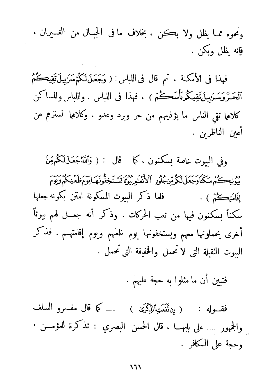 وَنَحْوِهِ مِمَّا يُظِلُّ وَلَا يُكِنُّ بِخِلَافِ مَا فِي الْجِبَالِ مِنْ الْغَيْرَانِ فَإِنَّهُ يُظِلُّ وَيُكَنُّ. فَهَذَا فِي الْأَمْكِنَةِ ثُمَّ قَالَ فِي اللِّبَاسِ: {وَجَعَلَ لَكُمْ سَرَابِيلَ تَقِيكُمُ الْحَرَّ وَسَرَابِيلَ تَقِيكُمْ بَأْسَكُمْ} فَهَذَا فِي اللِّبَاسِ. وَاللِّبَاسُ وَالْمَسَاكِنُ كِلَاهُمَا تَقِي النَّاسَ مَا يُؤْذِيهِمْ مِنْ حَرٍّ وَبَرْدٍ وَعَدُوٍّ وَكِلَاهُمَا تَسْتُرُهُمْ عَنْ أَعْيُنِ النَّاظِرِينَ. وَفِي الْبُيُوتِ خَاصَّةً يَسْكُنُونَ كَمَا قَالَ: {وَاللَّهُ جَعَلَ لَكُمْ مِنْ بُيُوتِكُمْ سَكَنًا وَجَعَلَ لَكُمْ مِنْ جُلُودِ الْأَنْعَامِ بُيُوتًا تَسْتَخِفُّونَهَا يَوْمَ ظَعْنِكُمْ وَيَوْمَ إقَامَتِكُمْ} . فَلَمَّا ذَكَرَ الْبُيُوتَ الْمَسْكُونَةَ امْتَنَّ بِكَوْنِهِ جَعَلَهَا سَكَنًا يَسْكُنُونَ فِيهَا مِنْ تَعَبِ الْحَرَكَاتِ. وَذَكَرَ أَنَّهُ جَعَلَ لَهُمْ بُيُوتًا أُخْرَى يَحْمِلُونَهَا مَعَهُمْ ويستخفونها يَوْمَ ظَعْنِهِمْ وَيَوْمَ إقَامَتِهِمْ. فَذَكَرَ الْبُيُوتَ الثَّقِيلَةَ الَّتِي لَا تُحْمَلُ وَالْخَفِيَّةَ الَّتِي تُحْمَلُ. فَتَبَيَّنَ أَنَّ مَا مَثَّلُوا بِهِ حُجَّةٌ عَلَيْهِمْ. فَقَوْلُهُ: {إنْ نَفَعَتِ الذِّكْرَى} - كَمَا قَالَ مُفَسِّرُو السَّلَفِ وَالْجُمْهُورِ - عَلَى بَابِهَا قَالَ الْحَسَنُ الْبَصْرِيُّ: تَذْكِرَةٌ لِلْمُؤْمِنِ وَحُجَّةٌ عَلَى الْكَافِرِ.