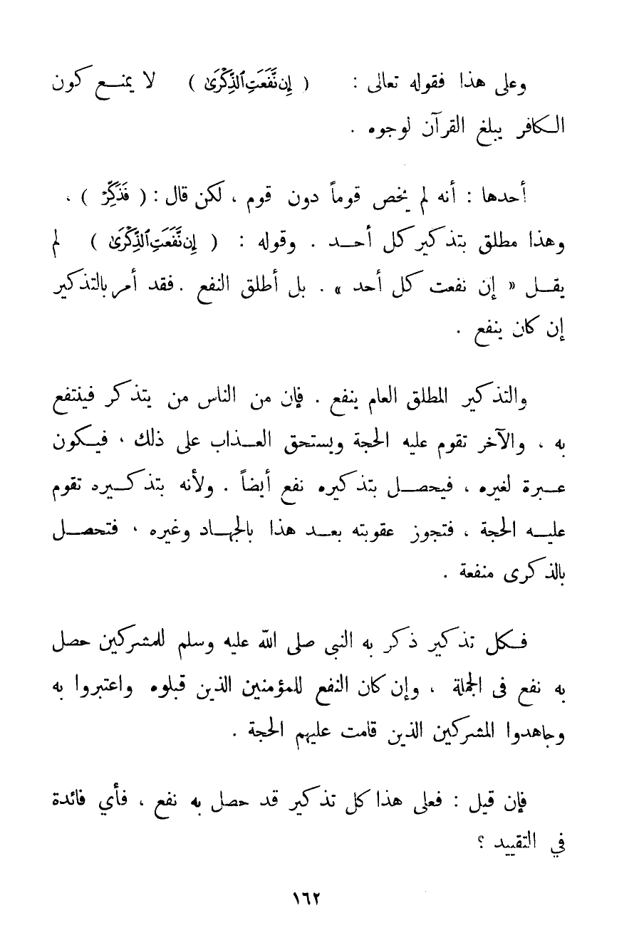 وَعَلَى هَذَا فَقَوْلُهُ تَعَالَى: {إنْ نَفَعَتِ الذِّكْرَى} لَا يَمْنَعُ كَوْنَ الْكَافِرِ يُبَلِّغُ الْقُرْآنَ لِوُجُوهِ. أَحَدُهَا: أَنَّهُ لَمْ يَخُصَّ قَوْمًا دُونَ قَوْمٍ لَكِنْ قَالَ: {فَذَكِّرْ} وَهَذَا مُطْلَقٌ بِتَذْكِيرِ كُلِّ أَحَدٍ. وَقَوْلُهُ: {إنْ نَفَعَتِ الذِّكْرَى} لَمْ يَقُلْ " إنْ نَفَعَتْ كُلَّ أَحَدٍ ". بَلْ أَطْلَقَ النَّفْعَ. فَقَدْ أَمَرَ بِالتَّذْكِيرِ إنْ كَانَ يَنْفَعُ. وَالتَّذْكِيرُ الْمُطْلَقُ الْعَامُّ يَنْفَعُ. فَإِنَّ مِنْ النَّاسِ مَنْ يَتَذَكَّرُ فَيَنْتَفِعُ بِهِ وَالْآخَرُ تَقُومُ عَلَيْهِ الْحُجَّةُ وَيَسْتَحِقُّ الْعَذَابَ عَلَى ذَلِكَ فَيَكُونُ عِبْرَةً لِغَيْرِهِ فَيَحْصُلُ بِتَذْكِيرِهِ نَفْعٌ أَيْضًا. وَلِأَنَّهُ بِتَذْكِيرِهِ تَقُومُ عَلَيْهِ الْحُجَّةُ فَتَجُوزُ عُقُوبَتُهُ بَعْدَ هَذَا بِالْجِهَادِ وَغَيْرِهِ فَتَحْصُلُ بِالذِّكْرَى مَنْفَعَةٌ. فَكُلُّ تَذْكِيرٍ ذَكَّرَ بِهِ النَّبِيُّ صَلَّى اللَّهُ عَلَيْهِ وَسَلَّمَ لِلْمُشْرِكِينَ حَصَلَ بِهِ نَفْعٌ فِي الْجُمْلَةِ وَإِنْ كَانَ النَّفْعُ لِلْمُؤْمِنِينَ الَّذِينَ قَبِلُوهُ وَاعْتَبَرُوا بِهِ وَجَاهَدُوا الْمُشْرِكِينَ الَّذِينَ قَامَتْ عَلَيْهِمْ الْحُجَّةُ. فَإِنْ قِيلَ: فَعَلَى هَذَا كُلُّ تَذْكِيرٍ قَدْ حَصَلَ بِهِ نَفْعٌ فَأَيُّ فَائِدَةٍ فِي التَّقْيِيدِ؟