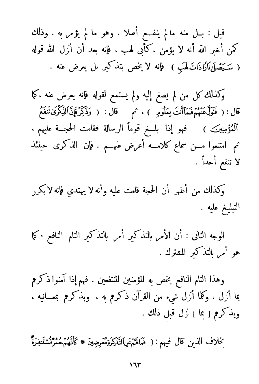 قِيلَ: بَلْ مِنْهُ مَا لَمْ يَنْفَعْ أَصْلًا وَهُوَ مَا لَمْ يُؤْمَرْ بِهِ. وَذَلِكَ كَمَنْ أَخْبَرَ اللَّهُ أَنَّهُ لَا يُؤْمِنُ كَأَبِي لَهَبٍ فَإِنَّهُ بَعْدَ أَنْ أَنْزَلَ اللَّهُ قَوْلَهُ {سَيَصْلَى نَارًا ذَاتَ لَهَبٍ} فَإِنَّهُ لَا يُخَصُّ بِتَذْكِيرِ بَلْ يُعْرَضُ عَنْهُ. وَكَذَلِكَ كُلُّ مَنْ لَمْ يَصْغَ إلَيْهِ وَلَمْ يَسْتَمِعْ لِقَوْلِهِ فَإِنَّهُ يُعْرَضُ عَنْهُ كَمَا قَالَ: {فَتَوَلَّ عَنْهُمْ فَمَا أَنْتَ بِمَلُومٍ} ثُمَّ قَالَ: {وَذَكِّرْ فَإِنَّ الذِّكْرَى تَنْفَعُ الْمُؤْمِنِينَ} فَهُوَ إذَا بَلَّغَ قَوْمًا الرِّسَالَةَ فَقَامَتْ الْحُجَّةُ عَلَيْهِمْ ثُمَّ امْتَنَعُوا مِنْ سَمَاعِ كَلَامِهِ أَعْرَضَ عَنْهُمْ. فَإِنَّ الذِّكْرَى حِينَئِذٍ لَا تَنْفَعُ أَحَدًا. وَكَذَلِكَ مَنْ أَظْهَرَ أَنَّ الْحُجَّةَ قَامَتْ عَلَيْهِ وَأَنَّهُ لَا يَهْتَدِي فَإِنَّهُ لَا يُكَرِّرُ التَّبْلِيغَ عَلَيْهِ. الْوَجْهُ الثَّانِي: أَنَّ الْأَمْرَ بِالتَّذْكِيرِ أَمْرٌ بِالتَّذْكِيرِ التَّامِّ النَّافِعِ كَمَا هُوَ أَمْرٌ بِالتَّذْكِيرِ الْمُشْتَرَكِ. وَهَذَا التَّامُّ النَّافِعُ يَخُصُّ بِهِ الْمُؤْمِنِينَ الْمُنْتَفِعِينَ. فَهُمْ إذَا آمَنُوا ذَكَّرَهُمْ بِمَا أَنْزَلَ وَكُلَّمَا أُنْزِلَ شَيْءٌ مِنْ الْقُرْآنِ ذَكَّرَهُمْ بِهِ وَيُذَكِّرُهُمْ بِمَعَانِيهِ وَيُذَكِّرُهُمْ بِمَا نَزَلَ قَبْلَ ذَلِكَ. بِخِلَافِ الَّذِينَ قَالَ فِيهِمْ: {فَمَا لَهُمْ عَنِ التَّذْكِرَةِ مُعْرِضِينَ} {كَأَنَّهُمْ