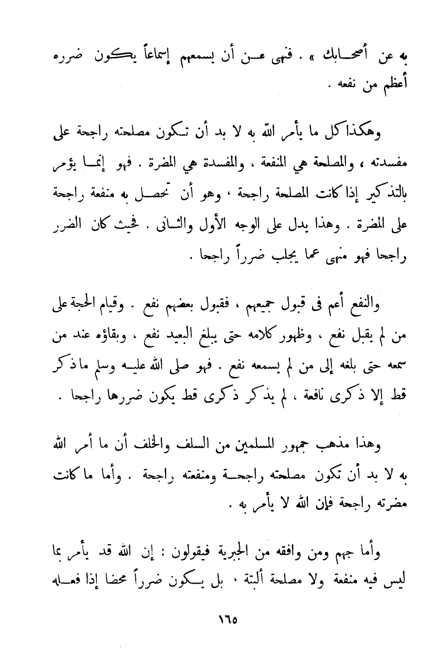 بِهِ عَنْ أَصْحَابِك} . فَنَهَى عَنْ أَنْ يُسْمِعَهُمْ إسْمَاعًا يَكُونُ ضَرَرُهُ أَعْظَمَ مِنْ نَفْعِهِ. وَهَكَذَا كُلُّ مَا يَأْمُرُ اللَّهُ بِهِ لَا بُدَّ أَنْ تَكُونَ مَصْلَحَتُهُ رَاجِحَةً عَلَى مَفْسَدَتِهِ وَالْمَصْلَحَةُ هِيَ الْمَنْفَعَةُ وَالْمَفْسَدَةُ هِيَ الْمَضَرَّةُ. فَهُوَ إنَّمَا يُؤْمَرُ بِالتَّذْكِيرِ إذَا كَانَتْ الْمَصْلَحَةُ رَاجِحَةً وَهُوَ أَنْ تَحْصُلَ بِهِ مَنْفَعَةٌ رَاجِحَةٌ عَلَى الْمَضَرَّةِ. وَهَذَا يَدُلُّ عَلَى الْوَجْهِ الْأَوَّلِ وَالثَّانِي. فَحَيْثُ كَانَ الضَّرَرُ رَاجِحًا فَهُوَ مَنْهِيٌّ عَمَّا يَجْلِبُ ضَرَرًا رَاجِحًا. وَالنَّفْعُ أَعَمُّ فِي قَبُولِ جَمِيعِهِمْ فَقَبُولُ بَعْضِهِمْ نَفْعٌ وَقِيَامُ الْحُجَّةِ عَلَى مَنْ لَمْ يَقْبَلْ نَفْعٌ وَظُهُورُ كَلَامِهِ حَتَّى يُبَلِّغَ الْبَعِيدَ نَفْعٌ وَبَقَاؤُهُ عِنْدَ مَنْ سَمِعَهُ حَتَّى بَلَّغَهُ إلَى مَنْ لَمْ يَسْمَعْهُ نَفْعٌ. فَهُوَ صَلَّى اللَّهُ عَلَيْهِ وَسَلَّمَ مَا ذَكَّرَ قَطُّ إلَّا ذِكْرَى نَافِعَةً لَمْ يُذَكِّرْ ذِكْرَى قَطُّ يَكُونُ ضَرَرُهَا رَاجِحًا. وَهَذَا مَذْهَبُ جُمْهُورِ الْمُسْلِمِينَ مِنْ السَّلَفِ وَالْخَلَفِ أَنَّ مَا أَمَرَ اللَّهُ بِهِ لَا بُدَّ أَنْ تَكُونَ مَصْلَحَتُهُ رَاجِحَةً وَمَنْفَعَتُهُ رَاجِحَةً. وَأَمَّا مَا كَانَتْ مُضَرَّتُهُ رَاجِحَةً فَإِنَّ اللَّهَ لَا يَأْمُرُ بِهِ. وَأَمَّا جَهْمٌ وَمَنْ وَافَقَهُ مِنْ الْجَبْرِيَّةِ فَيَقُولُونَ: إنَّ اللَّهَ قَدْ يَأْمُرُ بِمَا لَيْسَ فِيهِ مَنْفَعَةٌ وَلَا مَصْلَحَةٌ أَلْبَتَّةَ بَلْ يَكُونُ ضَرَرًا مَحْضًا إذَا فَعَلَهُ