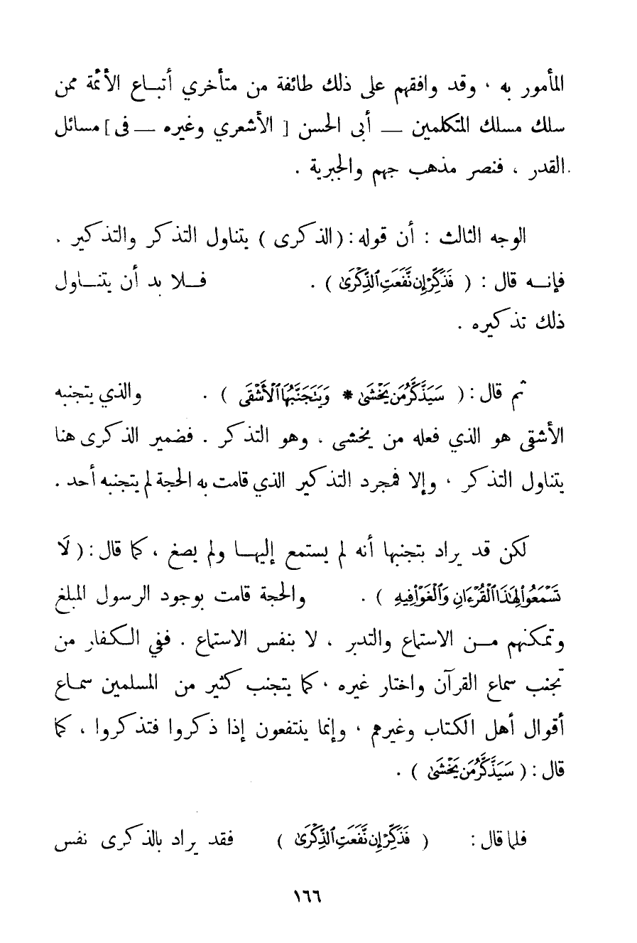 الْمَأْمُورُ بِهِ وَقَدْ وَافَقَهُمْ عَلَى ذَلِكَ طَائِفَةٌ مِنْ مُتَأَخِّرِي أَتْبَاعِ الْأَئِمَّةِ مِمَّنْ سَلَكَ مَسْلَكَ الْمُتَكَلِّمِينَ - أَبِي الْحَسَنِ الْأَشْعَرِيِّ وَغَيْرِهِ فِي مَسَائِلِ الْقَدَرِ فَنَصَرَ مَذْهَبَ جَهْمٍ وَالْجَبْرِيَّةِ. الْوَجْهُ الثَّالِثُ: أَنَّ قَوْلَهُ: {الذِّكْرَى} يَتَنَاوَلُ التَّذَكُّرَ وَالتَّذْكِيرَ. فَإِنَّهُ قَالَ: {فَذَكِّرْ إنْ نَفَعَتِ الذِّكْرَى} . فَلَا بُدَّ أَنْ يَتَنَاوَلَ ذَلِكَ تَذْكِيرَهُ.