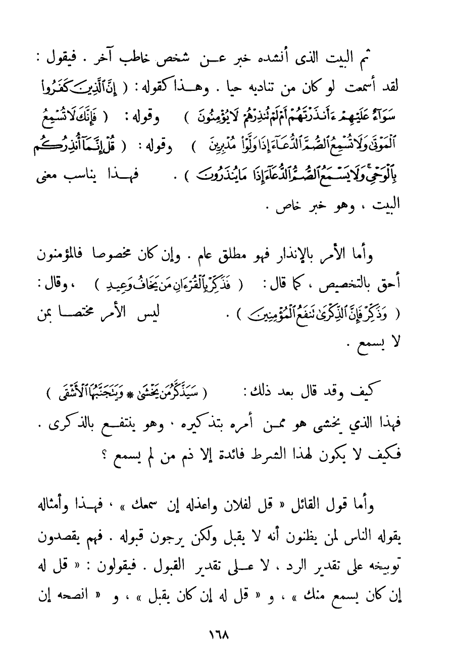 ثُمَّ الْبَيْتُ الَّذِي أَنْشَدَهُ خَبَرٌ عَنْ شَخْصٍ خَاطَبَ آخَرَ. فَيَقُولُ: لَقَدْ أَسْمَعْت لَوْ كَانَ مَنْ تُنَادِيهِ حَيًّا. وَهَذَا كَقَوْلِهِ: {إنَّ الَّذِينَ كَفَرُوا سَوَاءٌ عَلَيْهِمْ أَأَنْذَرْتَهُمْ أَمْ لَمْ تُنْذِرْهُمْ لَا يُؤْمِنُونَ} وَقَوْلِهِ: {إنَّكَ لَا تُسْمِعُ الْمَوْتَى وَلَا تُسْمِعُ الصُّمَّ الدُّعَاءَ إذَا وَلَّوْا مُدْبِرِينَ} وَقَوْلِهِ: {قُلْ إنَّمَا أُنْذِرُكُمْ بِالْوَحْيِ وَلَا يَسْمَعُ الصُّمُّ الدُّعَاءَ إذَا مَا يُنْذَرُونَ} . فَهَذَا يُنَاسِبُ مَعْنَى الْبَيْتِ وَهُوَ خَبَرٌ خَاصٌّ. وَأَمَّا الْأَمْرُ بِالْإِنْذَارِ فَهُوَ مُطْلَقٌ عَامٌّ. وَإِنْ كَانَ مَخْصُوصًا فَالْمُؤْمِنُونَ أَحَقُّ بِالتَّخْصِيصِ كَمَا قَالَ: {فَذَكِّرْ بِالْقُرْآنِ مَنْ يَخَافُ وَعِيدِ} وَقَالَ: {وَذَكِّرْ فَإِنَّ الذِّكْرَى تَنْفَعُ الْمُؤْمِنِينَ} . لَيْسَ الْأَمْرُ مُخْتَصًّا بِمَنْ لَا يَسْمَعُ. كَيْفَ وَقَدْ قَالَ بَعْدَ ذَلِكَ: {سَيَذَّكَّرُ مَنْ يَخْشَى} {وَيَتَجَنَّبُهَا الْأَشْقَى} فَهَذَا الَّذِي يَخْشَى هُوَ مِمَّنْ أَمَرَهُ بِتَذْكِيرِهِ وَهُوَ يَنْتَفِعُ بِالذِّكْرَى. فَكَيْفَ لَا يَكُونُ لِهَذَا الشَّرْطِ فَائِدَةٌ إلَّا ذَمَّ مَنْ لَمْ يَسْمَعْ؟ وَأَمَّا قَوْلُ الْقَائِلِ " قُلْ لِفُلَانِ وَاعْذِلْهُ إنْ سَمِعَك " فَهَذَا وَأَمْثَالُهُ يَقُولُهُ النَّاسُ لِمَنْ يَظُنُّونَ أَنَّهُ لَا يَقْبَلُ وَلَكِنْ يَرْجُونَ قَبُولَهُ. فَهُمْ يَقْصِدُونَ تَوْبِيخَهُ عَلَى تَقْدِيرِ الرَّدِّ لَا عَلَى تَقْدِيرِ الْقَبُولِ. فَيَقُولُونَ: " قُلْ لَهُ إنْ كَانَ يَسْمَعُ مِنْك " و " قُلْ لَهُ إنْ كَانَ يَقْبَلُ " و " انْصَحْهُ إنْ