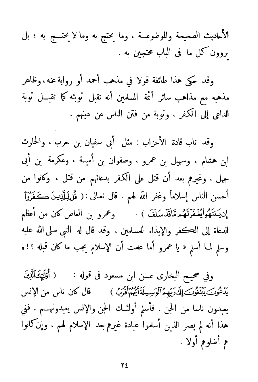 الْأَحَادِيثِ الصَّحِيحَةِ وَالْمَوْضُوعَةِ وَمَا يُحْتَجُّ بِهِ وَمَا لَا يُحْتَجُّ بِهِ؛ بَلْ يَرْوُونَ كُلَّ مَا فِي الْبَابِ مُحْتَجِّينَ بِهِ. وَقَدْ حَكَى هَذَا طَائِفَةٌ قَوْلًا فِي مَذْهَبِ أَحْمَد أَوْ رِوَايَةً عَنْهُ وَظَاهِرُ مَذْهَبِهِ مَعَ مَذَاهِبِ سَائِرِ أَئِمَّةِ الْمُسْلِمِينَ أَنَّهُ تُقْبَلُ تَوْبَتُهُ كَمَا تُقْبَلُ تَوْبَةُ الدَّاعِي إلَى الْكُفْرِ وَتَوْبَةُ مَنْ فَتَنَ النَّاسَ عَنْ دِينِهِمْ. وَقَدْ تَابَ قَادَةُ الْأَحْزَابِ: مِثْلُ أَبِي سُفْيَانَ بْنِ حَرْبٍ وَالْحَارِثِ ابْنِ هِشَامٍ وَسُهَيْلِ بْنِ عَمْرٍو وَصَفْوَانَ بْنِ أُمَيَّةَ وَعِكْرِمَةَ بْنِ أَبِي جَهْلٍ وَغَيْرِهِمْ بَعْدَ أَنْ قُتِلَ عَلَى الْكُفْرِ بِدُعَائِهِمْ مَنْ قُتِلَ وَكَانُوا مَنْ أَحْسَنِ النَّاسِ إسْلَامًا وَغَفَرَ اللَّهُ لَهُمْ. قَالَ تَعَالَى: {قُلْ لِلَّذِينَ كَفَرُوا إنْ يَنْتَهُوا يُغْفَرْ لَهُمْ مَا قَدْ سَلَفَ} . وَعَمْرُو بْنُ العاص كَانَ مِنْ أَعْظَمِ الدُّعَاةِ إلَى الْكُفْرِ وَالْإِيذَاءِ لِلْمُسْلِمِينَ وَقَدْ قَالَ لَهُ النَّبِيُّ صَلَّى اللَّهُ عَلَيْهِ وَسَلَّمَ لَمَّا أَسْلَمَ {يَا عَمْرُو أَمَا عَلِمْت أَنَّ الْإِسْلَامَ يَجُبُّ مَا كَانَ قَبْلَهُ} وَفِي صَحِيحِ الْبُخَارِيِّ عَنْ ابْنِ مَسْعُودٍ فِي قَوْلِهِ: {أُولَئِكَ الَّذِينَ يَدْعُونَ يَبْتَغُونَ إلَى رَبِّهِمُ الْوَسِيلَةَ أَيُّهُمْ أَقْرَبُ} قَالَ كَانَ نَاسٌ مِنْ الْإِنْسِ يَعْبُدُونَ نَاسًا مِنْ الْجِنِّ فَأَسْلَمَ أُولَئِكَ الْجِنُّ وَالْإِنْسُ يَعْبُدُونَهُمْ. فَفِي هَذَا أَنَّهُ لَمْ يَضُرَّ الَّذِينَ أَسْلَمُوا عِبَادَةَ غَيْرِهِمْ بَعْدَ الْإِسْلَامِ لَهُمْ وَإِنْ كَانُوا هُمْ أَضَلُّوهُمْ أَوَّلًا.