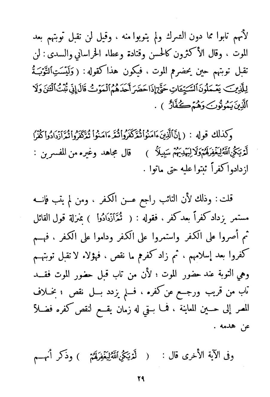 لِأَنَّهُمْ تَابُوا مِمَّا دُونَ الشِّرْكِ وَلَمْ يَتُوبُوا مِنْهُ وَقِيلَ لَنْ تُقْبَلَ تَوْبَتُهُمْ بَعْدَ الْمَوْتِ وَقَالَ الْأَكْثَرُونَ كَالْحَسَنِ وقتادة وَعَطَاءٍ الْخُرَاسَانِيِّ والسدي: لَنْ تُقْبَلَ تَوْبَتُهُمْ حِينَ يَحْضُرُهُمْ الْمَوْتُ فَيَكُونُ هَذَا كَقَوْلِهِ: {وَلَيْسَتِ التَّوْبَةُ لِلَّذِينَ يَعْمَلُونَ السَّيِّئَاتِ حَتَّى إذَا حَضَرَ أَحَدَهُمُ الْمَوْتُ قَالَ إنِّي تُبْتُ الْآنَ وَلَا الَّذِينَ يَمُوتُونَ وَهُمْ كُفَّارٌ} . وَكَذَلِكَ قَوْلُهُ: {إنَّ الَّذِينَ آمَنُوا ثُمَّ كَفَرُوا ثُمَّ آمَنُوا ثُمَّ كَفَرُوا ثُمَّ ازْدَادُوا كُفْرًا لَمْ يَكُنِ اللَّهُ لِيَغْفِرَ لَهُمْ وَلَا لِيَهْدِيَهُمْ سَبِيلًا} قَالَ مُجَاهِدٌ وَغَيْرُهُ مِنْ الْمُفَسِّرِينَ: ازْدَادُوا كُفْرًا ثَبَتُوا عَلَيْهِ حَتَّى مَاتُوا. قُلْت: وَذَلِكَ لِأَنَّ التَّائِبَ رَاجِعٌ عَنْ الْكُفْرِ وَمَنْ لَمْ يَتُبْ فَإِنَّهُ مُسْتَمِرٌّ يَزْدَادُ كُفْرًا بَعْدَ كُفْرٍ فَقَوْلُهُ: {ثُمَّ ازْدَادُوا} بِمَنْزِلَةِ قَوْلِ الْقَائِلِ ثُمَّ أَصَرُّوا عَلَى الْكُفْرِ وَاسْتَمَرُّوا عَلَى الْكُفْرِ وَدَامُوا عَلَى الْكُفْرِ فَهُمْ كَفَرُوا بَعْدَ إسْلَامِهِمْ ثُمَّ زَادَ كُفْرُهُمْ مَا نَقَصَ فَهَؤُلَاءِ لَا تُقْبَلُ تَوْبَتُهُمْ وَهِيَ التَّوْبَةُ عِنْدَ حُضُورِ الْمَوْتِ؛ لِأَنَّ مَنْ تَابَ قَبْلَ حُضُورِ الْمَوْتِ فَقَدْ تَابَ مِنْ قَرِيبٍ وَرَجَعَ عَنْ كُفْرِهِ فَلَمْ يَزْدَدْ بَلْ نَقَصَ؛ بِخِلَافِ الْمُصِرِّ إلَى حِينِ الْمُعَايَنَةِ فَمَا بَقِيَ لَهُ زَمَانٌ يَقَعُ لِنَقْصِ كُفْرِهِ فَضْلًا عَنْ هَدْمِهِ. وَفِي الْآيَةِ الْأُخْرَى قَالَ: {لَمْ يَكُنِ اللَّهُ لِيَغْفِرَ لَهُمْ} وَذَكَرَ أَنَّهُمْ