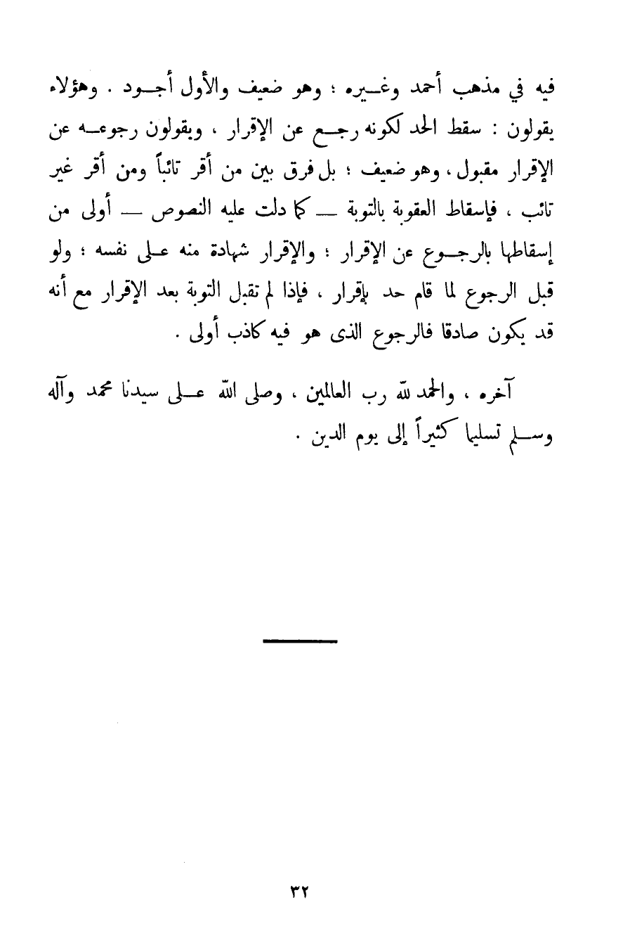 فِيهِ فِي مَذْهَبِ أَحْمَد وَغَيْرِهِ؛ وَهُوَ ضَعِيفٌ وَالْأَوَّلُ أَجْوَدُ. وَهَؤُلَاءِ يَقُولُونَ: سَقَطَ الْحَدُّ لِكَوْنِهِ رَجَعَ عَنْ الْإِقْرَارِ وَيَقُولُونَ رُجُوعُهُ عَنْ الْإِقْرَارِ مَقْبُولٌ وَهُوَ ضَعِيفٌ؛ بَلْ فَرْقٌ بَيْنَ مَنْ أَقَرَّ تَائِبًا وَمَنْ أَقَرَّ غَيْرَ تَائِبٍ فَإِسْقَاطُ الْعُقُوبَةِ بِالتَّوْبَةِ - كَمَا دَلَّتْ عَلَيْهِ النُّصُوصُ - أَوْلَى مِنْ إسْقَاطِهَا بِالرُّجُوعِ عَنْ الْإِقْرَارِ؛ وَالْإِقْرَارُ شَهَادَةٌ مِنْهُ عَلَى نَفْسِهِ؛ وَلَوْ قَبِلَ الرُّجُوعَ لَمَا قَامَ حَدٌّ بِإِقْرَارِ فَإِذَا لَمْ تُقْبَلْ التَّوْبَةُ بَعْدَ الْإِقْرَارِ مَعَ أَنَّهُ قَدْ يَكُونُ صَادِقًا فَالرُّجُوعُ الَّذِي هُوَ فِيهِ كَاذِبٌ أَوْلَى. آخِرُهُ وَالْحَمْدُ لِلَّهِ رَبِّ الْعَالَمِينَ وَصَلَّى اللَّهُ عَلَى سَيِّدِنَا مُحَمَّدٍ وَآلِهِ وَسَلَّمَ تَسْلِيمًا كَثِيرًا إلَى يَوْمِ الدِّينِ.
