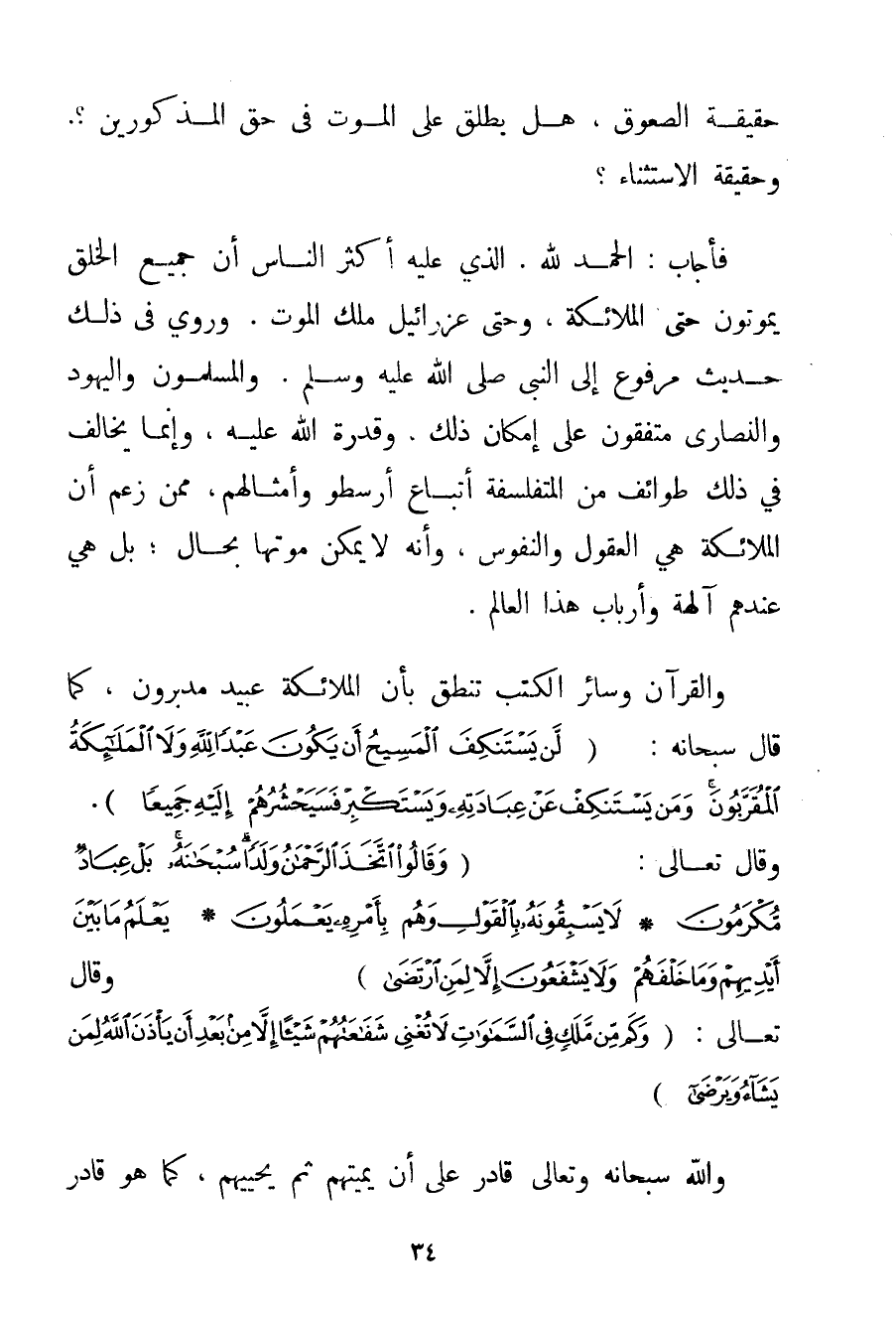 الْحَمْدُ لِلَّهِ، الَّذِي عَلَيْهِ أَكْثَرُ النَّاسِ أَنَّ جَمِيعَ الْخَلْقِ يَمُوتُونَ حَتَّى الْمَلَائِكَةُ وَحَتَّى عِزْرَائِيلُ مَلَكُ الْمَوْتِ. وَرُوِيَ فِي ذَلِكَ حَدِيثٌ مَرْفُوعٌ إلَى النَّبِيِّ صَلَّى اللَّهُ عَلَيْهِ وَسَلَّمَ. وَالْمُسْلِمُونَ وَالْيَهُودُ وَالنَّصَارَى مُتَّفِقُونَ عَلَى إمْكَانِ ذَلِكَ وَقُدْرَةِ اللَّهِ عَلَيْهِ وَإِنَّمَا يُخَالِفُ فِي ذَلِكَ طَوَائِفُ مِنْ الْمُتَفَلْسِفَةِ أَتْبَاعِ أَرِسْطُو وَأَمْثَالِهِمْ مِمَّنْ زَعَمَ أَنَّ الْمَلَائِكَةَ هِيَ الْعُقُولُ وَالنُّفُوسُ وَأَنَّهُ لَا يُمْكِنُ مَوْتُهَا بِحَالِ؛ بَلْ هِيَ عِنْدَهُمْ آلِهَةُ وَأَرْبَابُ هَذَا الْعَالَمِ. وَالْقُرْآنُ وَسَائِرُ الْكُتُبِ تَنْطِقُ بِأَنَّ الْمَلَائِكَةَ عَبِيدٌ مدبرون كَمَا قَالَ سُبْحَانَهُ: {لَنْ يَسْتَنْكِفَ الْمَسِيحُ أَنْ يَكُونَ عَبْدًا لِلَّهِ وَلَا الْمَلَائِكَةُ الْمُقَرَّبُونَ وَمَنْ يَسْتَنْكِفْ عَنْ عِبَادَتِهِ وَيَسْتَكْبِرْ فَسَيَحْشُرُهُمْ إلَيْهِ جَمِيعًا} . وَقَالَ تَعَالَى: {وَقَالُوا اتَّخَذَ الرَّحْمَنُ وَلَدًا سُبْحَانَهُ بَلْ عِبَادٌ مُكْرَمُونَ} {لَا يَسْبِقُونَهُ بِالْقَوْلِ وَهُمْ بِأَمْرِهِ يَعْمَلُونَ} {يَعْلَمُ مَا بَيْنَ أَيْدِيهِمْ وَمَا خَلْفَهُمْ وَلَا يَشْفَعُونَ إلَّا لِمَنِ ارْتَضَى} وَقَالَ تَعَالَى: {وَكَمْ مِنْ مَلَكٍ فِي السَّمَاوَاتِ لَا تُغْنِي شَفَاعَتُهُمْ شَيْئًا إلَّا مِنْ بَعْدِ أَنْ يَأْذَنَ اللَّهُ لِمَنْ يَشَاءُ وَيَرْضَى} . وَاَللَّهُ سُبْحَانَهُ وَتَعَالَى قَادِرٌ عَلَى أَنْ يُمِيتَهُمْ ثُمَّ يُحْيِيَهُمْ كَمَا هُوَ قَادِرٌ