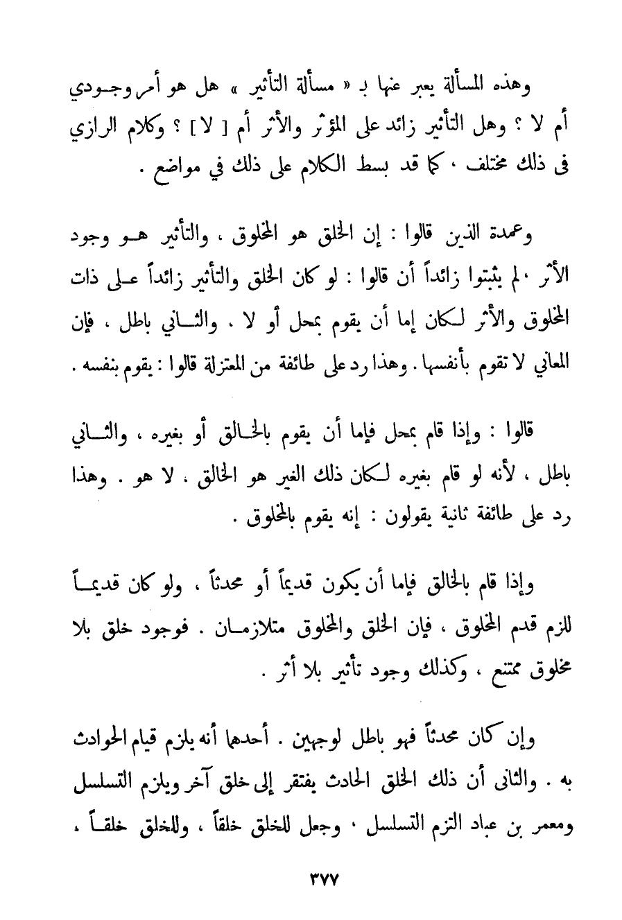 وَهَذِهِ الْمَسْأَلَةُ يُعَبَّرُ عَنْهَا بـ " مَسْأَلَةِ التَّأْثِيرِ " هَلْ هُوَ أَمْرٌ وُجُودِيٌّ أَمْ لَا؟ وَهَلْ التَّأْثِيرُ زَائِدٌ عَلَى الْمُؤَثِّرِ وَالْأَثَرِ أَمْ لَا؟ وَكَلَامُ الرَّازِي فِي ذَلِكَ مُخْتَلِفٌ كَمَا قَدْ بُسِطَ الْكَلَامُ عَلَى ذَلِكَ فِي مَوَاضِعَ. وَعُمْدَةُ الَّذِينَ قَالُوا: إنَّ الْخَلْقَ هُوَ الْمَخْلُوقُ وَالتَّأْثِيرَ هُوَ وُجُودُ الْأَثَرِ لَمْ يُثْبِتُوا زَائِدًا أَنْ قَالُوا: لَوْ كَانَ الْخَلْقُ وَالتَّأْثِيرُ زَائِدًا عَلَى ذَاتِ الْمَخْلُوقِ وَالْأَثَرِ لَكَانَ إمَّا أَنْ يَقُومَ بِمَحَلِّ أَوْ لَا وَالثَّانِي بَاطِلٌ فَإِنَّ الْمَعَانِيَ لَا تَقُومُ بِأَنْفُسِهَا. وَهَذَا رَدٌّ عَلَى طَائِفَةٍ مِنْ الْمُعْتَزِلَةِ قَالُوا: يَقُومُ بِنَفْسِهِ. قَالُوا: وَإِذَا قَامَ بِمَحَلِّ فَإِمَّا أَنْ يَقُومَ بِالْخَالِقِ أَوْ بِغَيْرِهِ وَالثَّانِي بَاطِلٌ لِأَنَّهُ لَوْ قَامَ بِغَيْرِهِ لَكَانَ ذَلِكَ الْغَيْرُ هُوَ الْخَالِقَ لَا هُوَ. وَهَذَا رَدٌّ عَلَى طَائِفَةٍ ثَانِيَةٍ يَقُولُونَ: إنَّهُ يَقُومُ بِالْمَخْلُوقِ. وَإِذَا قَامَ بِالْخَالِقِ فَإِمَّا أَنْ يَكُونَ قَدِيمًا أَوْ مُحْدَثًا وَلَوْ كَانَ قَدِيمًا لَلَزِمَ قِدَمُ الْمَخْلُوقِ فَإِنَّ الْخَلْقَ وَالْمَخْلُوقَ مُتَلَازِمَانِ. فَوُجُودُ خَلْقٍ بِلَا مَخْلُوقٍ مُمْتَنِعٌ وَكَذَلِكَ وُجُودُ تَأْثِيرٍ بِلَا أَثَرٍ. وَإِنْ كَانَ مُحْدِثًا فَهُوَ بَاطِلٌ لِوَجْهَيْنِ. أَحَدُهُمَا أَنَّهُ يَلْزَمُ قِيَامُ الْحَوَادِثِ بِهِ. وَالثَّانِي أَنَّ ذَلِكَ الْخَلْقَ الْحَادِثَ يَفْتَقِرُ إلَى خَلْقٍ آخَرَ وَيَلْزَمُ التَّسَلْسُلُ وَمَعْمَرُ بْنُ عَبَّادٍ الْتَزَمَ التَّسَلْسُلَ وَجَعَلَ لِلْخَلْقِ خَلْقًا وَلِلْخَلْقِ خَلْقًا