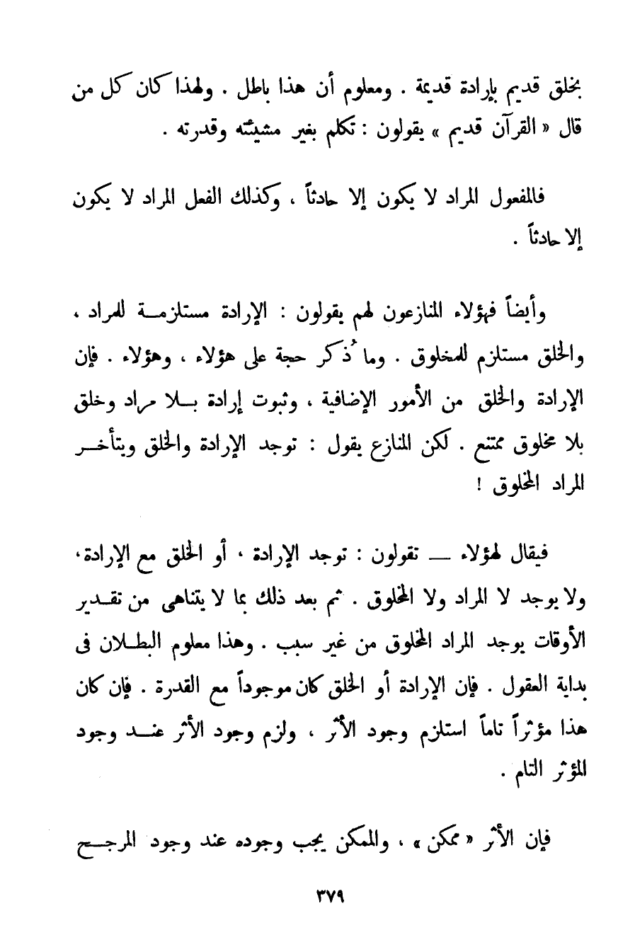 بِخَلْقِ قَدِيمٍ بِإِرَادَةِ قَدِيمَةٍ. وَمَعْلُومٌ أَنَّ هَذَا بَاطِلٌ. وَلِهَذَا كَانَ كُلُّ مَنْ قَالَ " الْقُرْآنُ قَدِيمٌ " يَقُولُونَ: تَكَلَّمَ بِغَيْرِ مَشِيئَتِهِ وَقُدْرَتِهِ. فَالْمَفْعُولُ الْمُرَادُ لَا يَكُونُ إلَّا حَادِثًا وَكَذَلِكَ الْفِعْلُ الْمُرَادُ لَا يَكُونُ إلَّا حَادِثًا. وَأَيْضًا فَهَؤُلَاءِ الْمُنَازِعُونَ لَهُمْ يَقُولُونَ: الْإِرَادَةُ مُسْتَلْزِمَةٌ لِلْمُرَادِ وَالْخَلْقُ مُسْتَلْزِمٌ لِلْمَخْلُوقِ. وَمَا ذُكِرَ حُجَّةٌ عَلَى هَؤُلَاءِ وَهَؤُلَاءِ. فَإِنَّ الْإِرَادَةَ وَالْخَلْقَ مِنْ الْأُمُورِ الْإِضَافِيَّةِ وَثُبُوتُ إرَادَةٍ بِلَا مُرَادٍ وَخَلْقٌ بِلَا مَخْلُوقٍ مُمْتَنِعٌ. لَكِنَّ الْمُنَازِعَ يَقُولُ: تُوجَدُ الْإِرَادَةُ وَالْخَلْقُ وَيَتَأَخَّرُ الْمُرَادُ الْمَخْلُوقُ فَيُقَالُ لِهَؤُلَاءِ تَقُولُونَ: تُوجَدُ الْإِرَادَةُ أَوْ الْخَلْقُ مَعَ الْإِرَادَةِ وَلَا يُوجَدُ لَا الْمُرَادُ وَلَا الْمَخْلُوقُ. ثُمَّ بَعْدَ ذَلِكَ بِمَا لَا يَتَنَاهَى مِنْ تَقْدِيرِ الْأَوْقَاتِ يُوجَدُ الْمُرَادُ الْمَخْلُوقُ مِنْ غَيْرِ سَبَبٍ. وَهَذَا مَعْلُومُ الْبُطْلَانِ فِي بِدَايَةِ الْعُقُولِ. فَإِنَّ الْإِرَادَةَ أَوْ الْخَلْقَ كَانَ مَوْجُودًا مَعَ الْقُدْرَةِ. فَإِنْ كَانَ هَذَا مُؤَثِّرًا تَامًّا اسْتَلْزَمَ وُجُودَ الْأَثَرِ وَلَزِمَ وُجُودُ الْأَثَرِ عِنْدَ وُجُودِ الْمُؤَثِّرِ التَّامِّ. فَإِنَّ الْأَثَرَ " مُمْكِنٌ " وَالْمُمْكِنُ يَجِبُ وُجُودُهُ عِنْدَ وُجُودِ الْمُرَجِّحِ