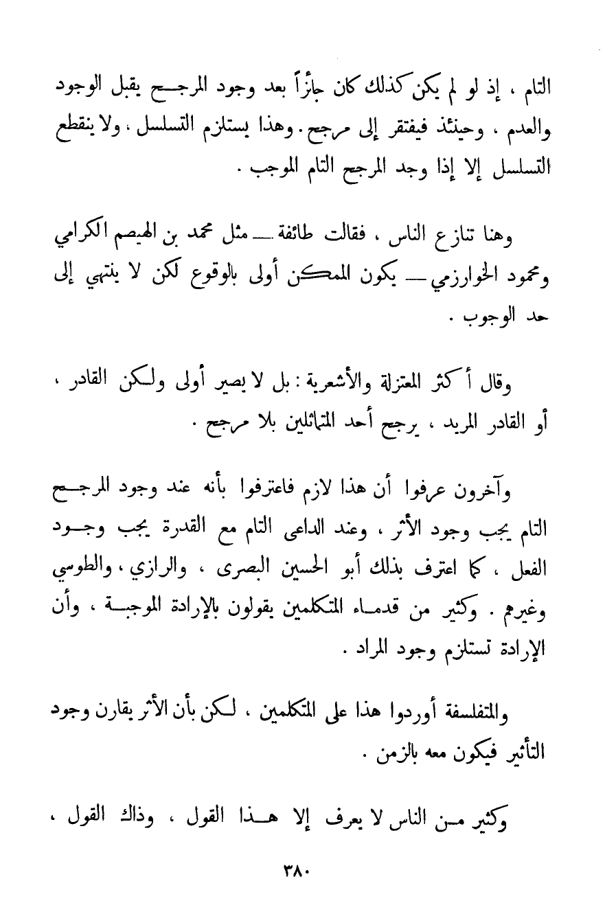 وَهُنَا تَنَازَعَ النَّاسُ فَقَالَتْ طَائِفَةٌ مِثْلُ مُحَمَّدِ بْنِ الْهَيْصَمِ الكرامي وَمَحْمُودٍ الْخَوَارِزْمِيّ يَكُونُ الْمُمْكِنُ أَوْلَى بِالْوُقُوعِ لَكِنْ لَا يَنْتَهِي إلَى حَدِّ الْوُجُوبِ. وَقَالَ أَكْثَرُ الْمُعْتَزِلَةِ وَالْأَشْعَرِيَّةِ: بَلْ لَا يَصِيرُ أَوْلَى وَلَكِنَّ الْقَادِرَ أَوْ الْقَادِرَ الْمُرِيدَ يُرَجِّحُ أَحَدَ الْمُتَمَاثِلَيْنِ بِلَا مُرَجِّحٍ. وَآخَرُونَ عَرَفُوا أَنَّ هَذَا لَازِمٌ فَاعْتَرَفُوا بِأَنَّهُ عِنْدَ وُجُودِ الْمُرَجِّحِ التَّامِّ يَجِبُ وُجُودُ الْأَثَرِ وَعِنْدَ الدَّاعِي التَّامِّ مَعَ الْقُدْرَةِ يَجِبُ وُجُودُ الْفِعْلِ كَمَا اعْتَرَفَ بِذَلِكَ أَبُو الْحُسَيْنِ الْبَصْرِيُّ وَالرَّازِي والطوسي وَغَيْرُهُمْ. وَكَثِيرٌ مِنْ قُدَمَاءِ الْمُتَكَلِّمِينَ يَقُولُونَ بِالْإِرَادَةِ الْمُوجِبَةِ وَأَنَّ الْإِرَادَةَ تَسْتَلْزِمُ وُجُودَ الْمُرَادِ. والمتفلسفة أَوْرَدُوا هَذَا عَلَى الْمُتَكَلِّمِينَ لَكِنْ بِأَنَّ الْأَثَرَ يُقَارِنُ وُجُودَ التَّأْثِيرِ فَيَكُونُ مَعَهُ بِالزَّمَنِ. وَكَثِيرٌ مِنْ النَّاسِ لَا يَعْرِفُ إلَّا هَذَا الْقَوْلَ وَذَاكَ الْقَوْلُ