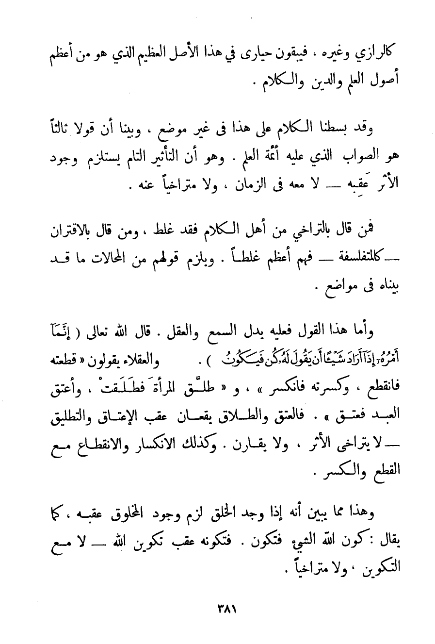 كالرَّازِي وَغَيْرِهِ فَيَبْقَوْنَ حَيَارَى فِي هَذَا الْأَصْلِ الْعَظِيمِ الَّذِي هُوَ مِنْ أَعْظَمِ أُصُولِ الْعِلْمِ وَالدِّينِ وَالْكَلَامِ. وَقَدْ بَسَطْنَا الْكَلَامَ عَلَى هَذَا فِي غَيْرِ مَوْضِعٍ وَبَيَّنَّا أَنَّ قَوْلًا ثَالِثًا هُوَ الصَّوَابُ الَّذِي عَلَيْهِ أَئِمَّةُ الْعِلْمِ. وَهُوَ أَنَّ التَّأْثِيرَ التَّامَّ يَسْتَلْزِمُ وُجُودَ الْأَثَرِ عَقِبَهُ لَا مَعَهُ فِي الزَّمَانِ وَلَا مُتَرَاخِيًا عَنْهُ. فَمَنْ قَالَ بِالتَّرَاخِي مِنْ أَهْلِ الْكَلَامِ فَقَدْ غَلِطَ وَمَنْ قَالَ بِالِاقْتِرَانِ كالمتفلسفة فَهُمْ أَعْظَمُ غَلَطًا. وَيَلْزَمُ قَوْلُهُمْ مِنْ الْمُحَالَاتِ مَا قَدْ بَيَّنَّاهُ فِي مَوَاضِعَ. وَأَمَّا هَذَا الْقَوْلُ فَعَلَيْهِ يَدُلُّ السَّمْعُ وَالْعَقْلُ. قَالَ اللَّهُ تَعَالَى {إنَّمَا أَمْرُهُ إذَا أَرَادَ شَيْئًا أَنْ يَقُولَ لَهُ كُنْ فَيَكُونُ} . وَالْعُقَلَاءُ يَقُولُونَ " قَطَّعْته فَانْقَطَعَ وَكَسَّرْته فَانْكَسَرَ " و " طَلَّقَ الْمَرْأَةَ فَطَلَقَتْ وَأَعْتَقَ الْعَبْدَ فَعَتَقَ ". فَالْعِتْقُ وَالطَّلَاقُ يَقَعَانِ عَقِبَ الْإِعْتَاقِ وَالتَّطْلِيقِ لَا يَتَرَاخَى الْأَثَرُ وَلَا يُقَارَنُ. وَكَذَلِكَ الِانْكِسَارُ وَالِانْقِطَاعُ مَعَ الْقَطْعِ وَالْكَسْرِ. وَهَذَا مِمَّا يُبَيِّنُ أَنَّهُ إذَا وُجِدَ الْخَلْقُ لَزِمَ وُجُودُ الْمَخْلُوقِ عَقِبَهُ كَمَا يُقَالُ: كَوْنُ اللَّهِ الشَّيْءَ فَتَكُونُ. فَتَكُونُهُ عَقِبَ تَكْوِينِ اللَّهِ لَا مَعَ التَّكْوِينِ وَلَا مُتَرَاخِيًا.