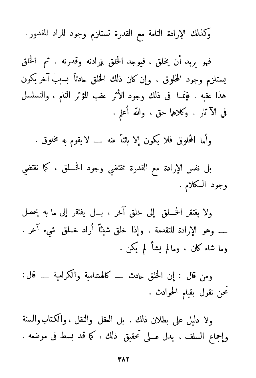 وَكَذَلِكَ الْإِرَادَةُ التَّامَّةُ مَعَ الْقُدْرَةِ تَسْتَلْزِمُ وُجُودَ الْمُرَادِ الْمَقْدُورِ. فَهُوَ يُرِيدُ أَنْ يَخْلُقَ فَيُوجَدُ الْخَلْقُ بِإِرَادَتِهِ وَقُدْرَتِهِ. ثُمَّ الْخَلْقُ يَسْتَلْزِمُ وُجُودَ الْمَخْلُوقِ وَإِنْ كَانَ ذَلِكَ الْخَلْقُ حَادِثًا بِسَبَبِ آخَرَ يَكُونُ هَذَا عَقِبَهُ. فَإِنَّمَا فِي ذَلِكَ وُجُودُ الْأَثَرِ عَقِبَ الْمُؤَثِّرِ التَّامِّ وَالتَّسَلْسُلِ فِي الْآثَارِ. وَكِلَاهُمَا حَقٌّ وَاَللَّهُ أَعْلَمُ. وَأَمَّا الْمَخْلُوقُ فَلَا يَكُونُ إلَّا بَائِنًا عَنْهُ لَا يَقُومُ بِهِ مَخْلُوقٌ. بَلْ نَفْسُ الْإِرَادَةِ مَعَ الْقُدْرَةِ تَقْتَضِي وُجُودَ الْخَلْقِ كَمَا تَقْتَضِي وُجُودَ الْكَلَامِ. وَلَا يَفْتَقِرُ الْخَلْقُ إلَى خَلْقٍ آخَرَ بَلْ يَفْتَقِرُ إلَى مَا بِهِ يَحْصُلُ وَهُوَ الْإِرَادَةُ الْمُتَقَدِّمَةُ. وَإِذَا خَلَقَ شَيْئًا أَرَادَ خَلْقَ شَيْءٍ آخَرَ وَمَا شَاءَ كَانَ وَمَا لَمْ يَشَأْ لَمْ يَكُنْ. وَمَنْ قَالَ: إنَّ الْخَلْقَ حَادِثٌ كالهشامية والكَرَّامِيَة قَالَ: نَحْنُ نَقُولُ بِقِيَامِ الْحَوَادِثِ. وَلَا دَلِيلَ عَلَى بُطْلَانِ ذَلِكَ. بَلْ الْعَقْلُ وَالنَّقْلُ وَالْكِتَابُ وَالسُّنَّةُ وَإِجْمَاعُ السَّلَفِ يَدُلُّ عَلَى تَحْقِيقِ ذَلِكَ كَمَا قَدْ بُسِطَ فِي مَوْضِعِهِ.