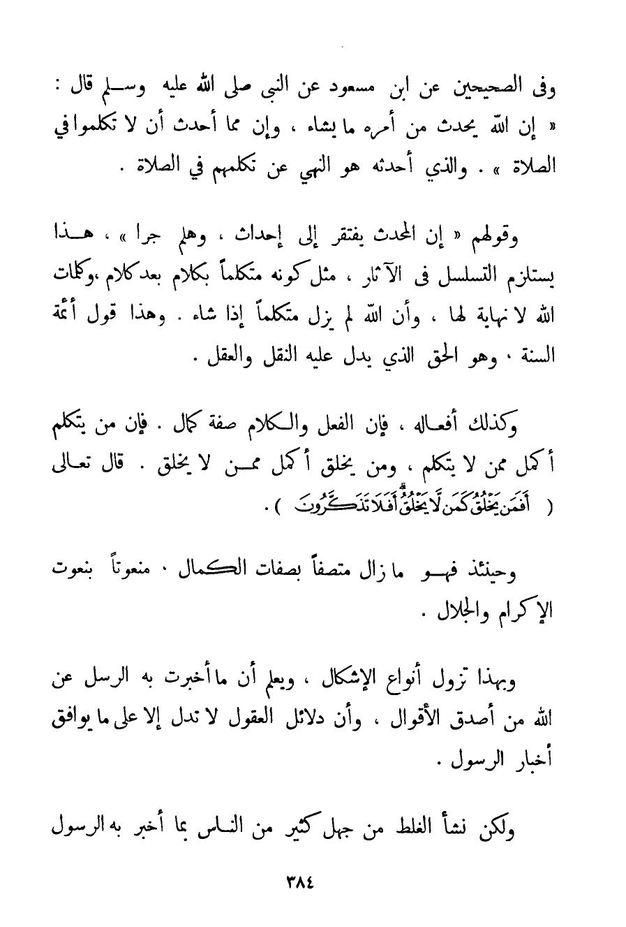 وَفِي الصَّحِيحَيْنِ عَنْ ابْنِ مَسْعُودٍ عَنْ النَّبِيِّ صَلَّى اللَّهُ عَلَيْهِ وَسَلَّمَ قَالَ. {إنَّ اللَّهَ يُحْدِثُ مِنْ أَمْرِهِ مَا يَشَاءُ وَإِنَّ مِمَّا أَحْدَثَ أَنْ لَا تَكَلَّمُوا فِي الصَّلَاةِ} . وَاَلَّذِي أَحْدَثَهُ هُوَ النَّهْيُ عَنْ تَكَلُّمِهِمْ فِي الصَّلَاةِ. وَقَوْلُهُمْ " إنَّ الْمُحْدَثَ يَفْتَقِرُ إلَى إحْدَاثٍ وَهَلُمَّ جَرًّا " هَذَا يَسْتَلْزِمُ التَّسَلْسُلَ فِي الْآثَارِ مِثْلُ كَوْنِهِ مُتَكَلِّمًا بِكَلَامِ بَعْدَ كَلَامٍ وَكَلِمَاتُ اللَّهِ لَا نِهَايَةَ لَهَا وَأَنَّ اللَّهَ لَمْ يَزَلْ مُتَكَلِّمًا إذَا شَاءَ. وَهَذَا قَوْلُ أَئِمَّةِ السُّنَّةِ وَهُوَ الْحَقُّ الَّذِي يَدُلُّ عَلَيْهِ النَّقْلُ وَالْعَقْلُ. وَكَذَلِكَ أَفْعَالُهُ فَإِنَّ الْفِعْلَ وَالْكَلَامَ صِفَةُ كَمَالٍ. فَإِنَّ مَنْ يَتَكَلَّمُ أَكْمَلُ مِمَّنْ لَا يَتَكَلَّمُ وَمَنْ يَخْلُقُ أَكْمَلُ مِمَّنْ لَا يَخْلُقُ. قَالَ تَعَالَى {أَفَمَنْ يَخْلُقُ كَمَنْ لَا يَخْلُقُ أَفَلَا تَذَكَّرُونَ} . وَحِينَئِذٍ فَهُوَ مَا زَالَ مُتَّصِفًا بِصِفَاتِ الْكَمَالِ مَنْعُوتًا بِنُعُوتِ الْإِكْرَامِ وَالْجَلَالِ. وَبِهَذَا تَزُولُ أَنْوَاعُ الْإِشْكَالِ وَيُعْلَمُ أَنَّ مَا أَخْبَرَتْ بِهِ الرُّسُلُ عَنْ اللَّهِ مِنْ أَصْدَقِ الْأَقْوَالِ وَأَنَّ دَلَائِلَ الْعُقُولِ لَا تَدُلُّ إلَّا عَلَى مَا يُوَافِقُ أَخْبَارَ الرَّسُولِ. وَلَكِنْ نَشَأَ الْغَلَطُ مِنْ جَهْلِ كَثِيرٍ مِنْ النَّاسِ بِمَا أَخْبَرَ بِهِ الرَّسُولُ
