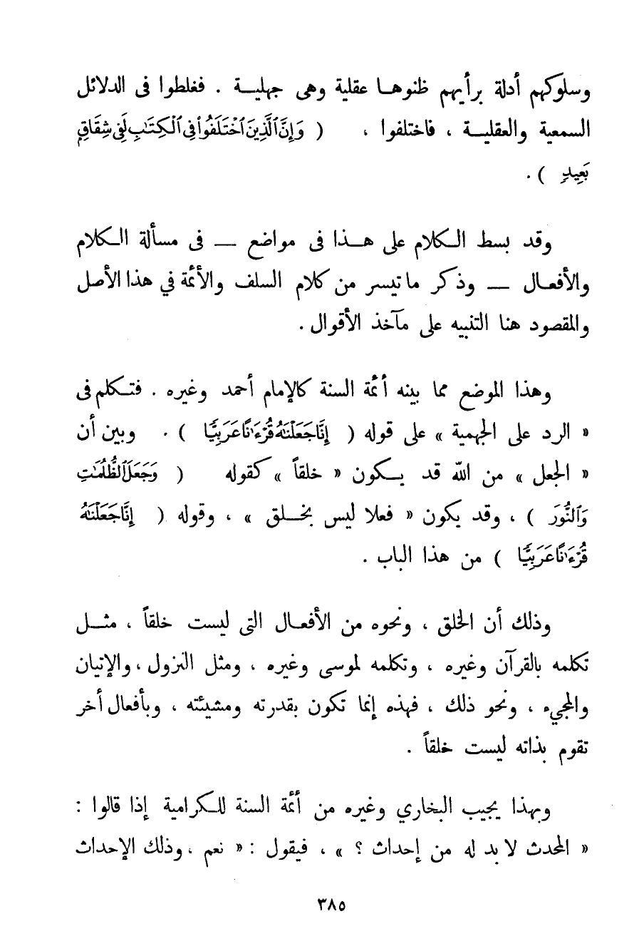 وَسُلُوكِهِمْ أَدِلَّةً بِرَأْيِهِمْ ظَنُّوهَا عَقْلِيَّةً وَهِيَ جهلية. فَغَلِطُوا فِي الدَّلَائِلِ السَّمْعِيَّةِ وَالْعَقْلِيَّةِ فَاخْتَلَفُوا {وَإِنَّ الَّذِينَ اخْتَلَفُوا فِي الْكِتَابِ لَفِي شِقَاقٍ بَعِيدٍ} . وَقَدْ بُسِطَ الْكَلَامُ عَلَى هَذَا فِي مَوَاضِعَ فِي مَسْأَلَةِ الْكَلَامِ وَالْأَفْعَالِ وَذُكِرَ مَا تَيَسَّرَ مِنْ كَلَامِ السَّلَفِ وَالْأَئِمَّةِ فِي هَذَا الْأَصْلِ وَالْمَقْصُودُ هُنَا التَّنْبِيهُ عَلَى مَآخِذَ الْأَقْوَالِ. وَهَذَا الْمَوْضِعُ مِمَّا بَيَّنَهُ أَئِمَّةُ السُّنَّةِ كَالْإِمَامِ أَحْمَد وَغَيْرِهِ. فَتَكَلَّمَ فِي " الرَّدِّ عَلَى الْجَهْمِيَّة " عَلَى قَوْلِهِ {إنَّا جَعَلْنَاهُ قُرْآنًا عَرَبِيًّا} . وَبَيَّنَ أَنْ " الْجَعْلَ " مِنْ اللَّهِ قَدْ يَكُونُ " خَلْقًا " كَقَوْلِهِ {وَجَعَلَ الظُّلُمَاتِ وَالنُّورَ} وَقَدْ يَكُونُ " فِعْلًا لَيْسَ بِخَلْقِ " وَقَوْلِهِ {إنَّا جَعَلْنَاهُ قُرْآنًا عَرَبِيًّا} مِنْ هَذَا الْبَابِ. وَذَلِكَ أَنَّ الْخَلْقَ وَنَحْوَهُ مِنْ الْأَفْعَالِ الَّتِي لَيْسَتْ خَلْقًا مِثْلُ تَكَلُّمِهِ بِالْقُرْآنِ وَغَيْرِهِ وَتَكَلُّمِهِ لِمُوسَى وَغَيْرِهِ وَمِثْلُ النُّزُولِ وَالْإِتْيَانِ وَالْمَجِيءِ وَنَحْوِ ذَلِكَ فَهَذِهِ إنَّمَا تَكُونُ بِقُدْرَتِهِ وَمَشِيئَتِهِ وَبِأَفْعَالِ أُخَرٍ تَقُومُ بِذَاتِهِ لَيْسَتْ خَلْقًا. وَبِهَذَا يُجِيبُ الْبُخَارِيُّ وَغَيْرُهُ مِنْ أَئِمَّةِ السُّنَّةِ للكرامية إذَا قَالُوا: " الْمُحْدَثُ لَا بُدَّ لَهُ مِنْ إحْدَاثٍ؟ " فَيَقُولُ: " نَعَمْ وَذَلِكَ الْإِحْدَاثُ